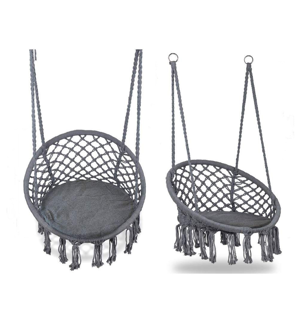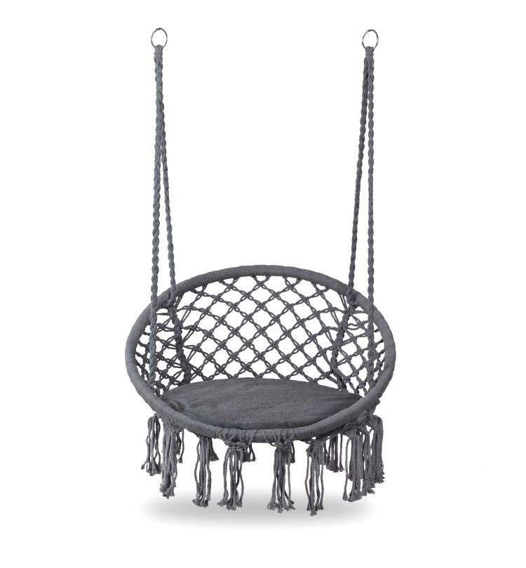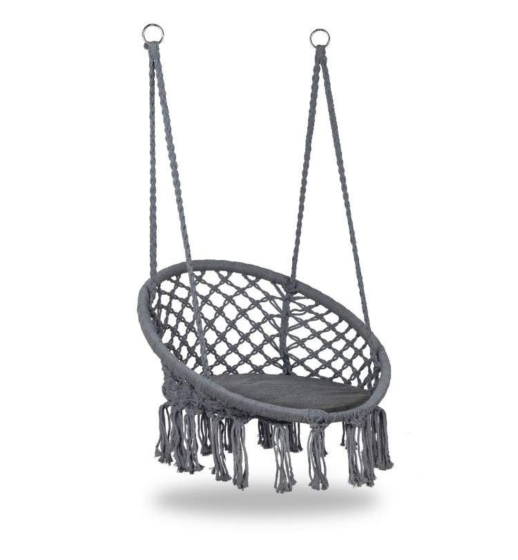 The seat part is attached with stable metal rings, so the chair can be hung almost anywhere. The seat part is made of strong braided rope.