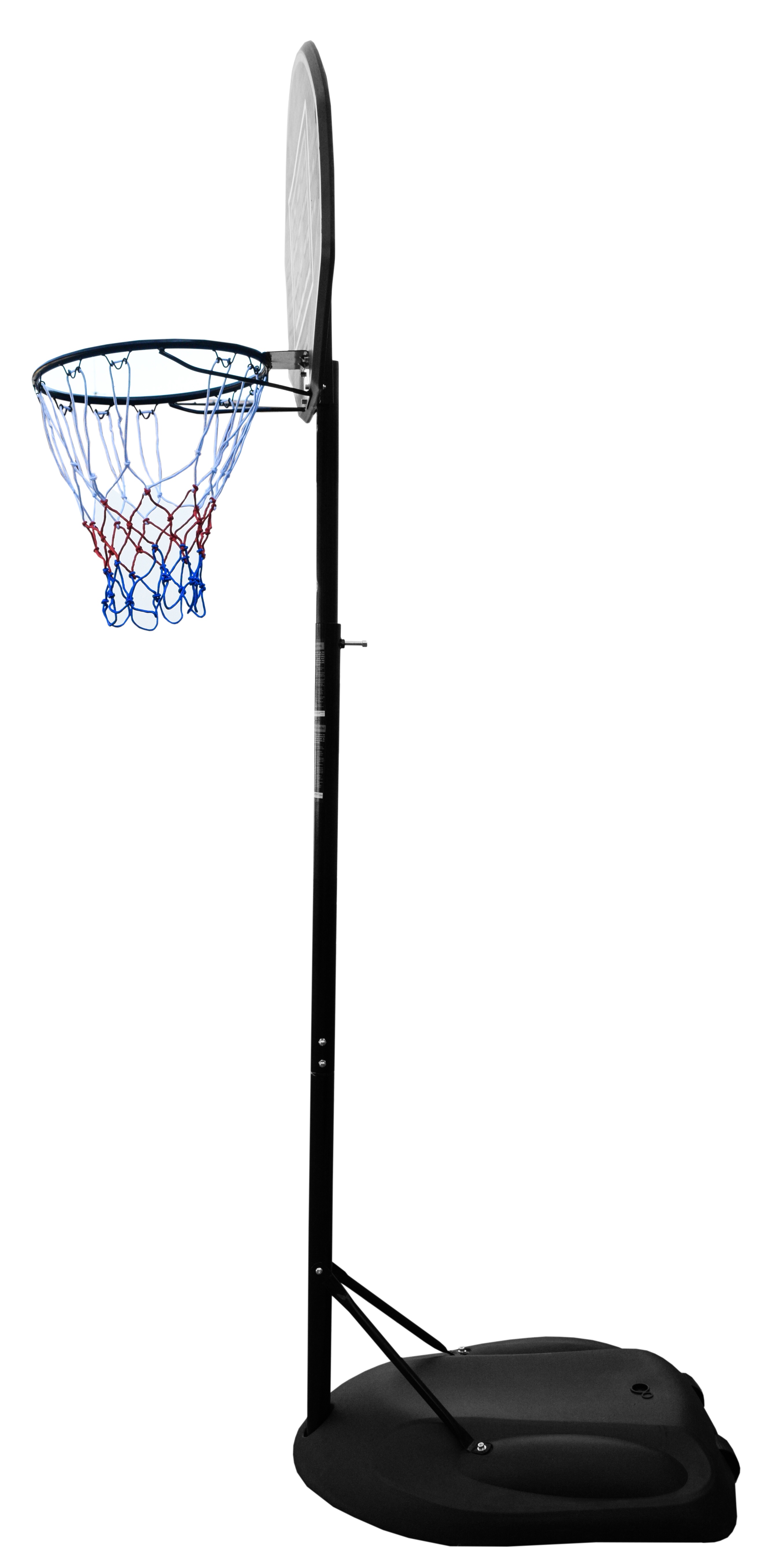 Mobile basketball hoop with adjustable height, sturdy plastic backboard, and rim with net.