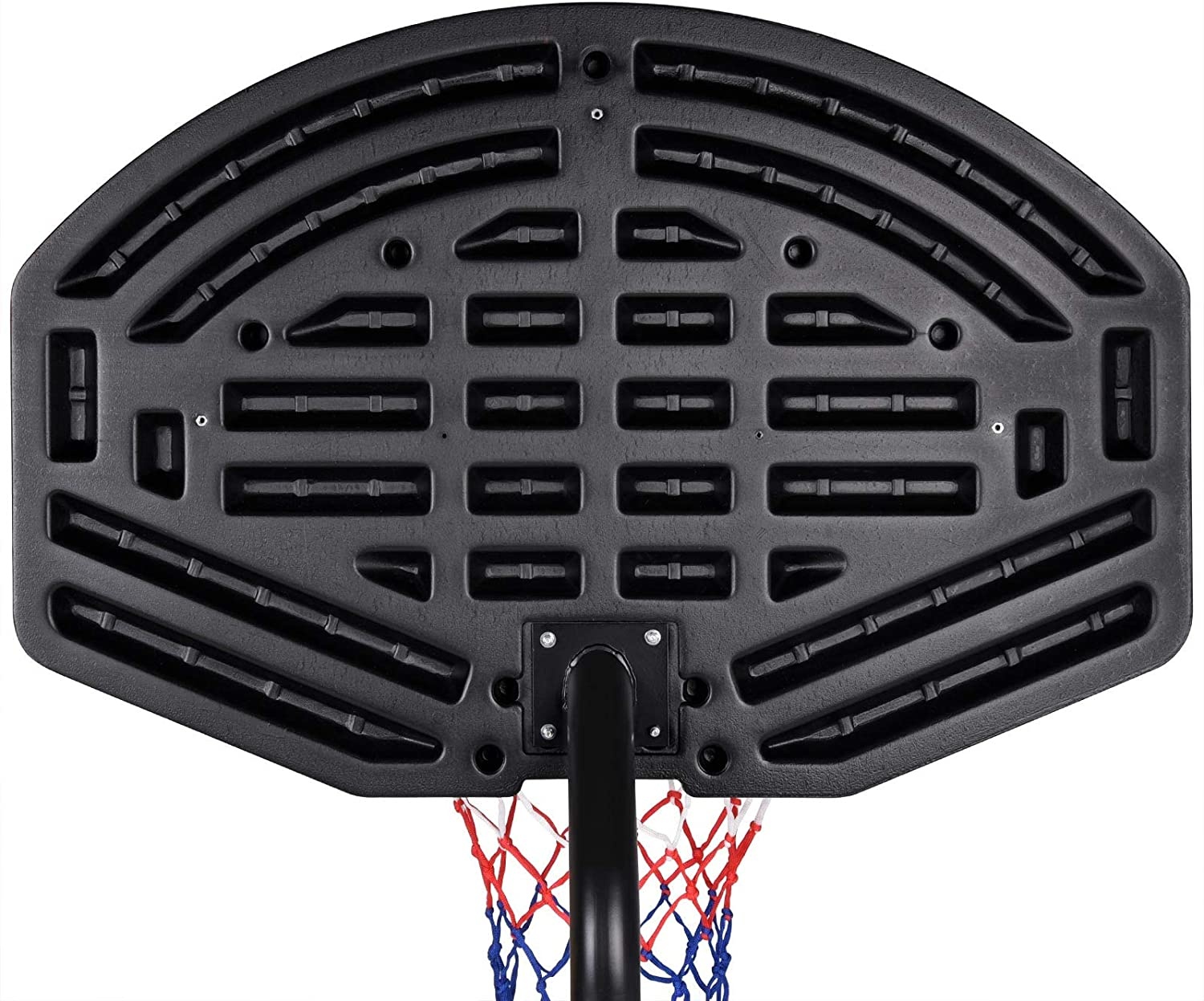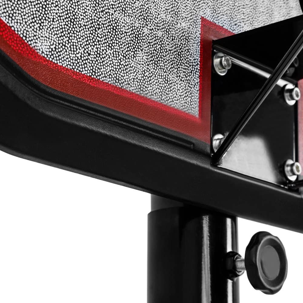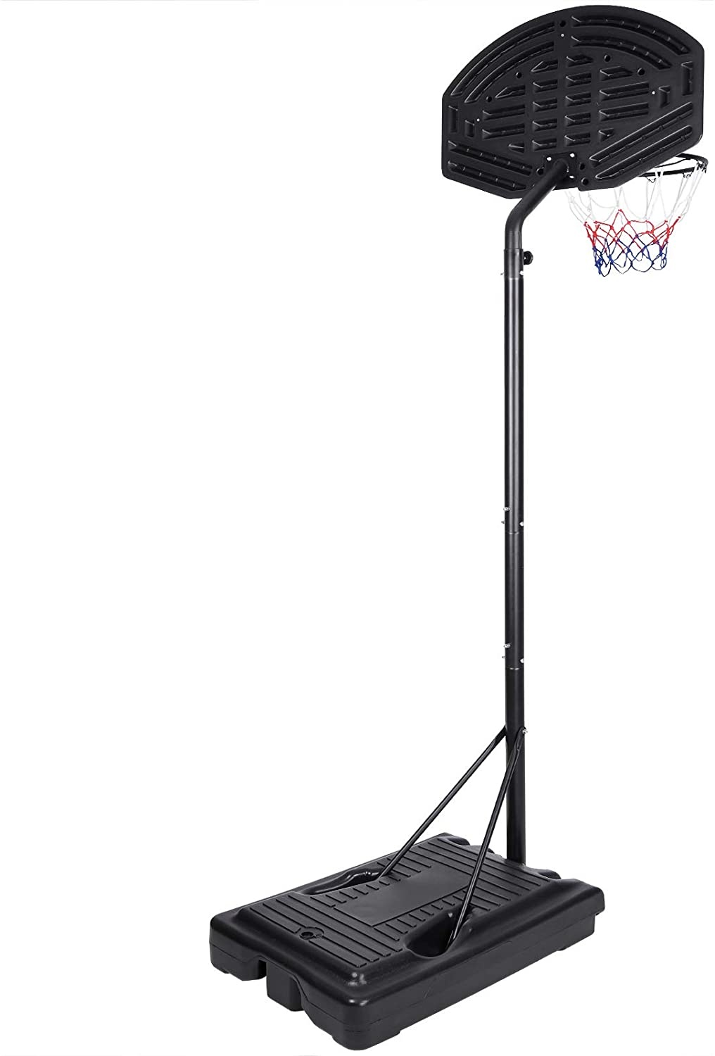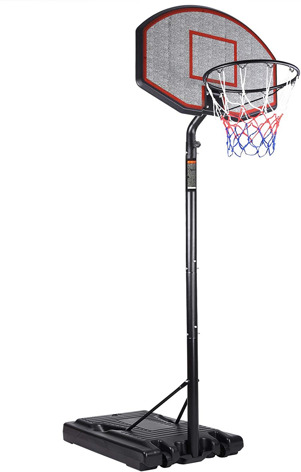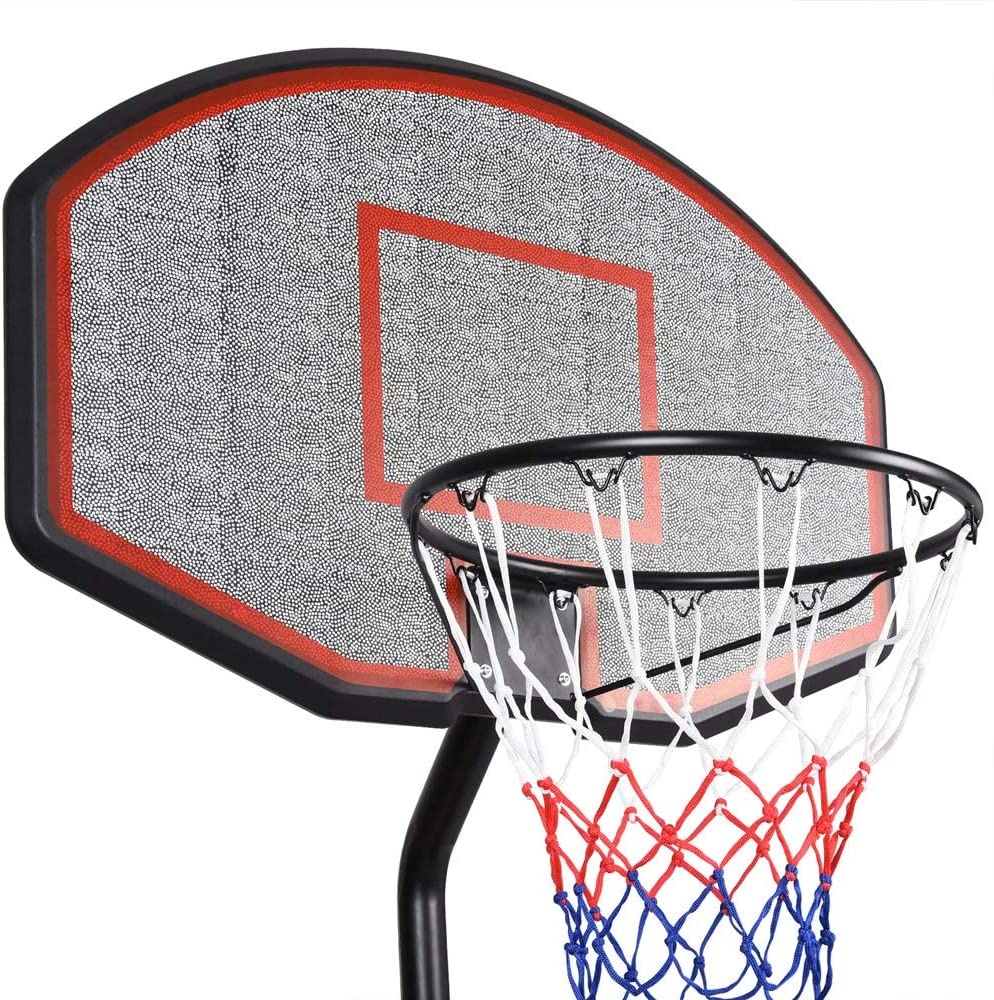 Mobile basketball hoop with adjustable height, sturdy plastic backboard, and rim with net.