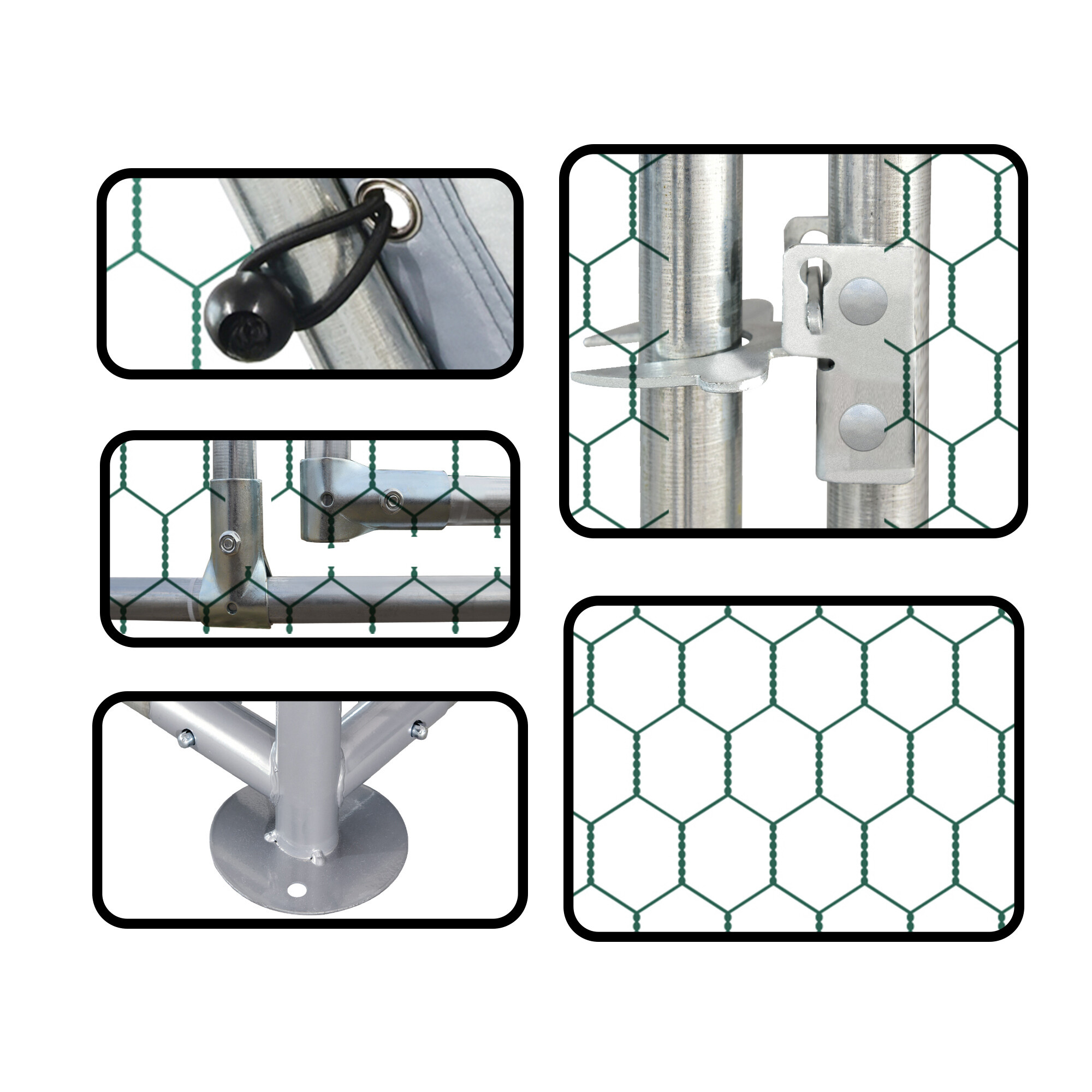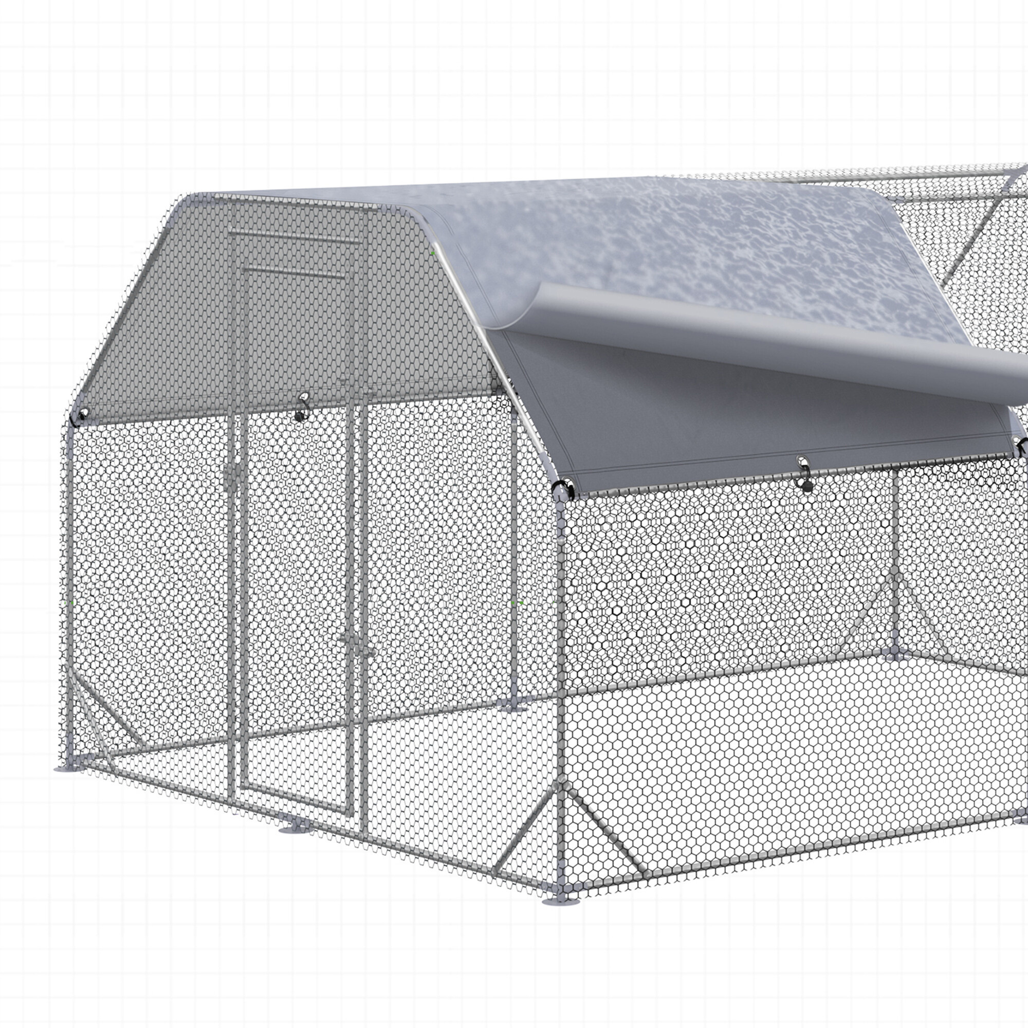 Cage made from strong silver galvanized steel, which provides the run with proper stability and prevents unwanted injuries, such as your poultry escaping. The construction is complemented by a green galvanized mesh and a roof made of gray PVC tarpaulin.