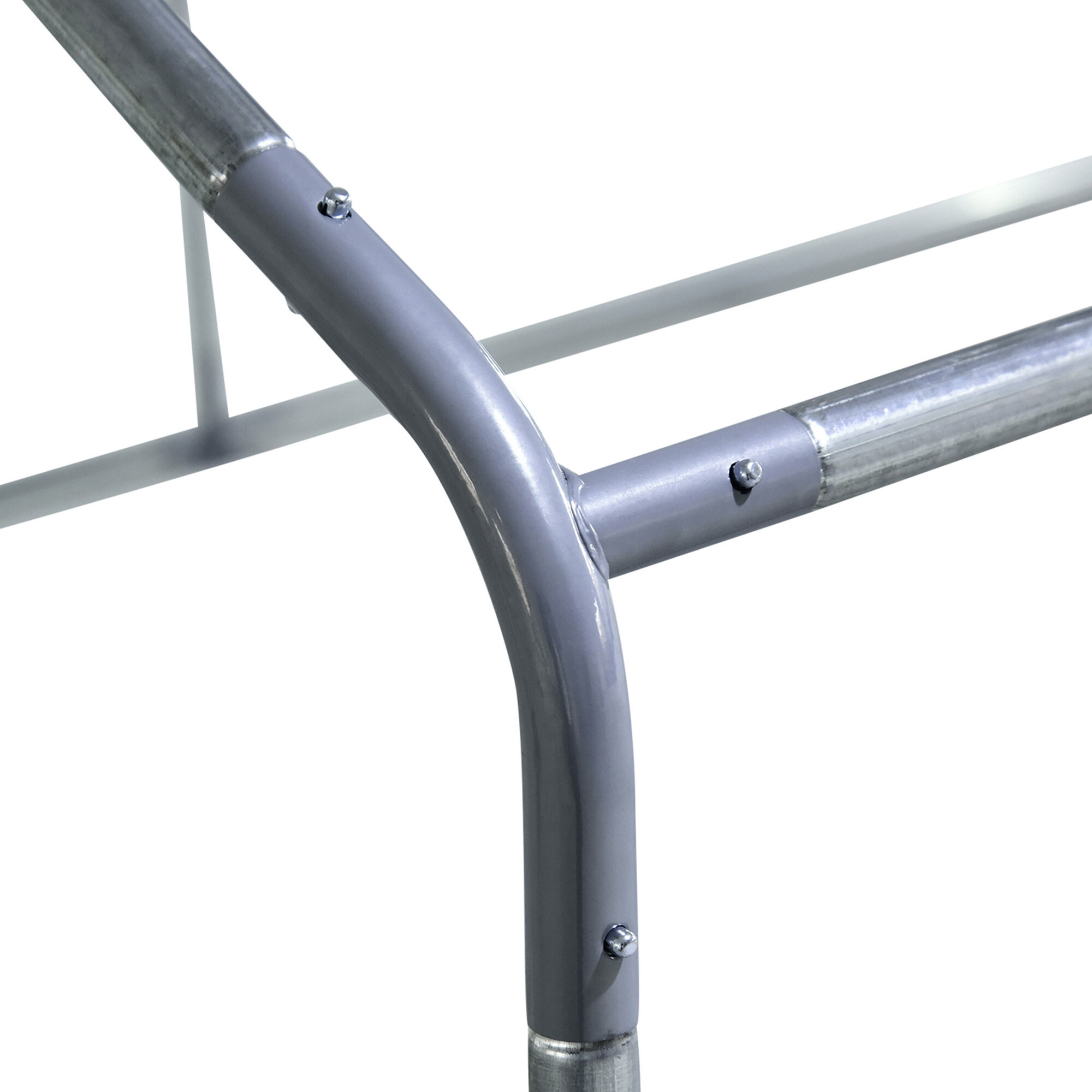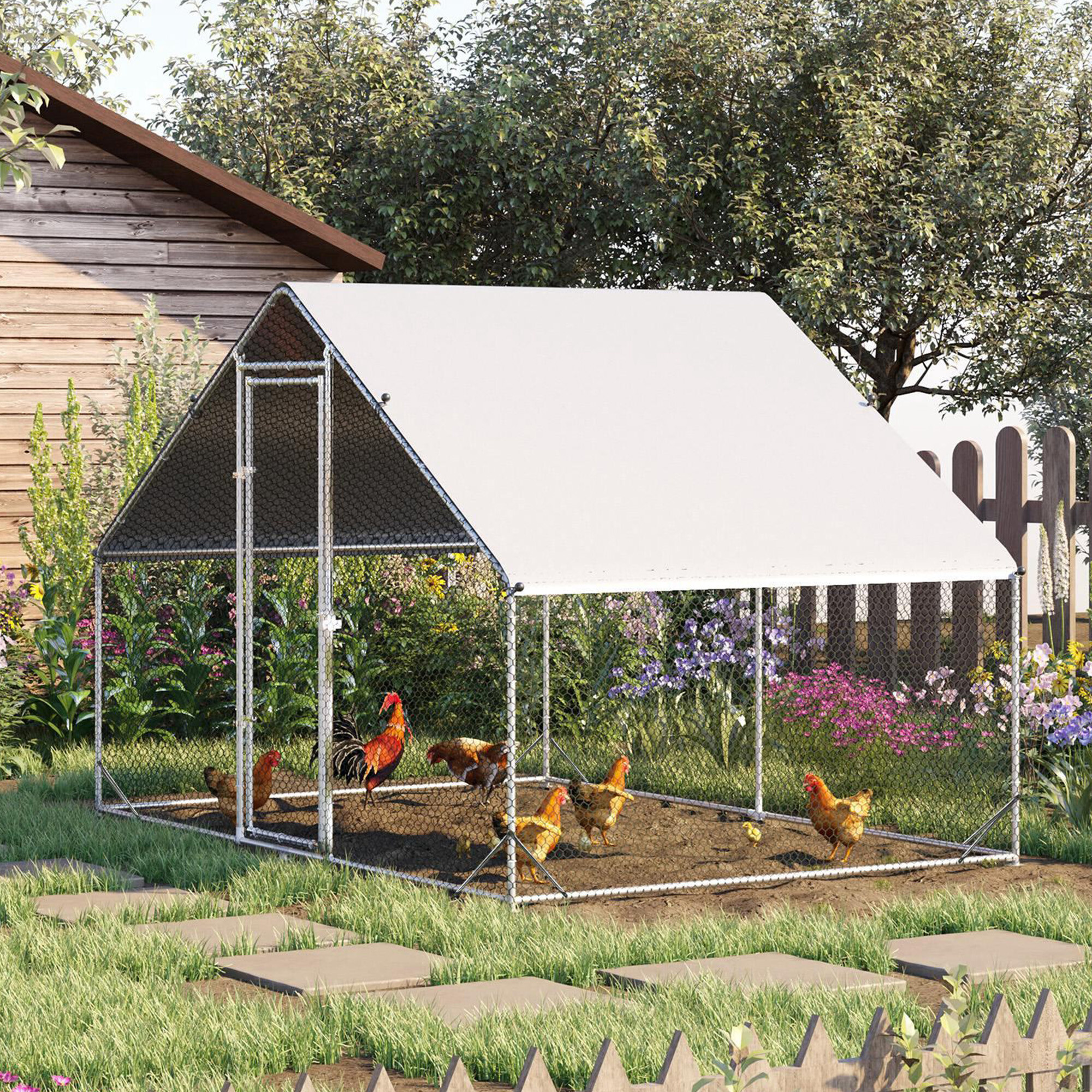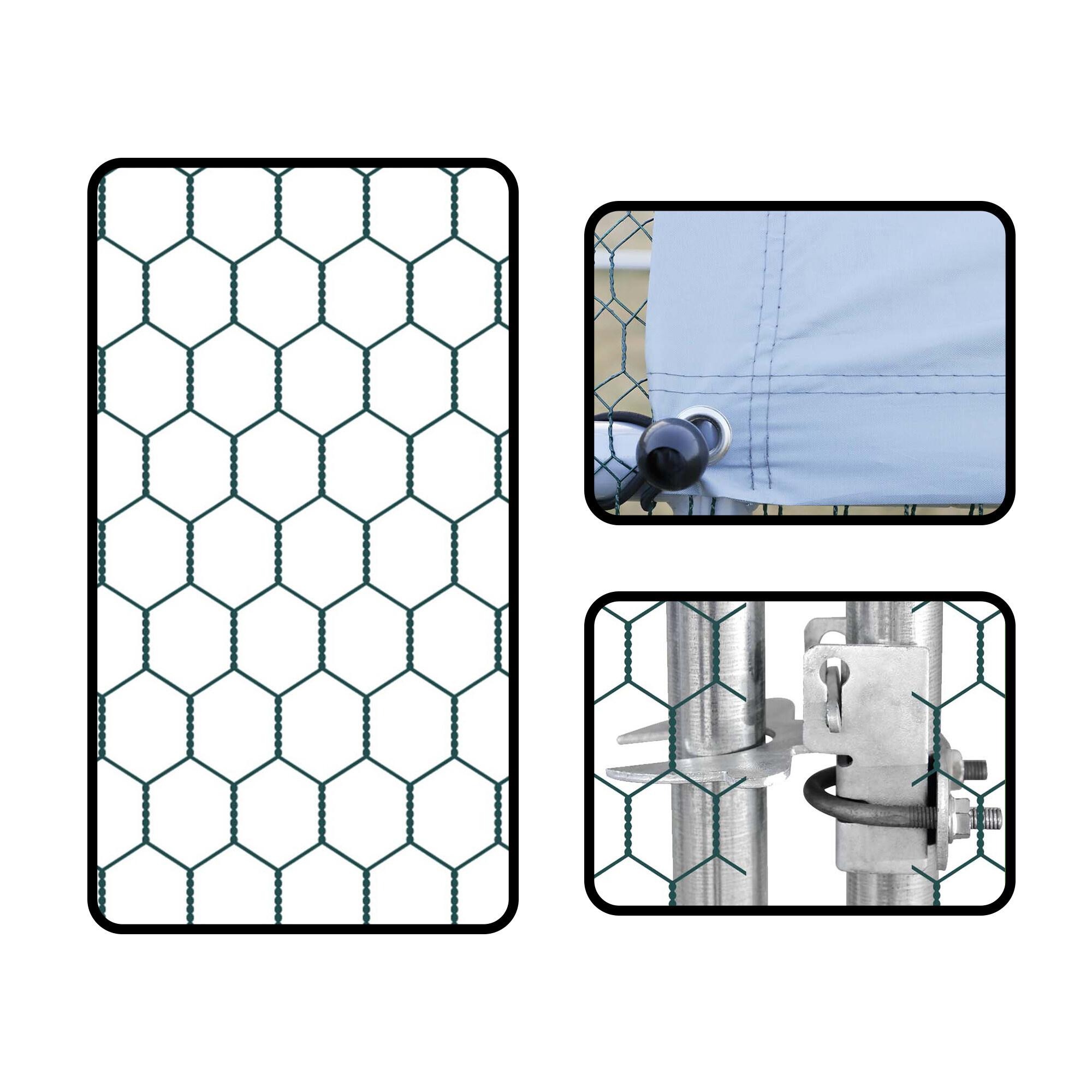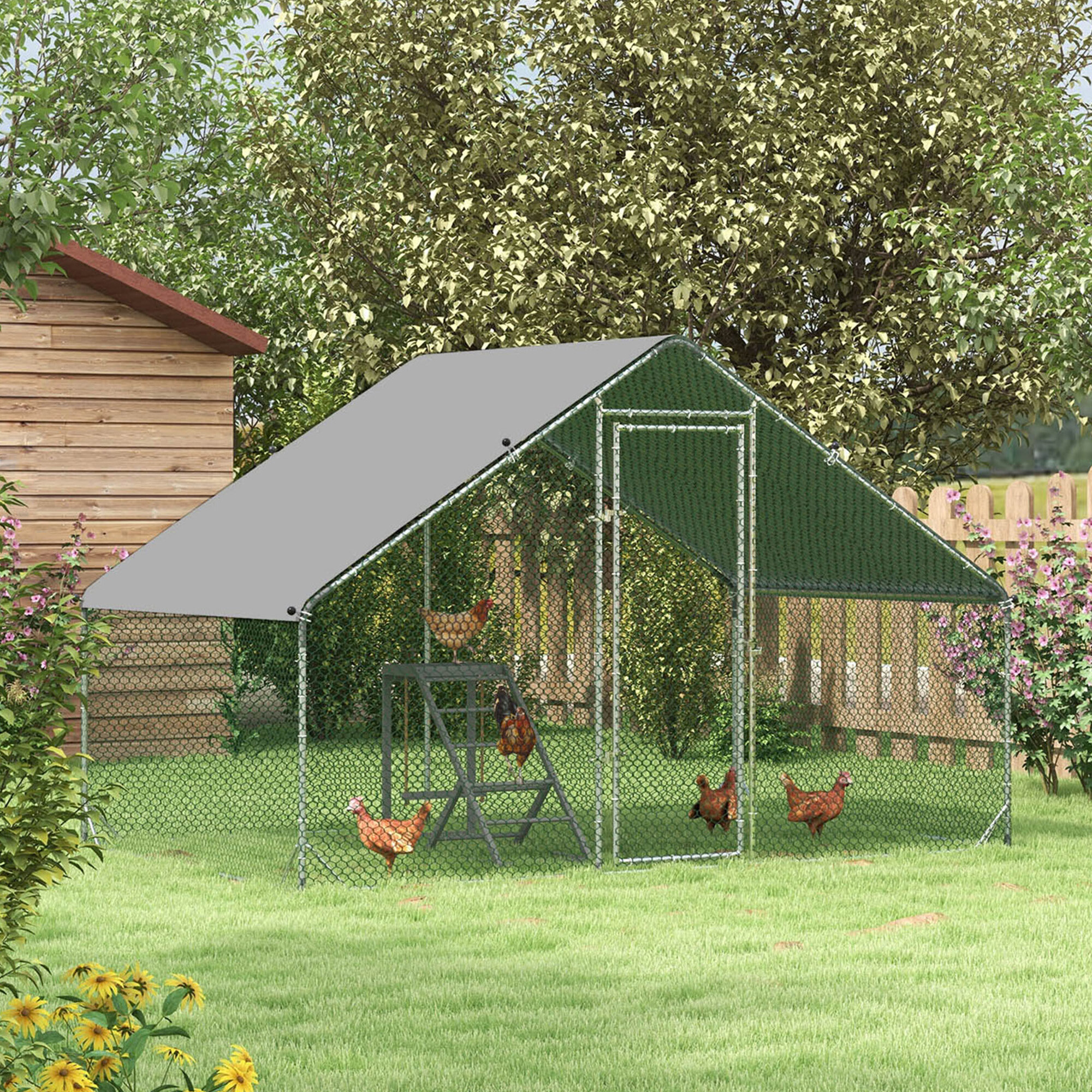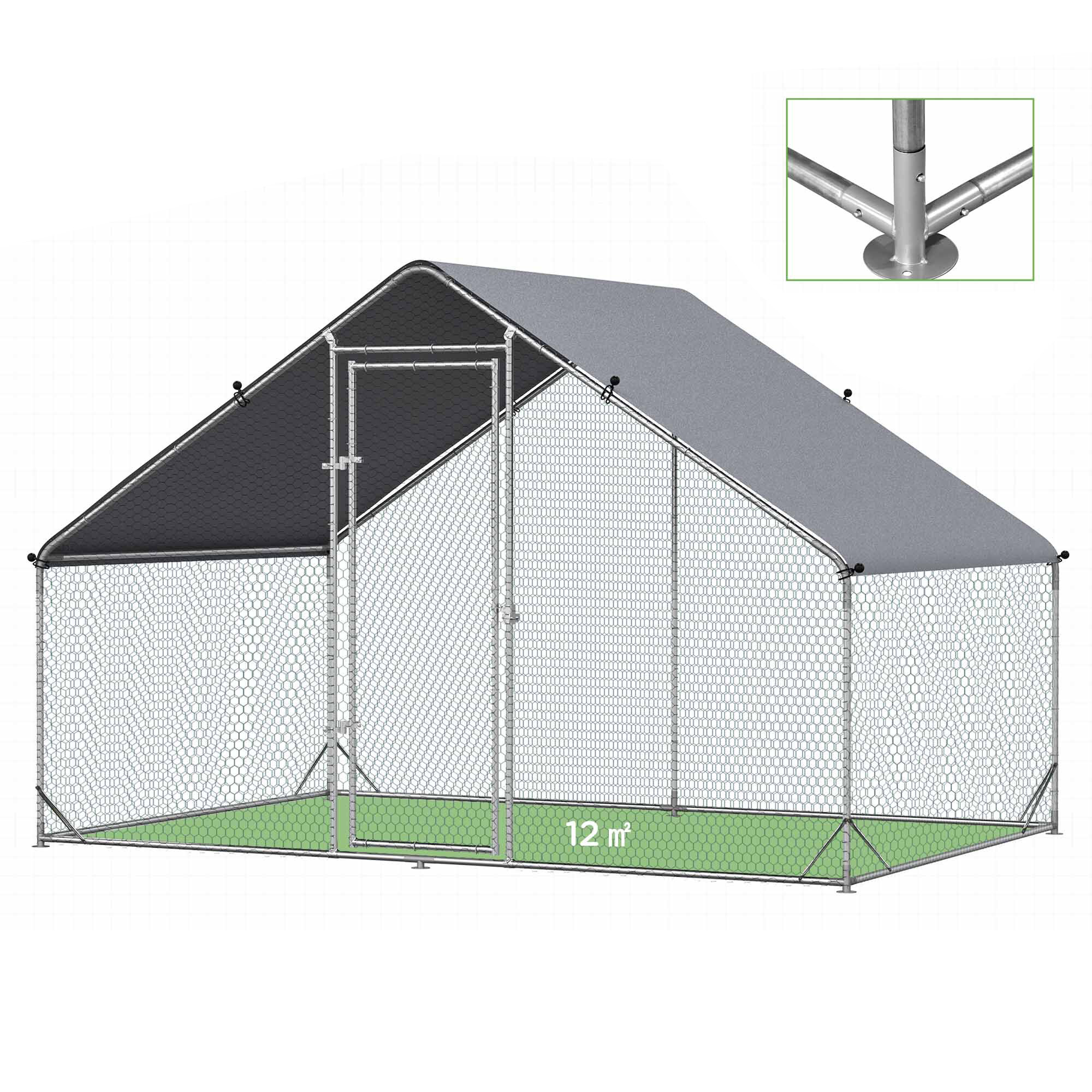 Cage made from strong silver galvanized steel, which provides the run with proper stability and prevents unwanted injuries, such as your poultry escaping. The construction is complemented by a green galvanized mesh and a roof made of a gray PVC tarp.