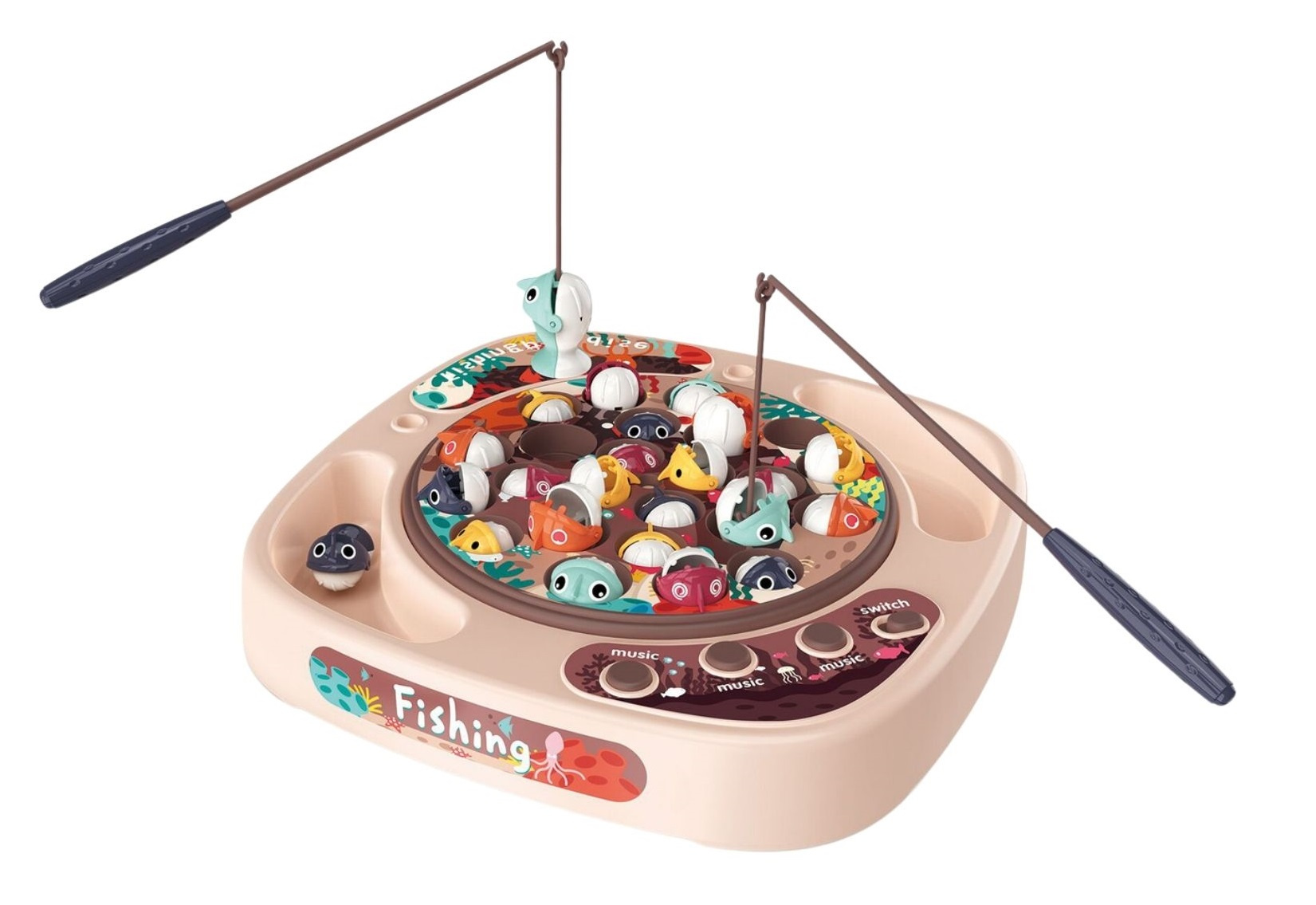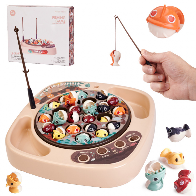 - The fish wheel spins to the rhythm of cheerful music.