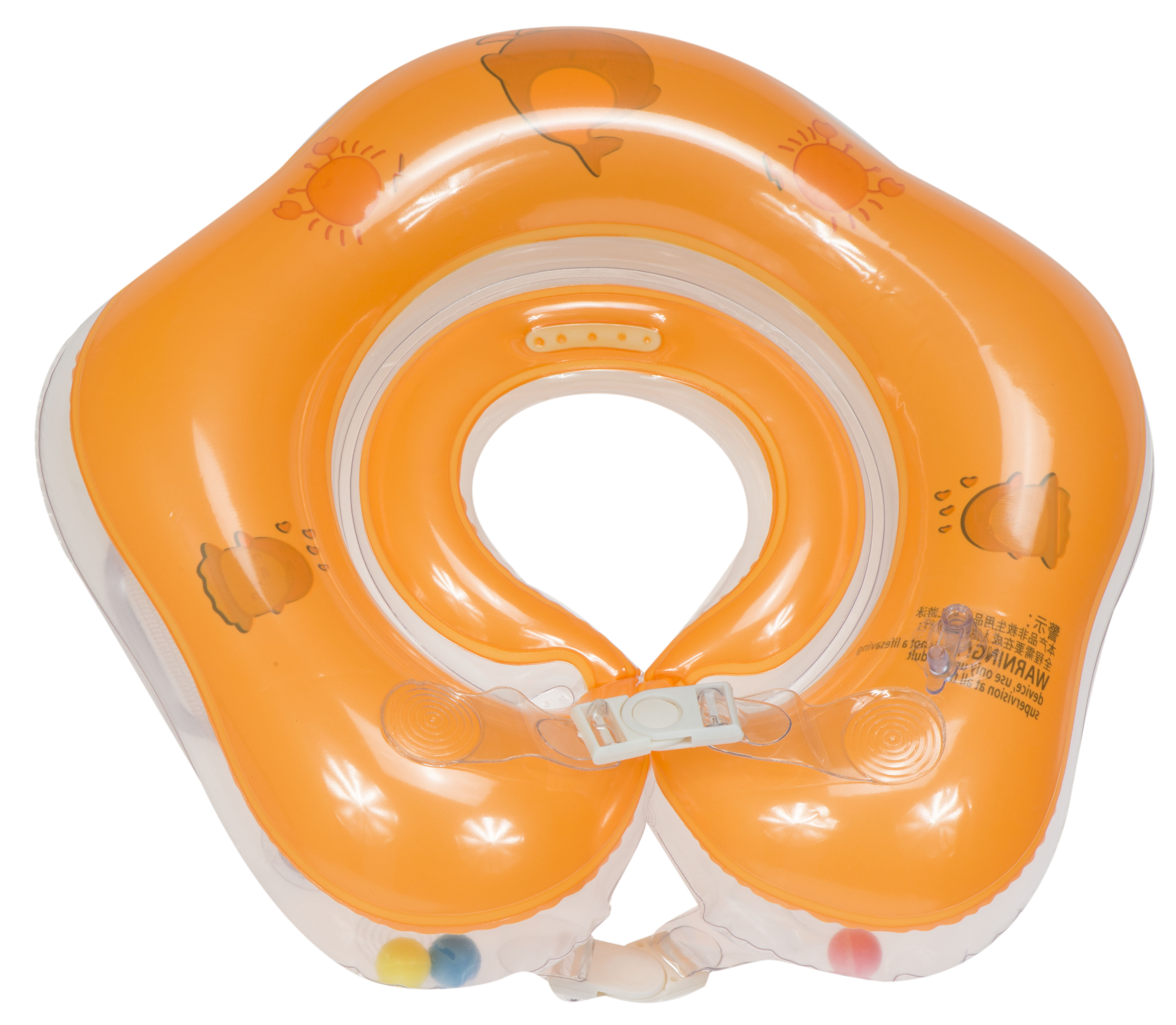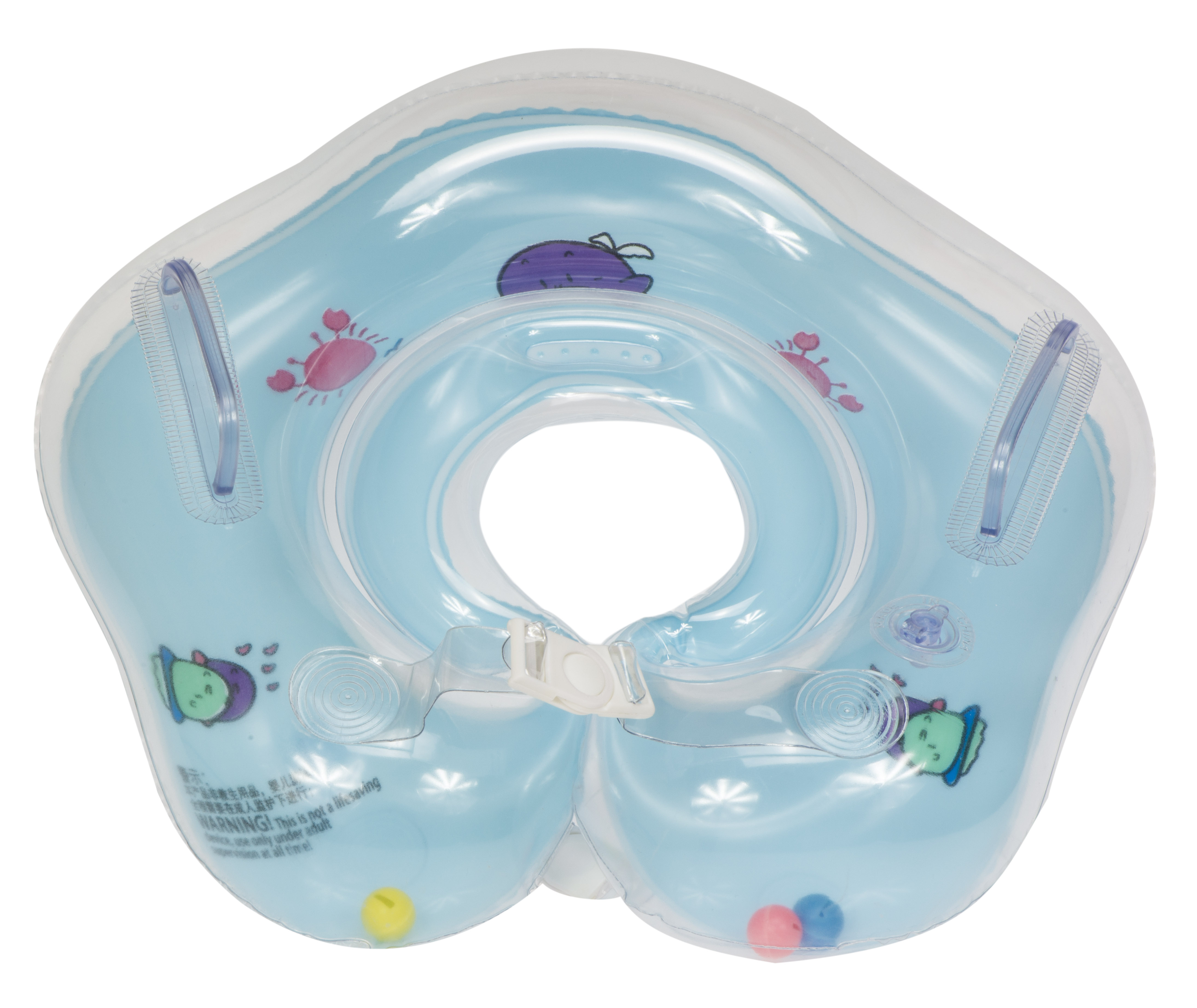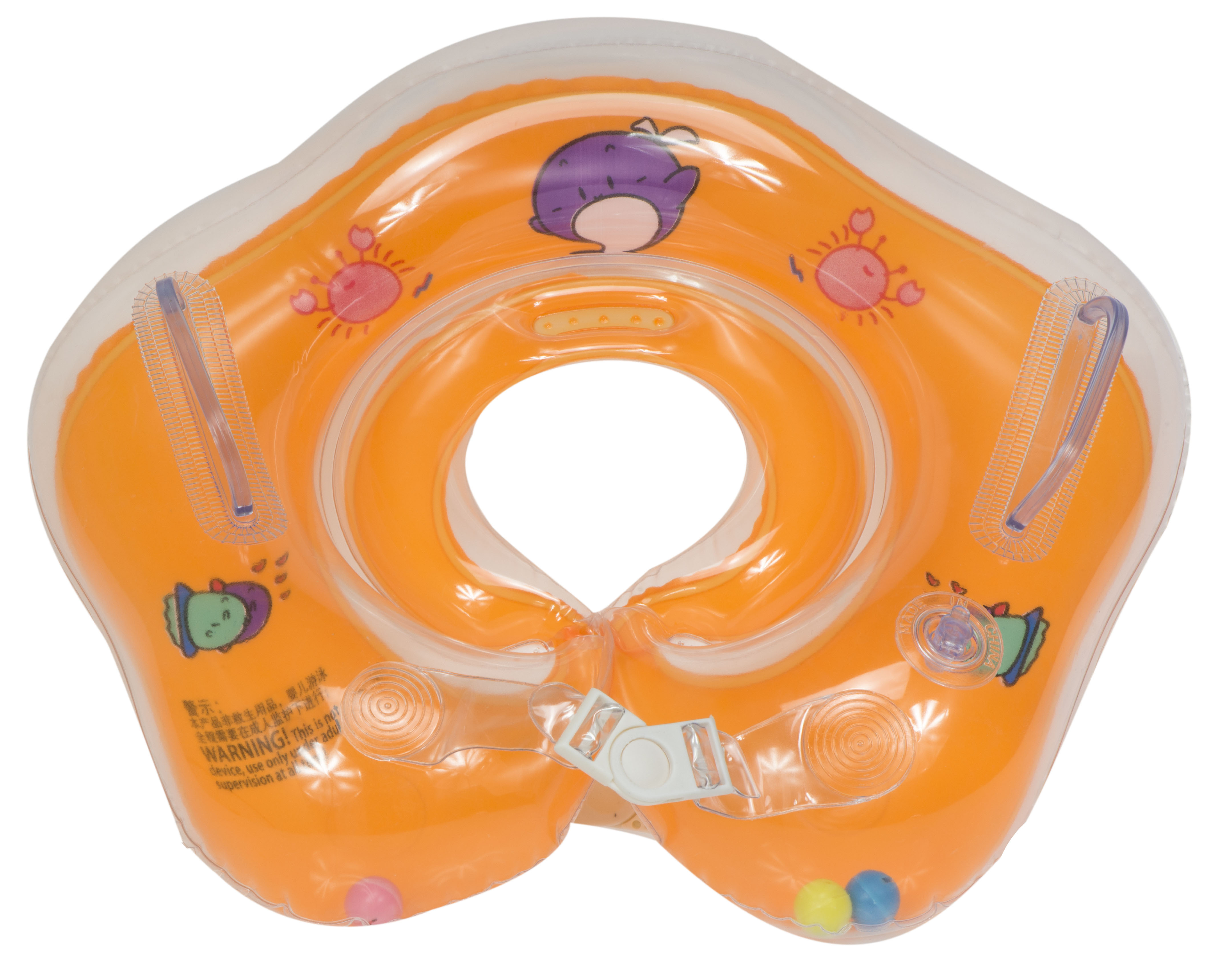 It is ideal for learning to swim.Fastens with two adjustable snaps. The collar has 2 handles and inside are three rattling balls. For increased safety, the wheel is equipped with 2 independent chambers.