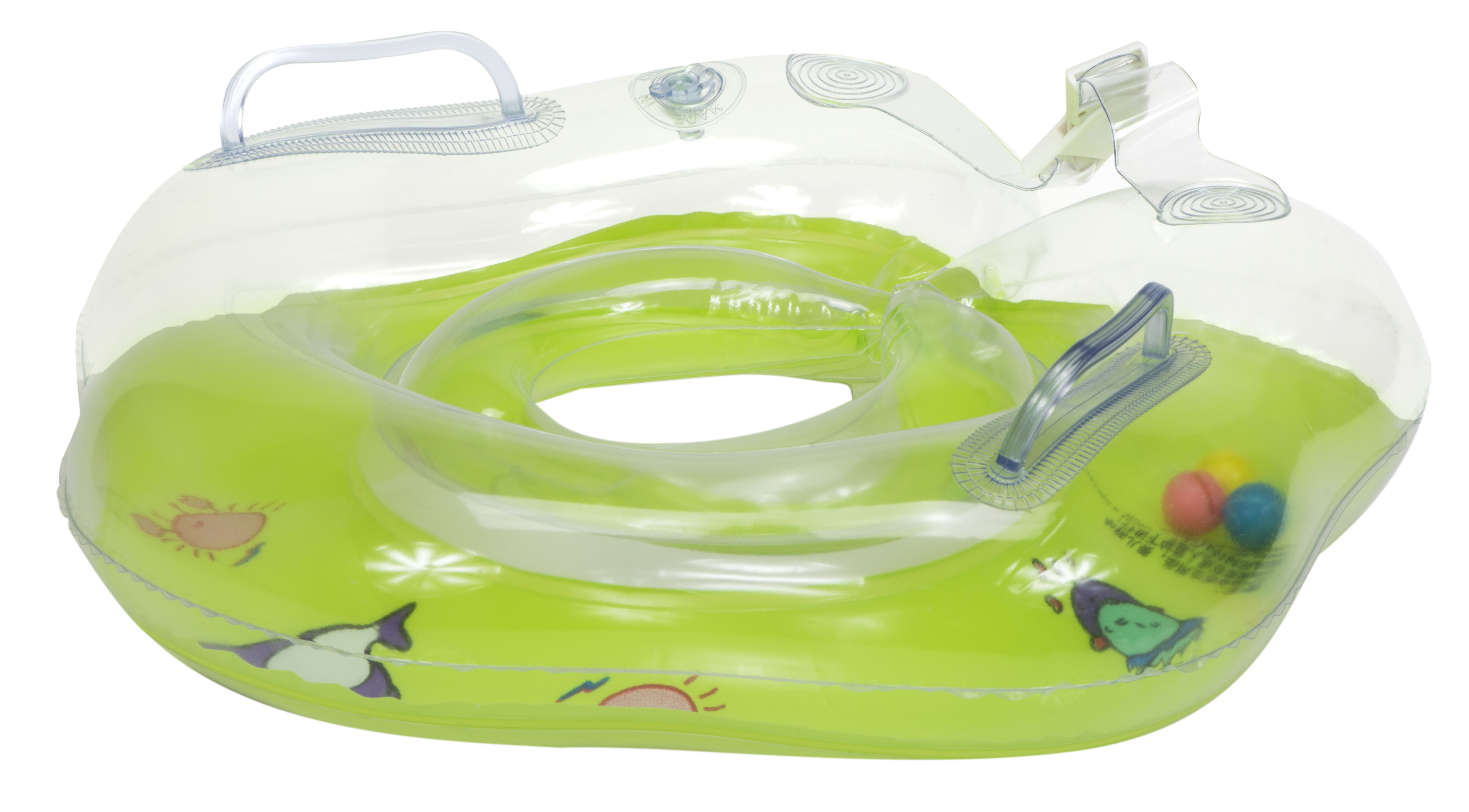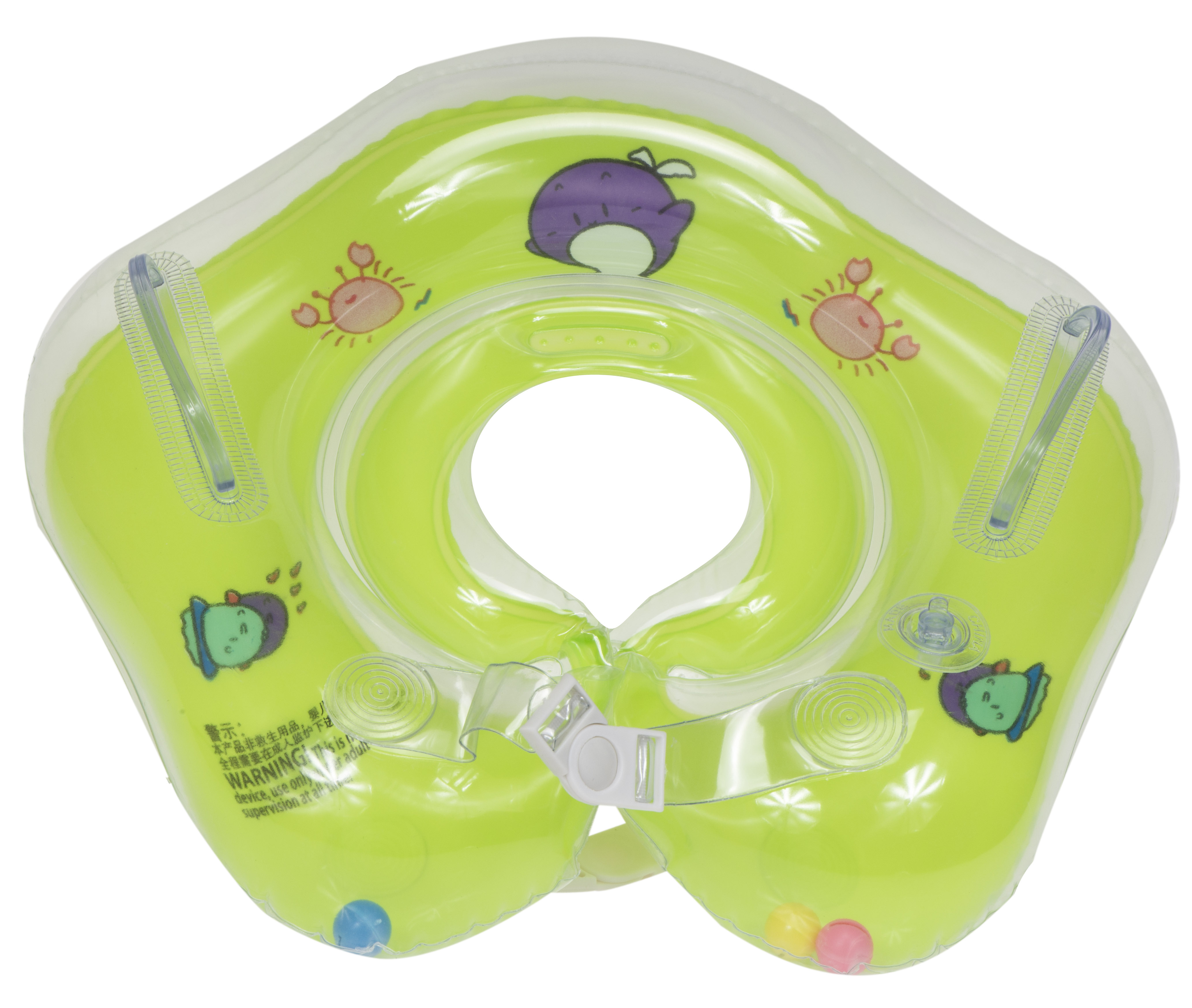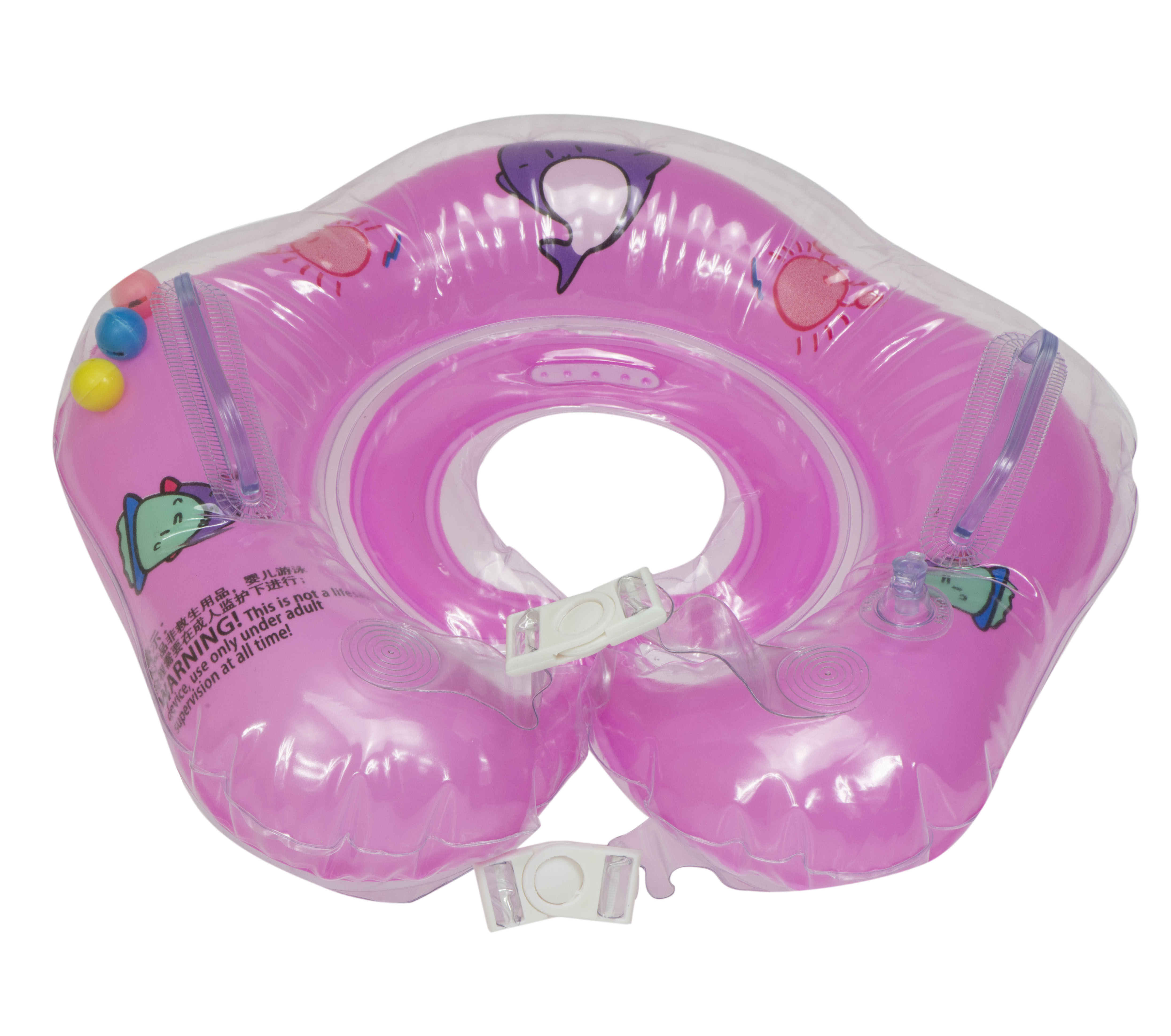 It is ideal for learning to swim.Fastens with two adjustable snaps. The collar has 2 handles and inside are three rattling balls. For increased safety, the wheel is equipped with 2 independent chambers.