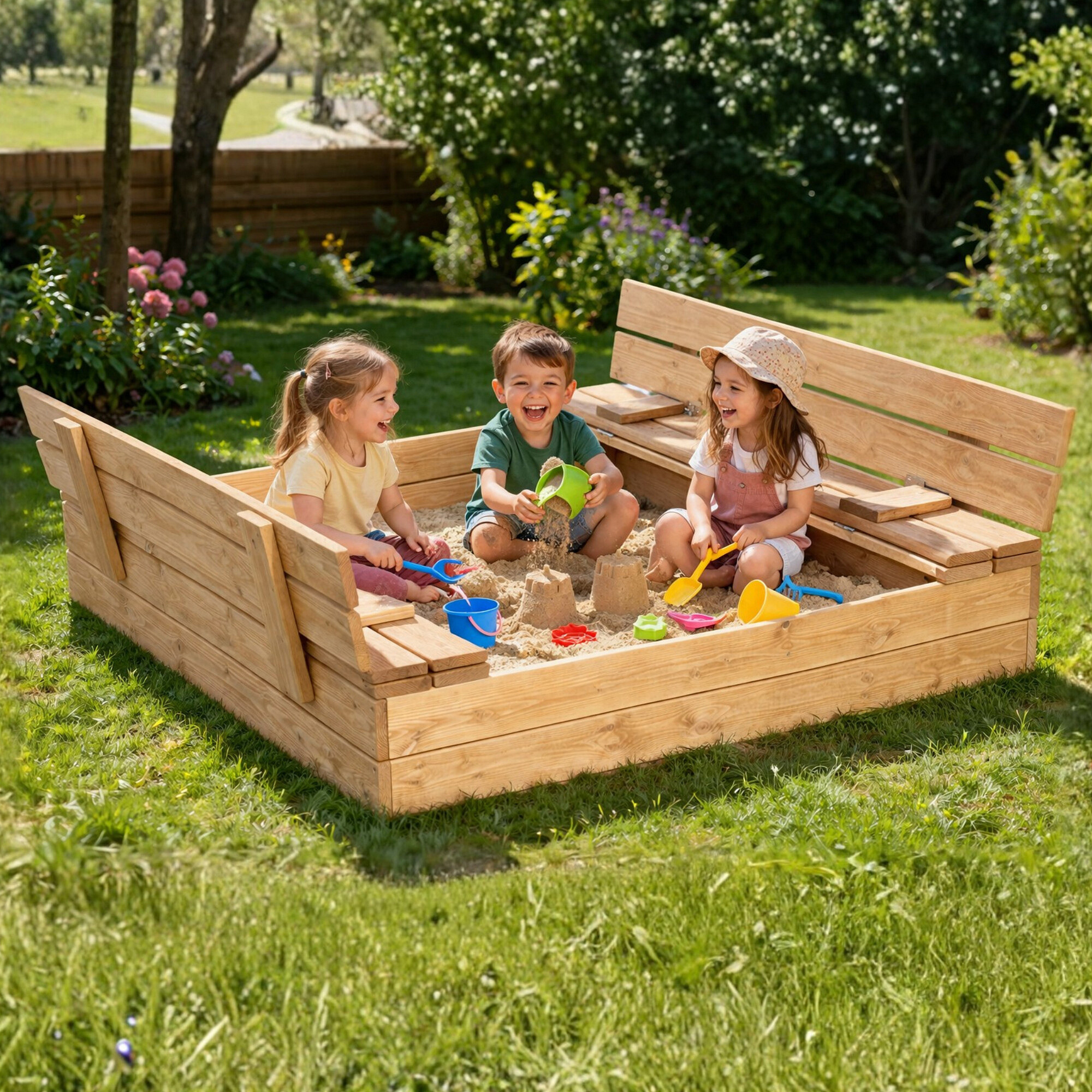 A major advantage is the practical protective cover, which protects the sand from dirt, rain, and animals. When opened, the lid easily transforms into comfortable benches where children can sit during play.