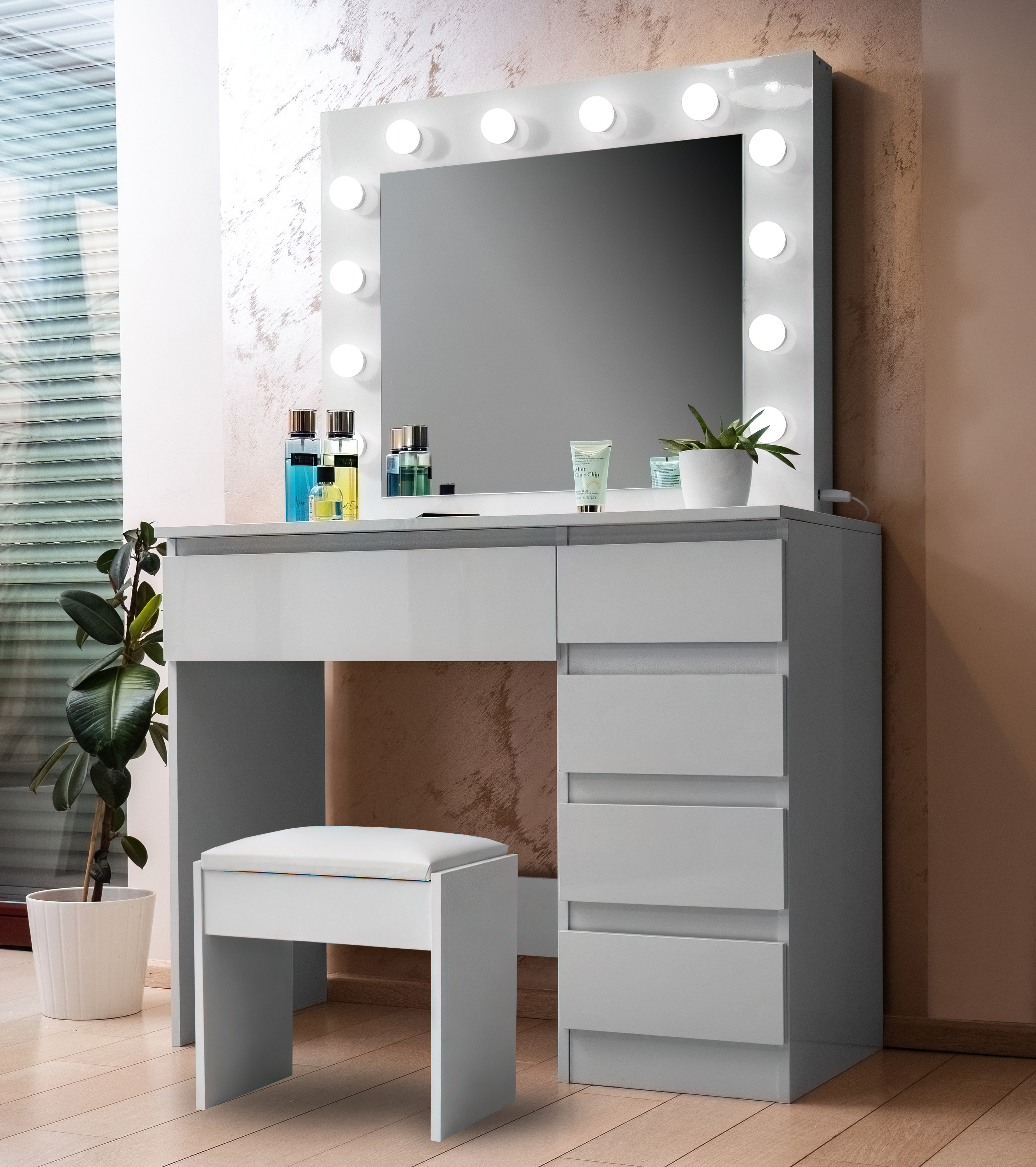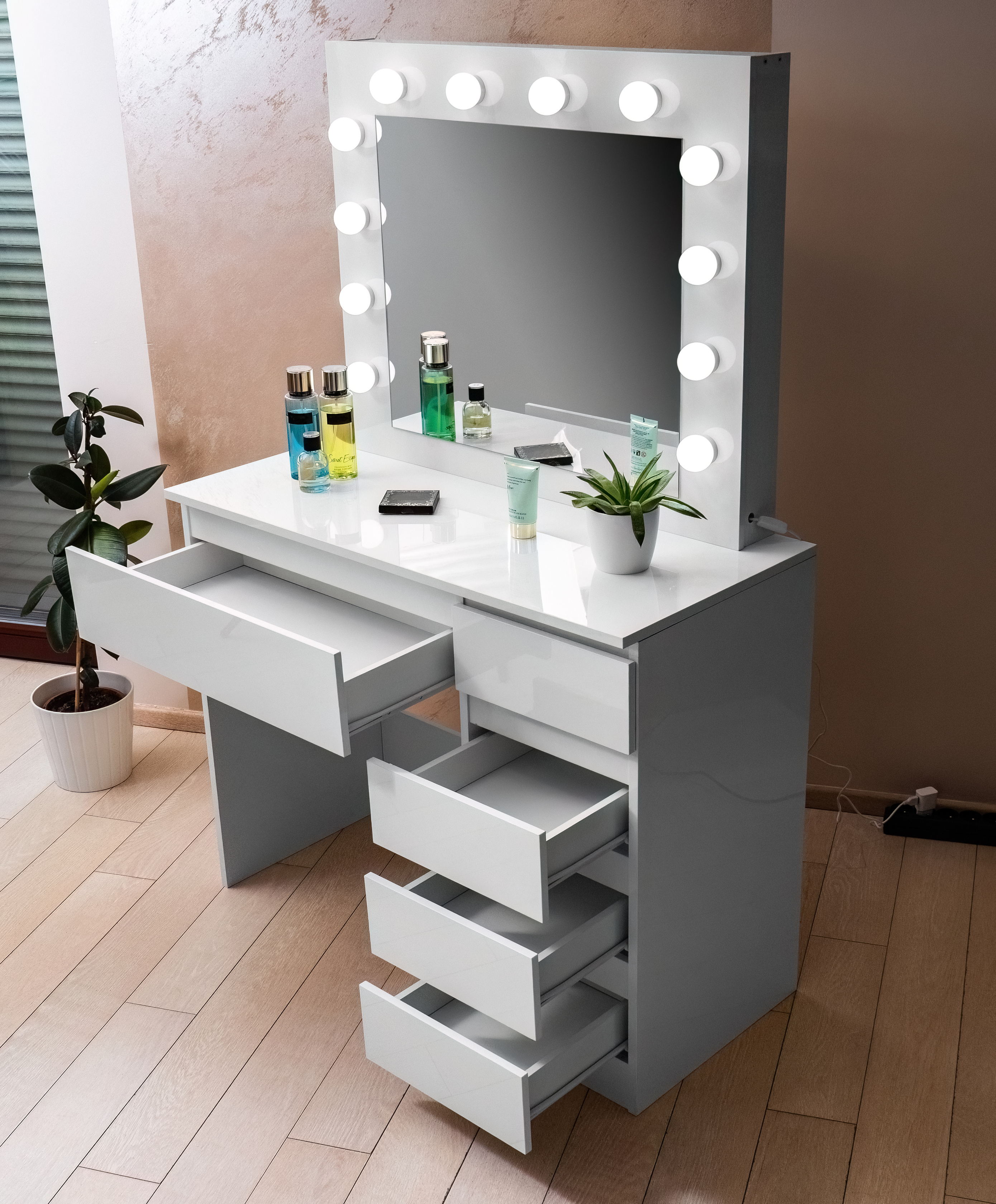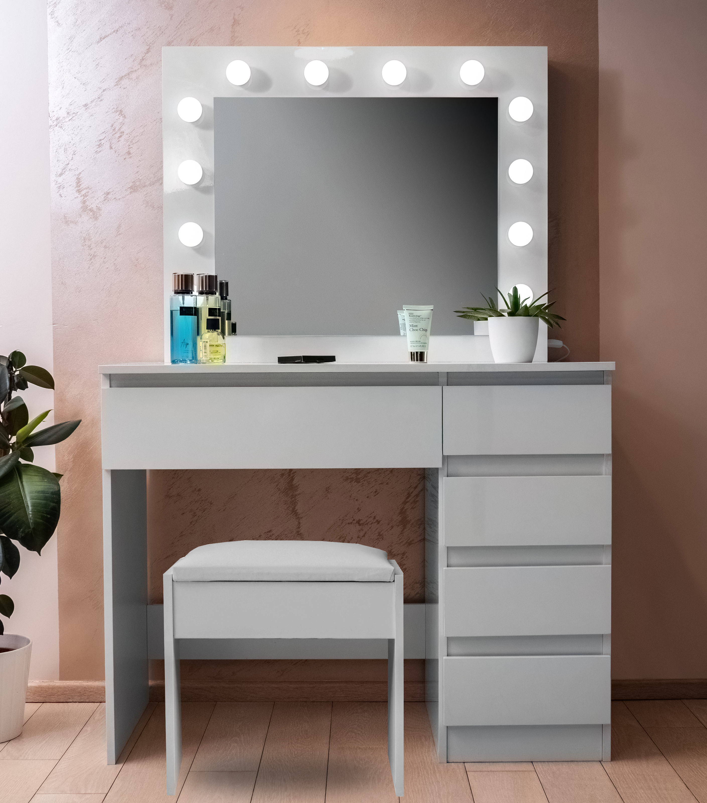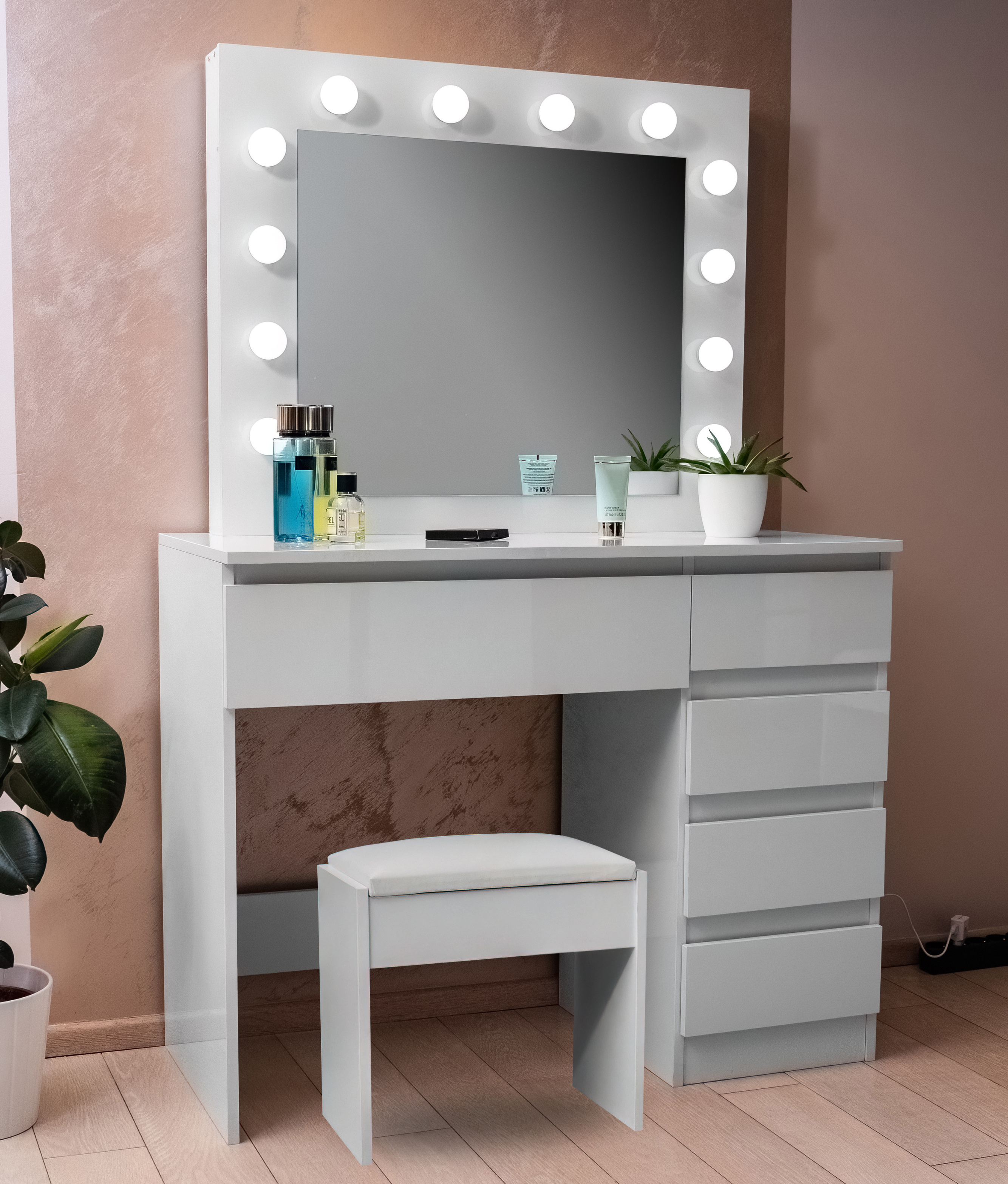 You will definitely appreciate the 5 spacious drawers, where you can comfortably store all your cosmetic tools, jewelry, and other accessories.