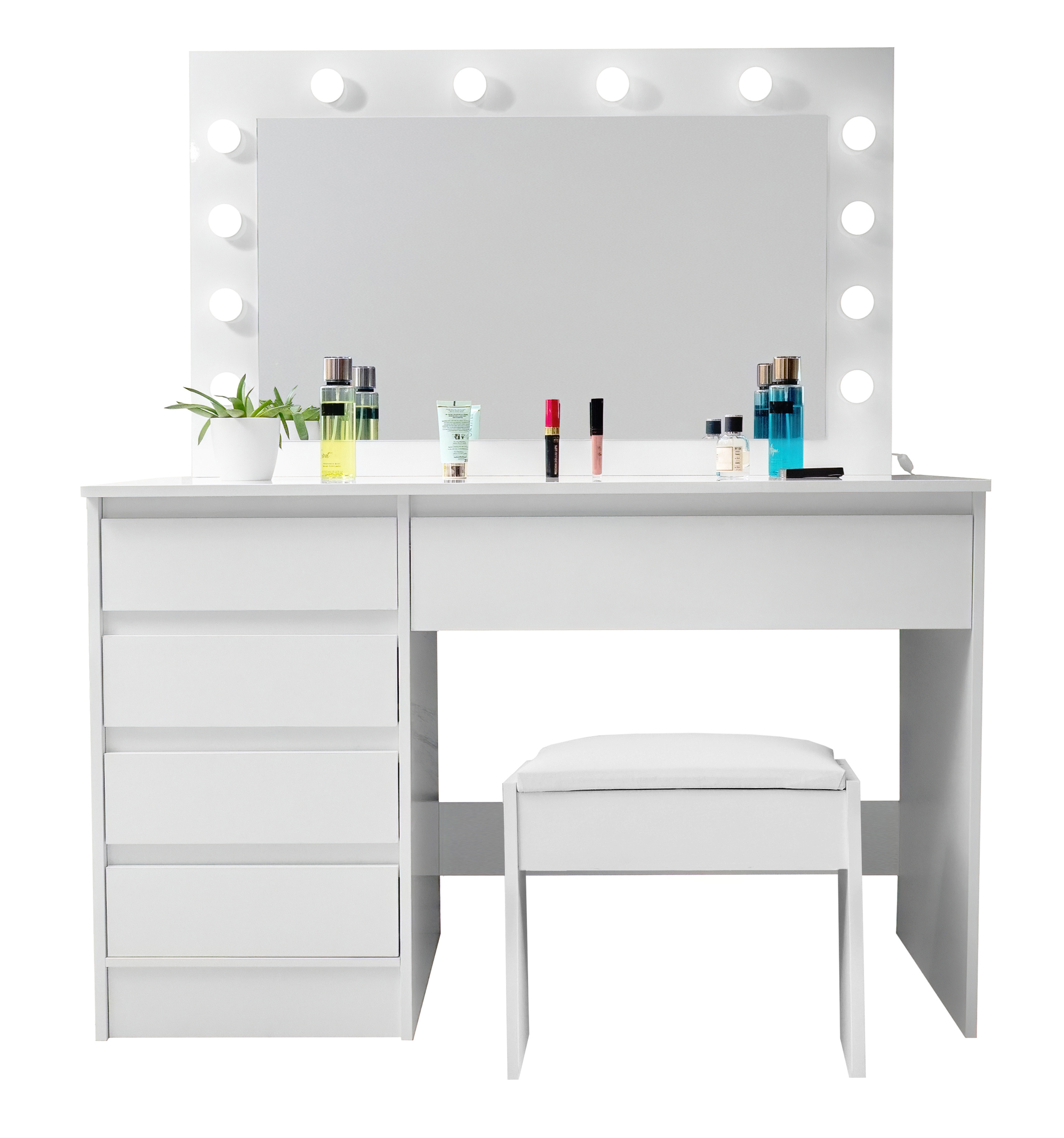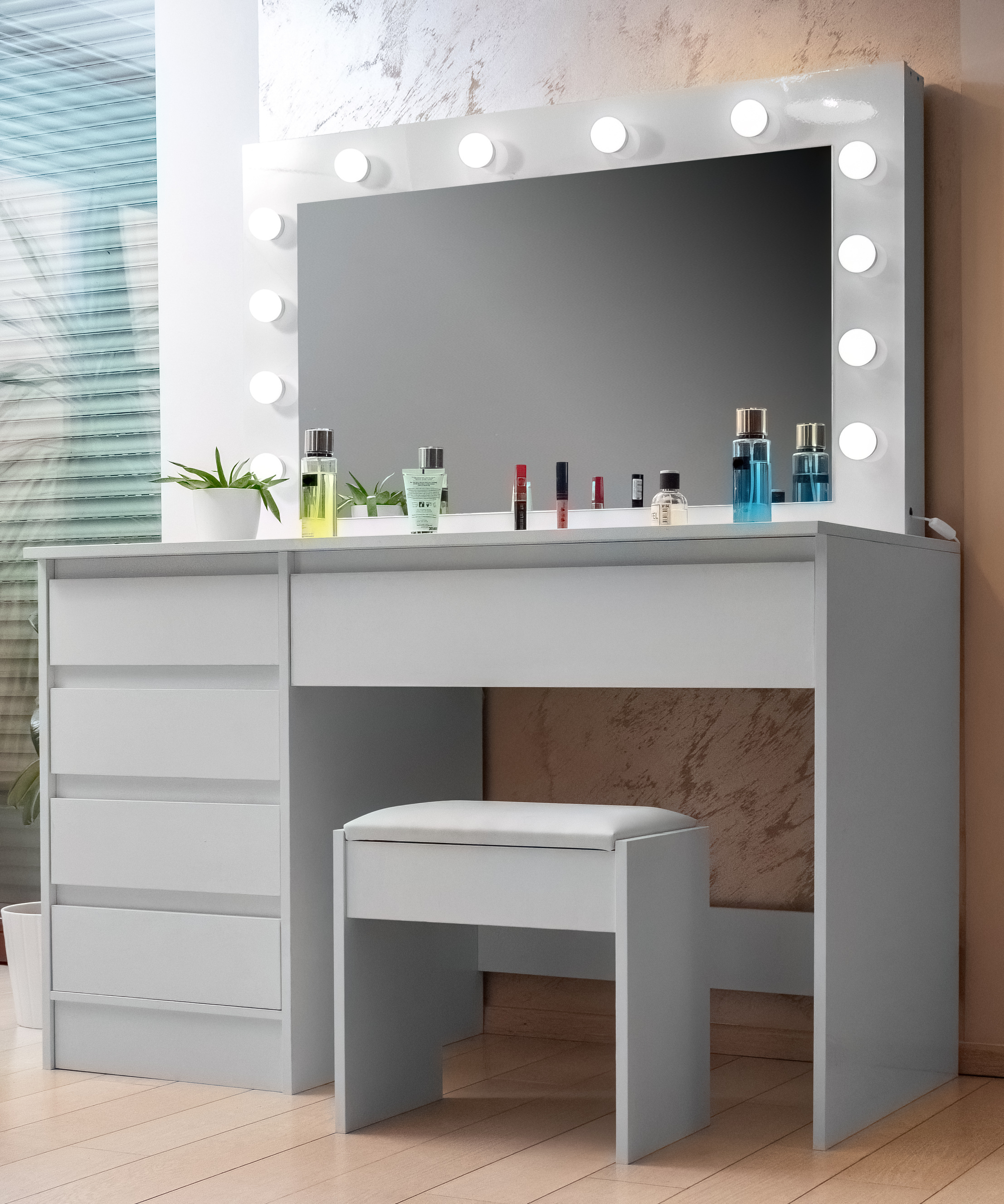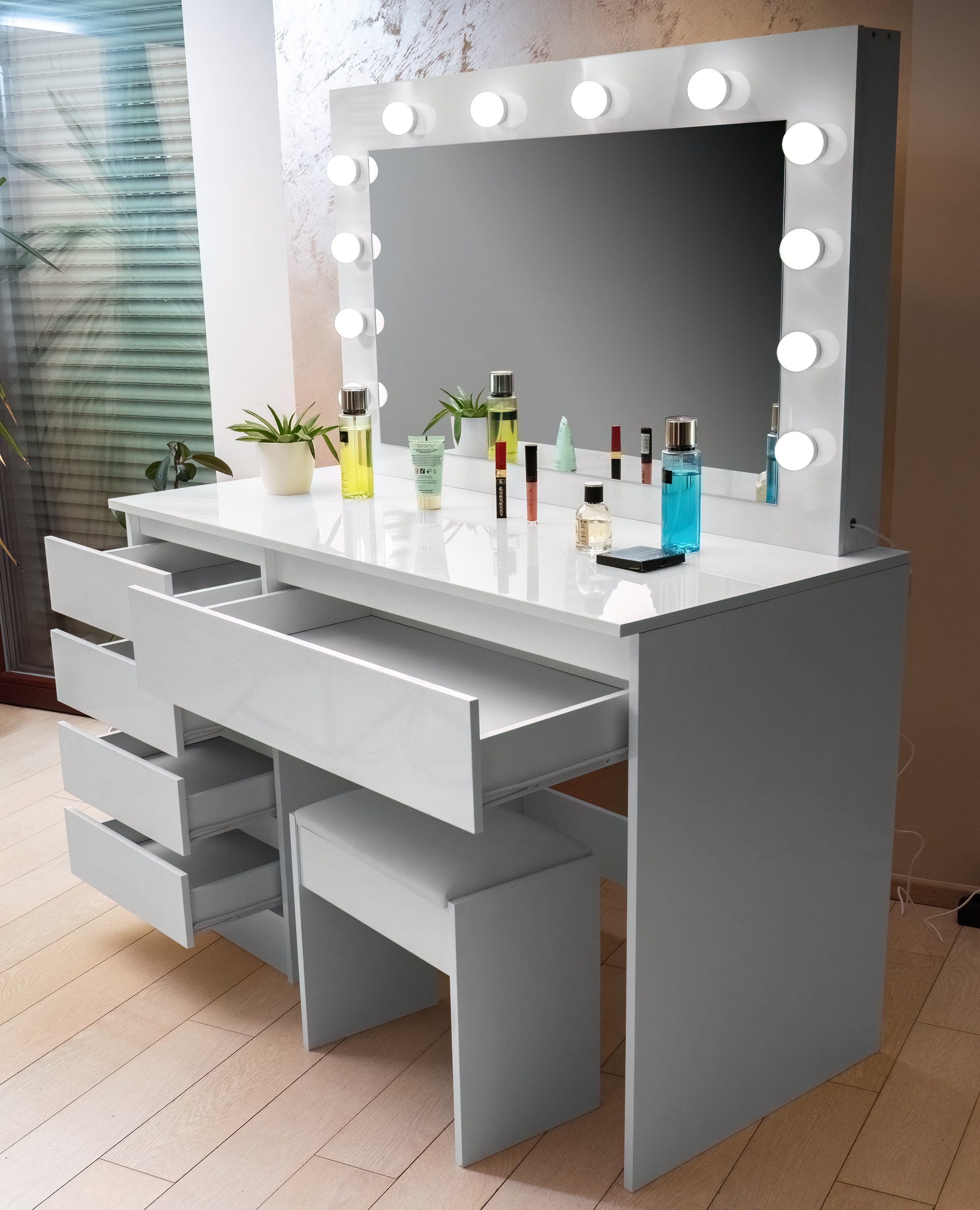 There are 12 LED bulbs on the mirror, so you can make up comfortably even in poor natural light.The stool is made of high quality soft and foam that can be sat on for hours.