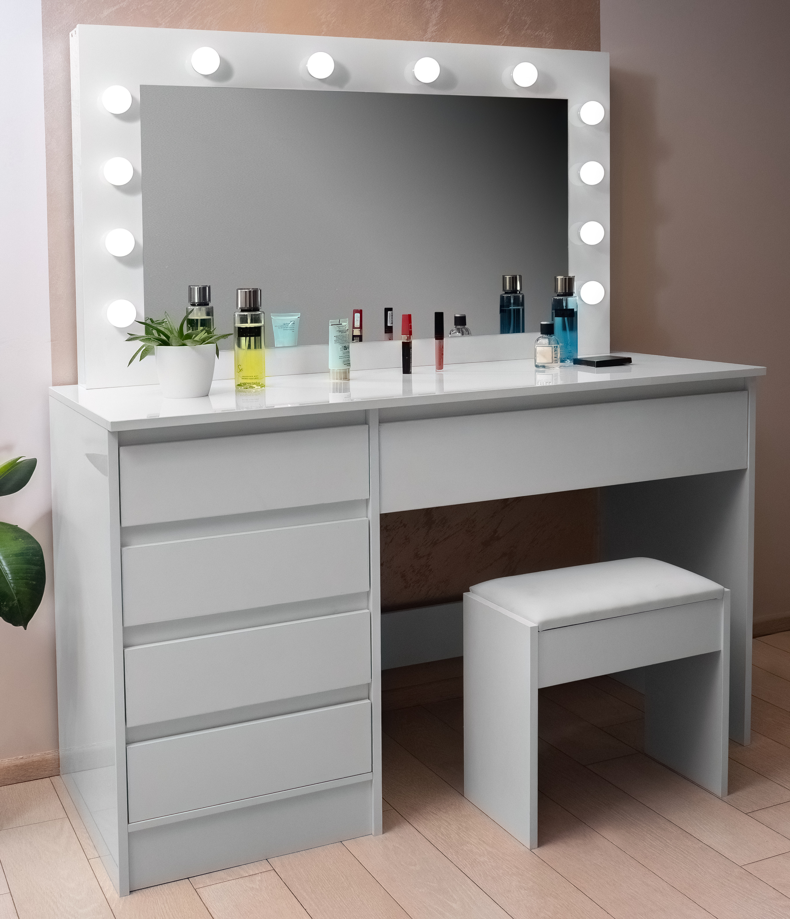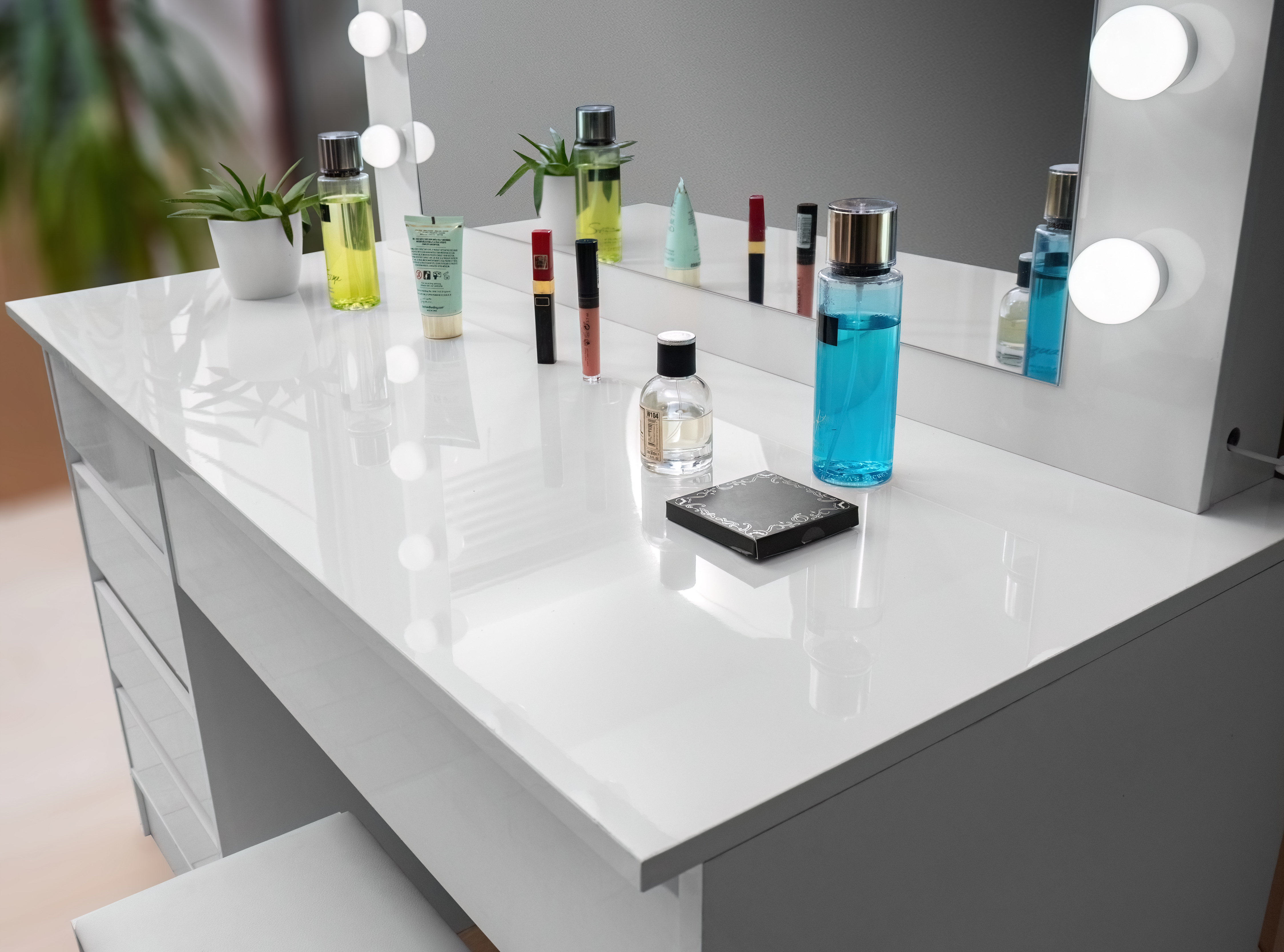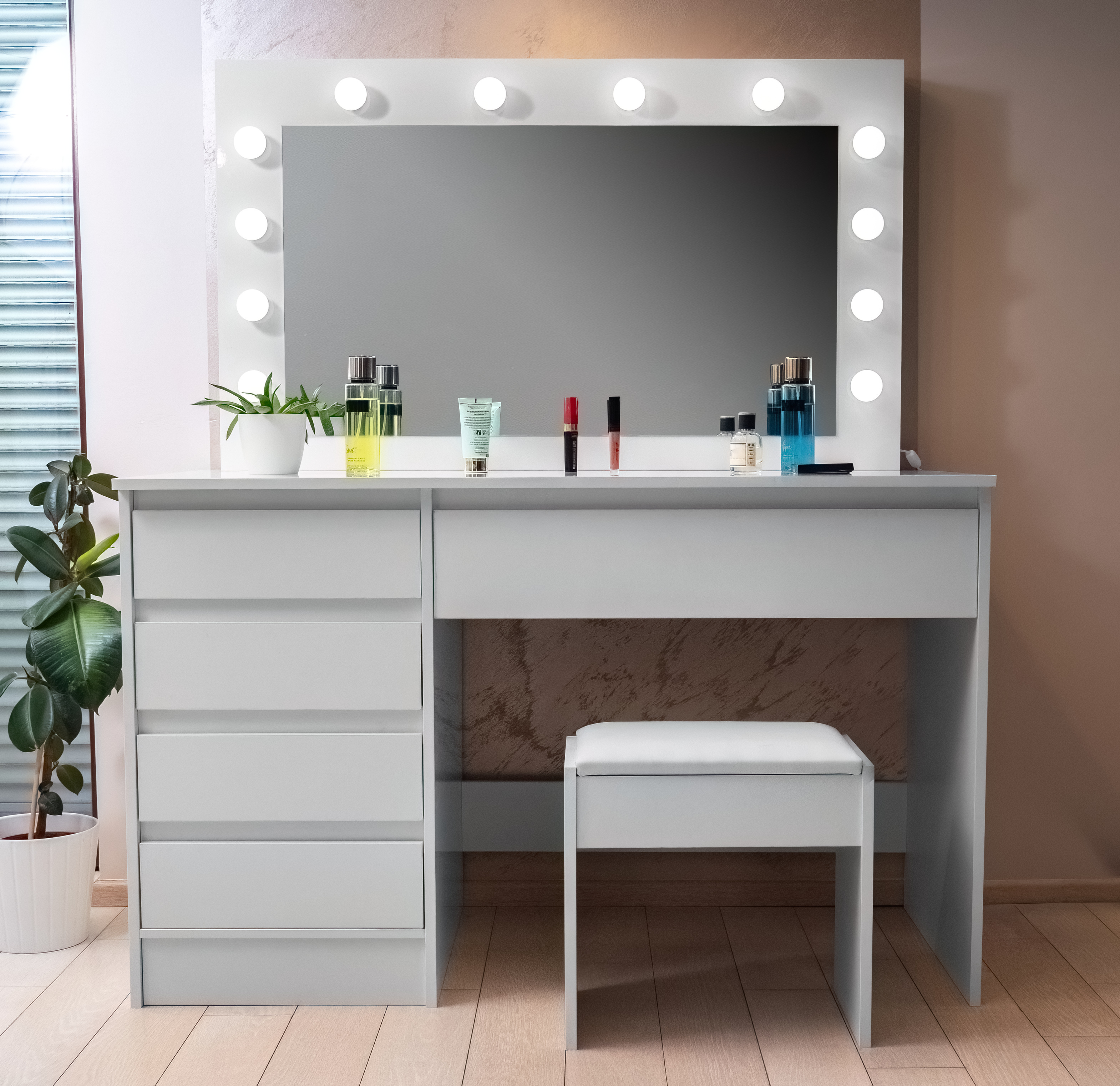 There are 12 LED bulbs on the mirror, so you can make up comfortably even in poor natural light.The stool is made of high quality soft and foam that can be sat on for hours.