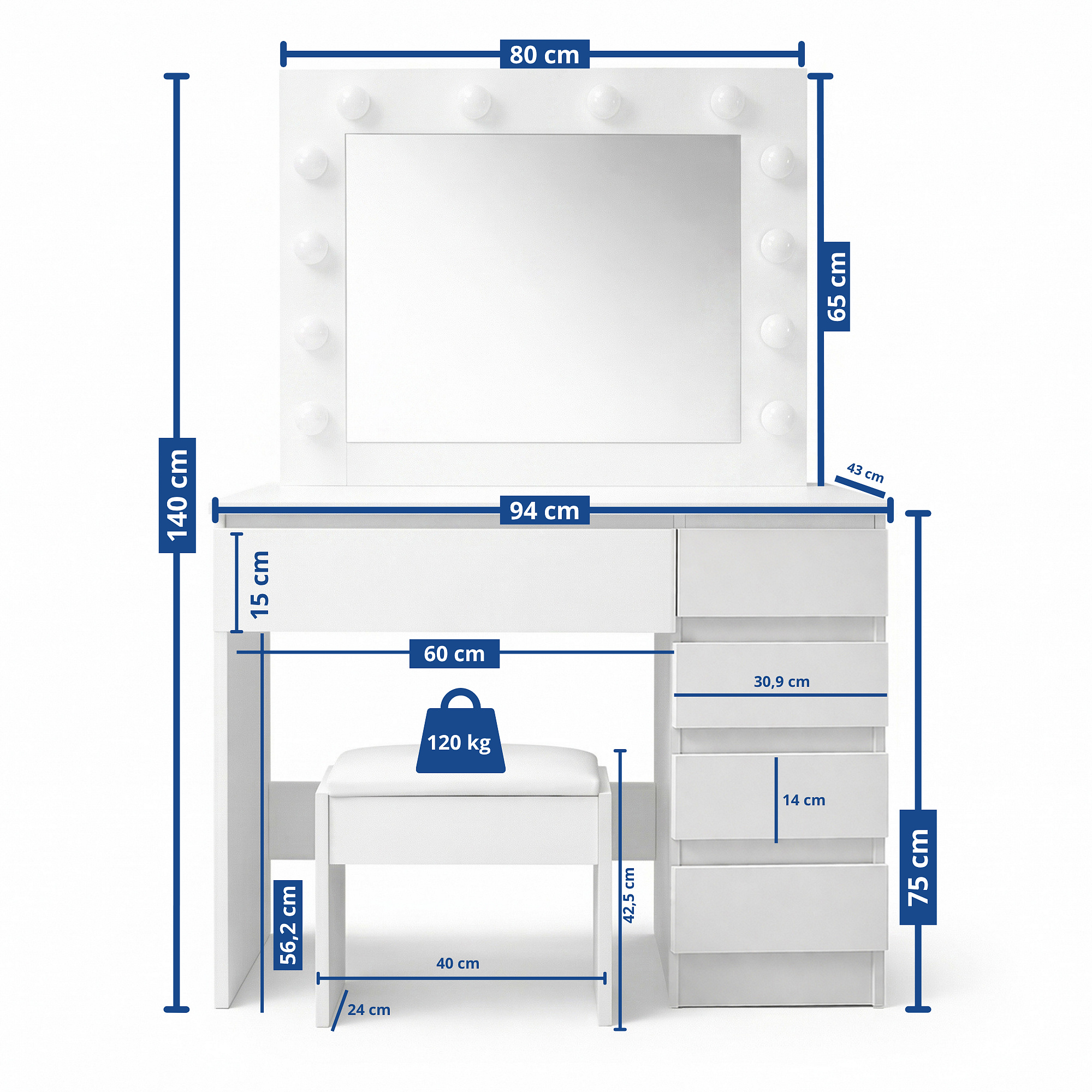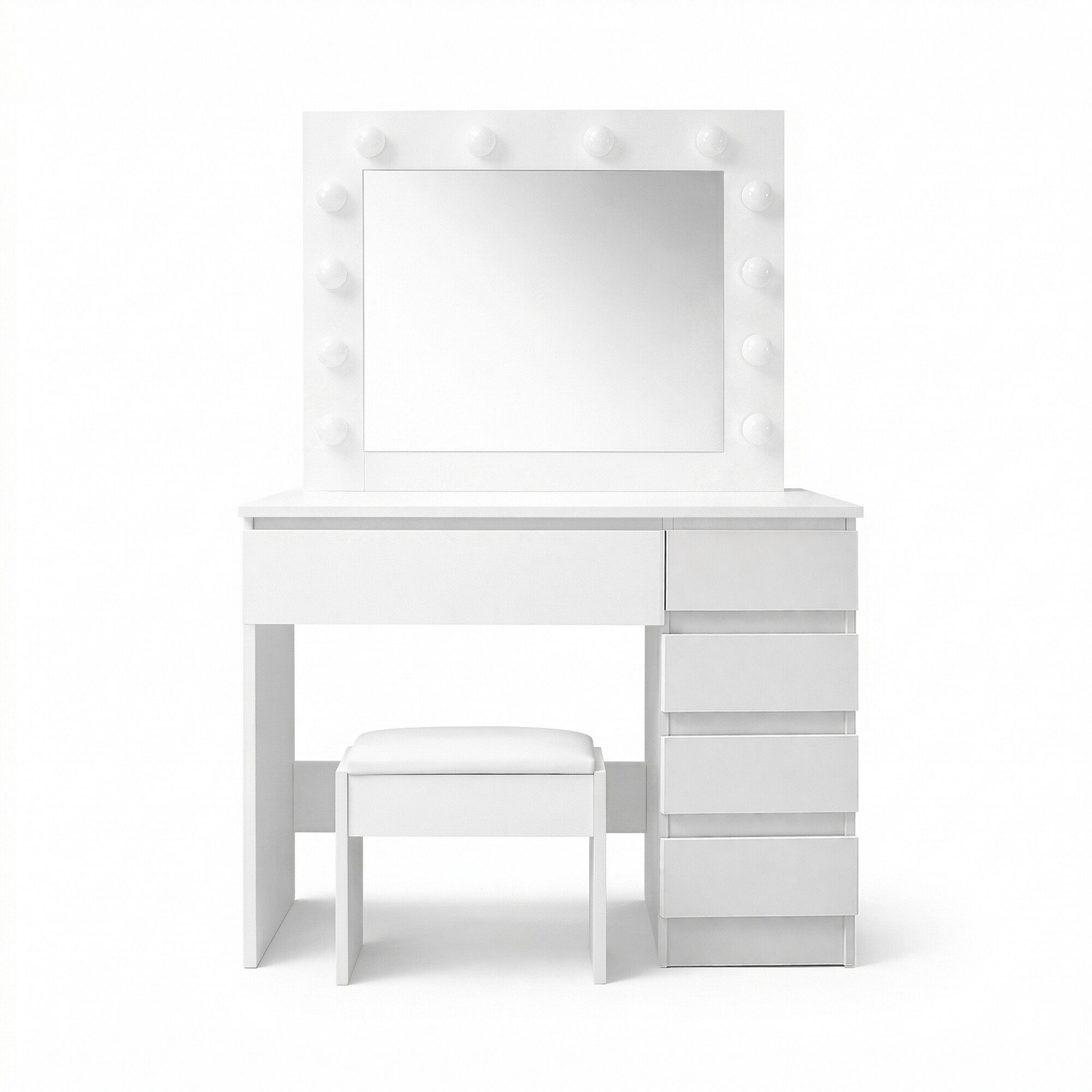 The ottoman is made of high-quality soft foam, on which you can sit for hours.The dressing table is made of sturdy laminated chipboard with a melamine surface, which excels in its scratch resistance.