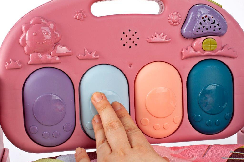 each key lights up when pressed. 3 sound modes: sounds of the Do-Re-Mi-Fa series, short sounds, e.g. children's laughter, each key is a different longer melody