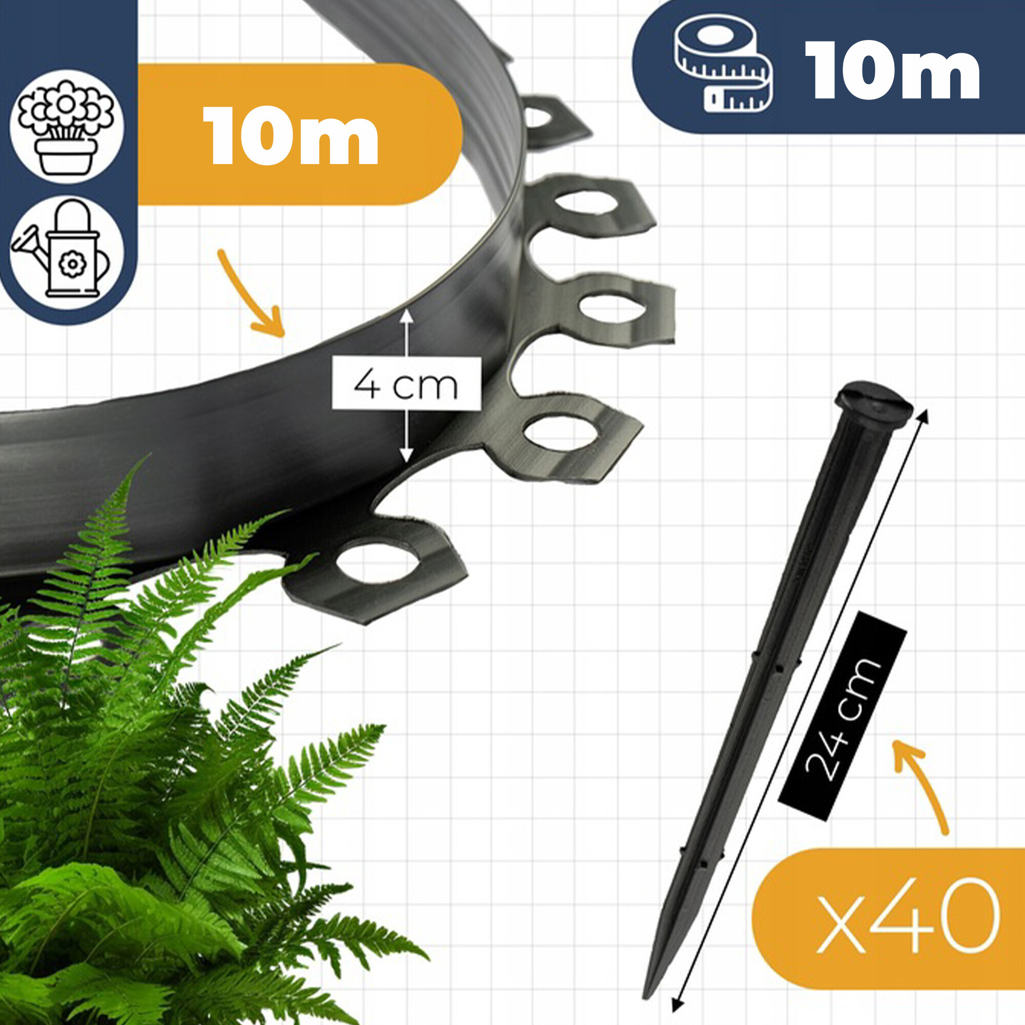 The plastic garden edging is resistant to UV radiation, frost, and moisture, ensuring long-lasting durability even with year-round use. In the package, you will find 1 roll of 10 meters and also 20 anchors with a length of 24 cm, which ensure a firm attachment of the curb in the ground.