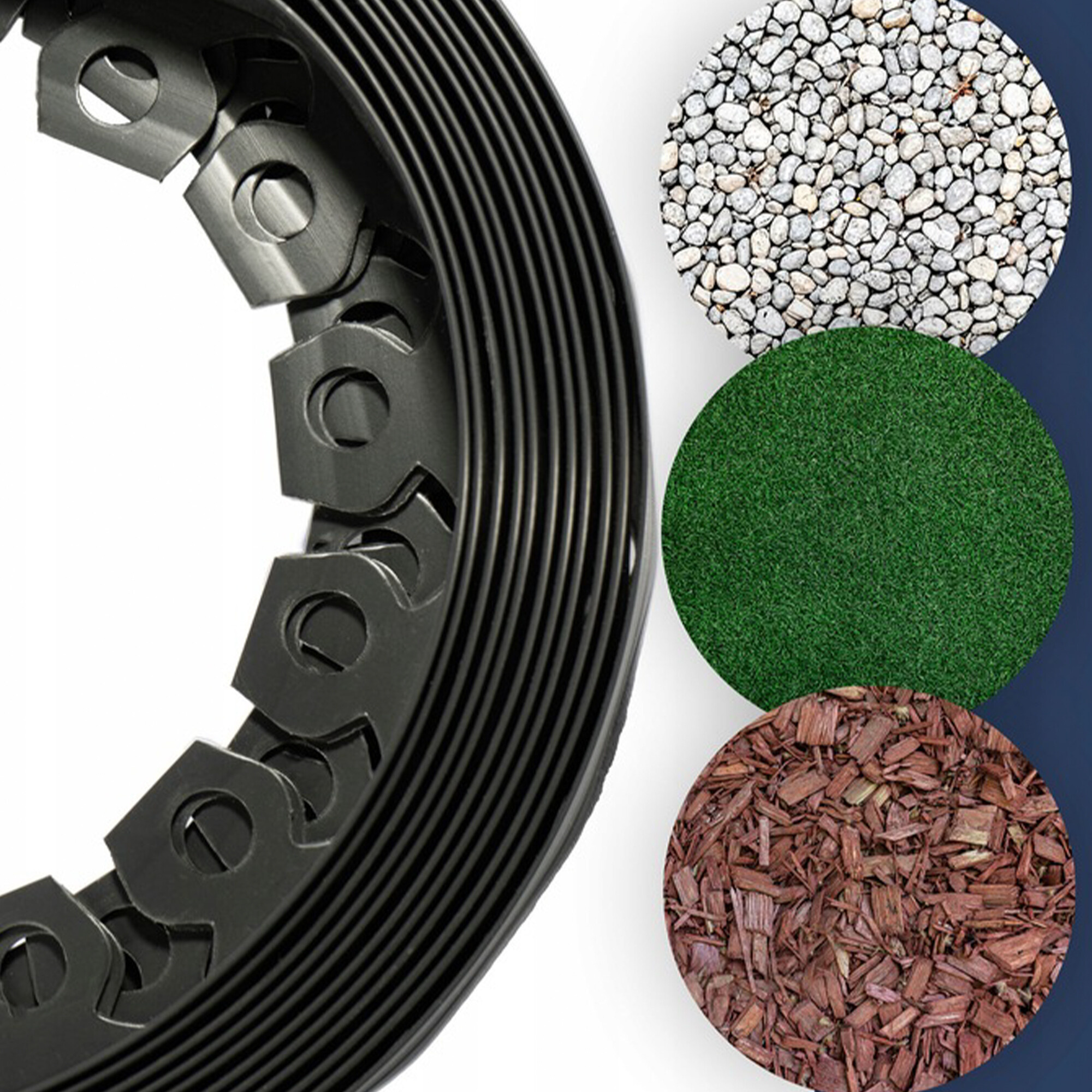 The plastic garden edging 10 m offers a reliable solution for separating lawns, flower beds, walkways, and other parts of the garden. The lawn edging is made of flexible plastic, which allows for creating straight lines as well as curves, so it can easily adapt to any terrain.