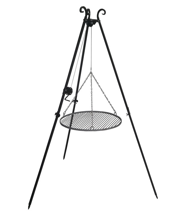 The height of the grill grate can be easily adjusted using the pulley located at the top of the tripod and the hooks. The 60 cm diameter grill allows grilling for larger groups.