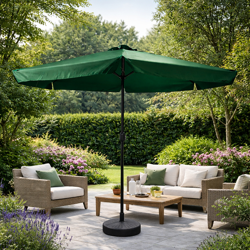 High-quality polyester cover with a weight of 180 g/m² provides effective protection against UV radiation while maintaining color fastness even with prolonged sun exposure. The material is resistant to dirt and very easy to maintain, which you will appreciate in everyday use. The practical crank mechanism allows for quick and convenient opening and closing of the parasol without unnecessary effort, making the handling extremely comfortable.