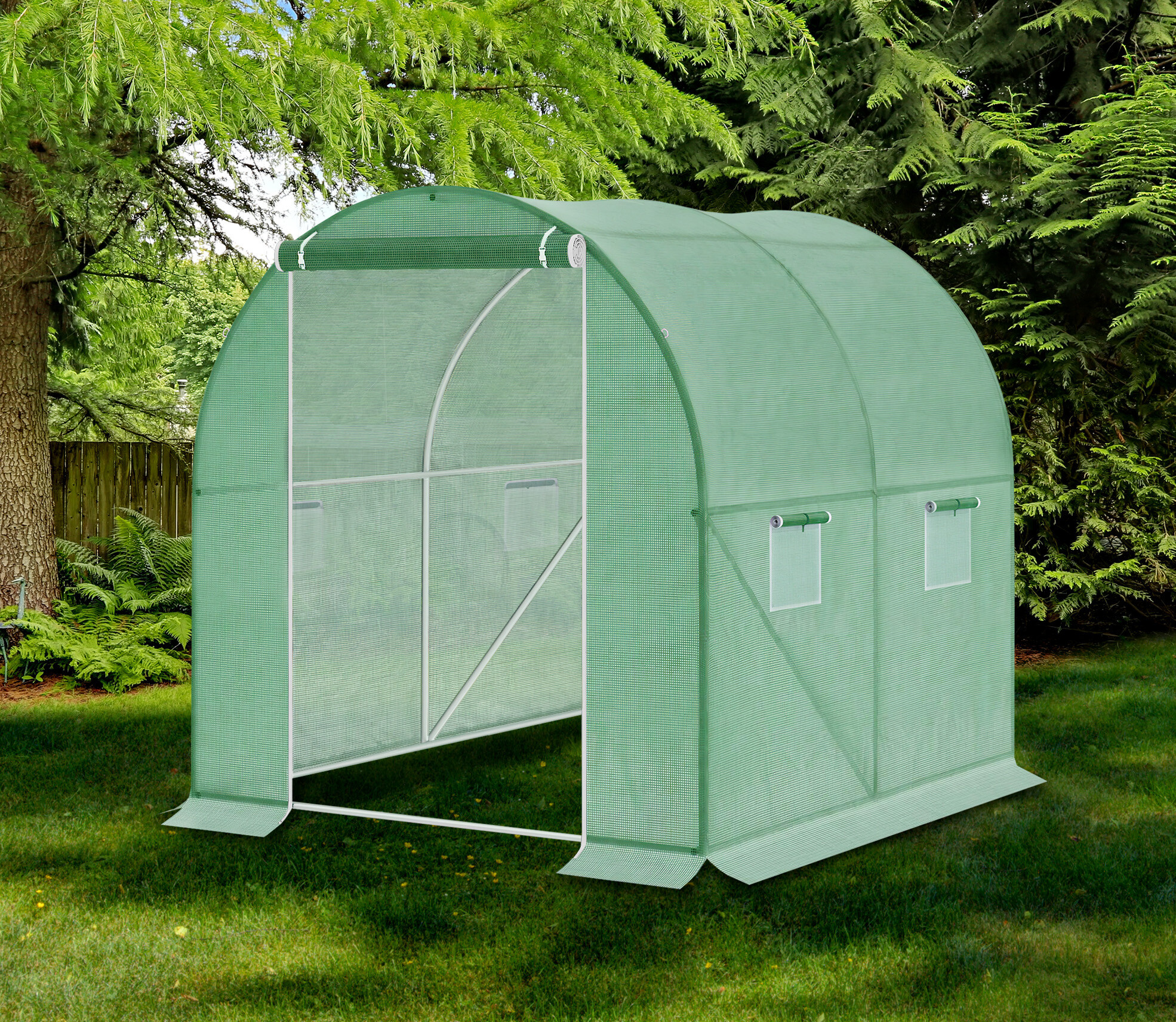 Wide roll-up doors with double zippers for easier entry.