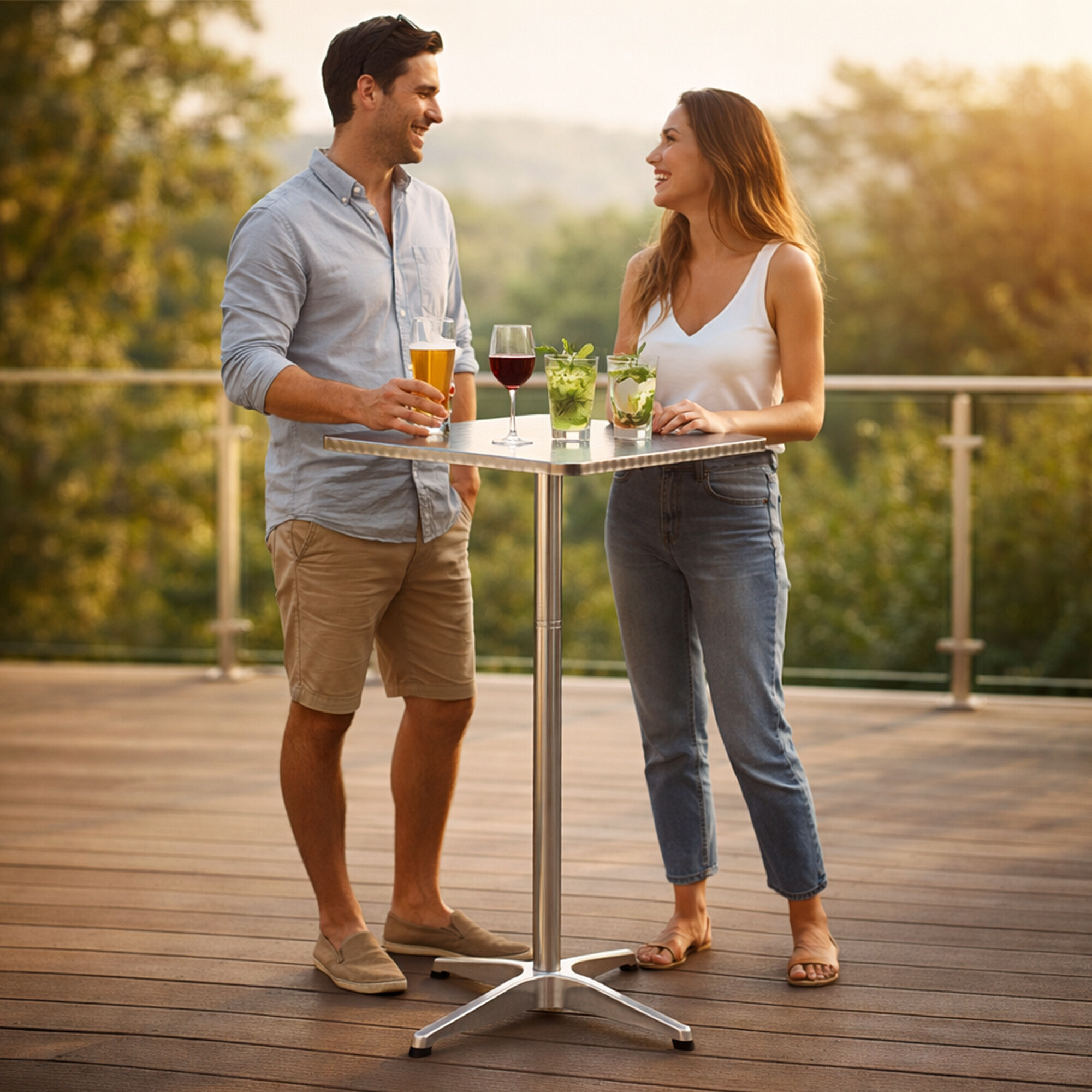 Garden table BISTRO with a sturdy aluminum frame and stainless steel top in a modern design, suitable for gardens, terraces, cafes, gazebos, balconies, or beaches.