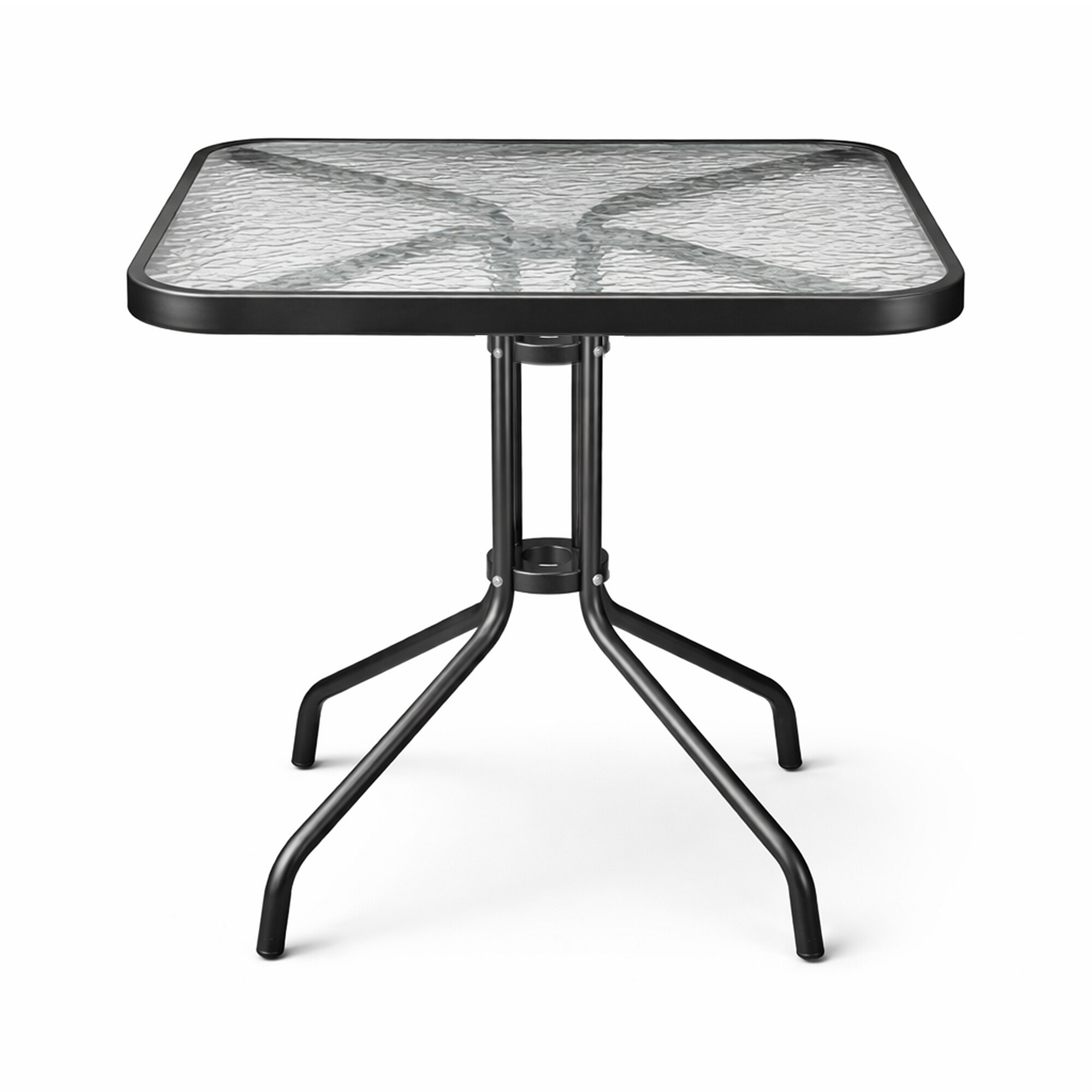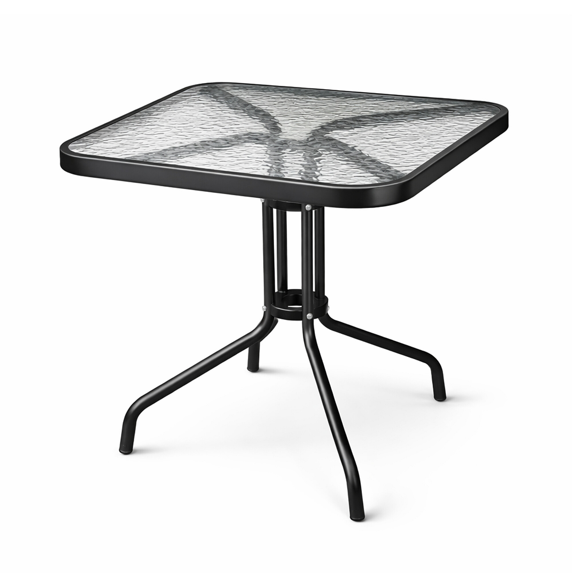 Garden table with a sturdy metal frame and glass top, suitable for gardens, terraces, cafes, gazebos, balconies.