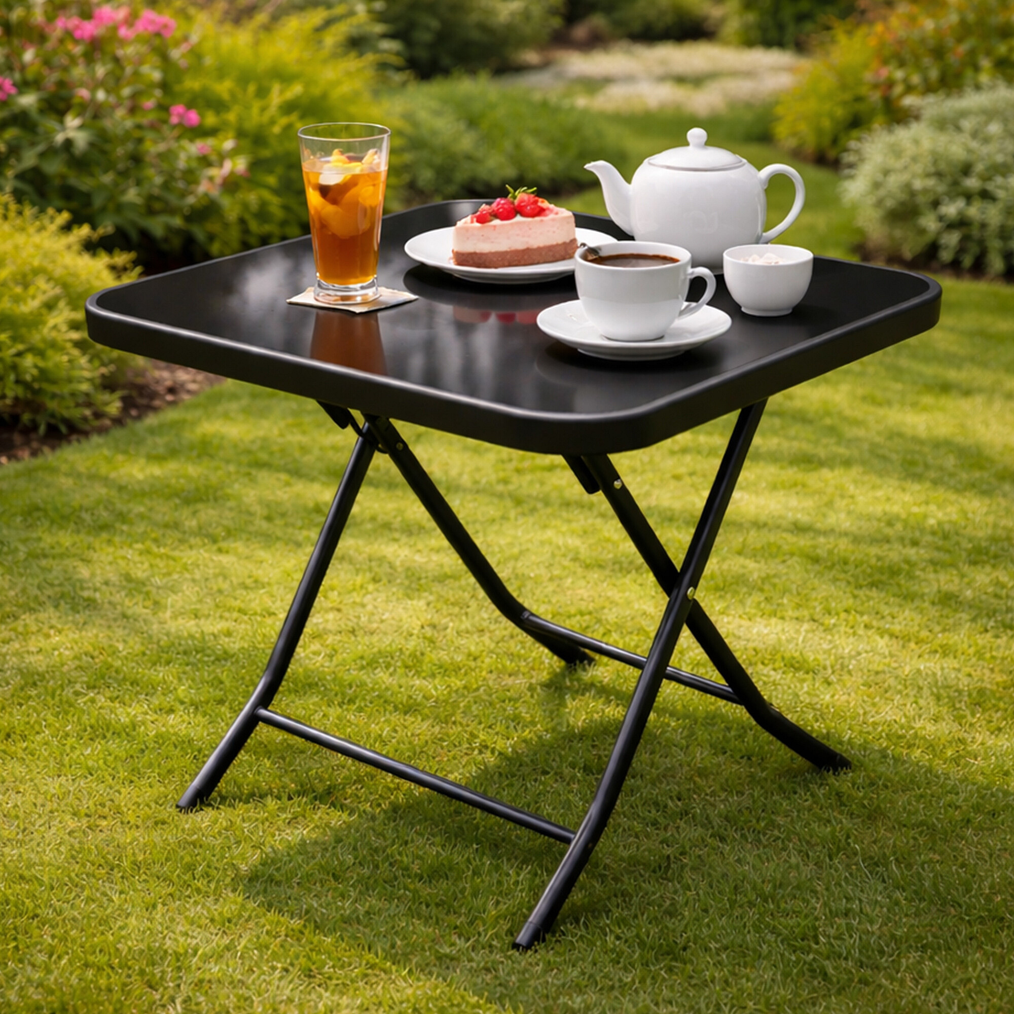 Garden table with a sturdy metal frame and glass top, suitable for gardens, terraces, cafes, gazebos, balconies.