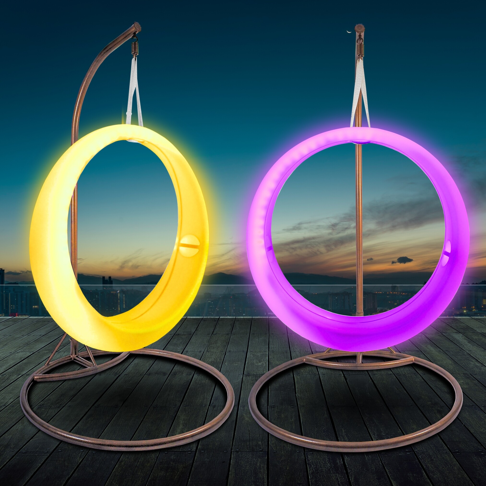 The diameter of the circle is 125 cm, which provides enough space for comfortable seating and swinging. The circle is made of high-quality polycarbonate (PC), which is known for its durability and long lifespan. The chair stand is made of solid steel, ensuring stability and safety during use.The chair is equipped with stunning RGB lighting, allowing you to create the perfect atmosphere. Thanks to the remote control, you can easily change colors and lighting effects according to your mood. The light output of 20W ensures enough light for pleasant evening moments.