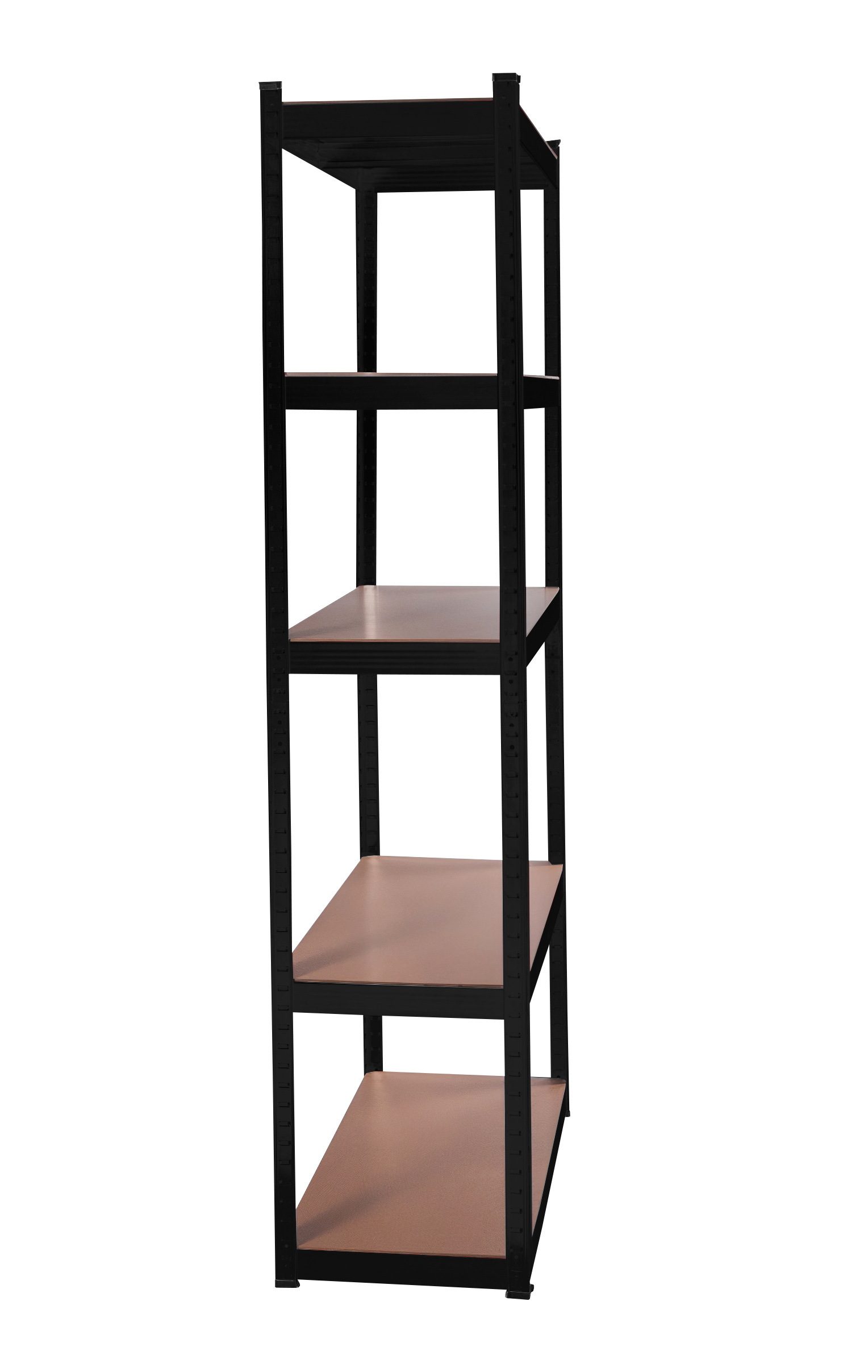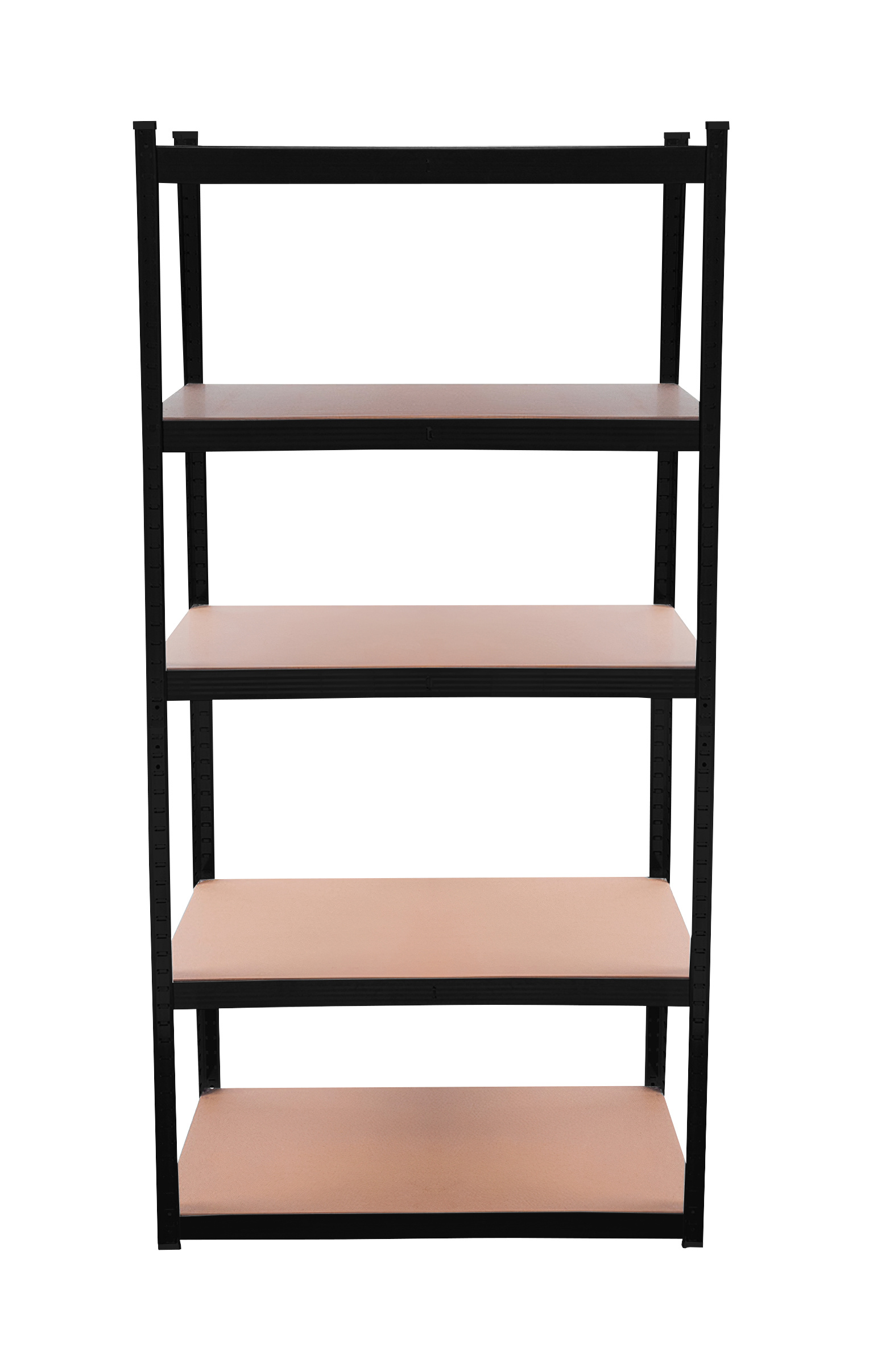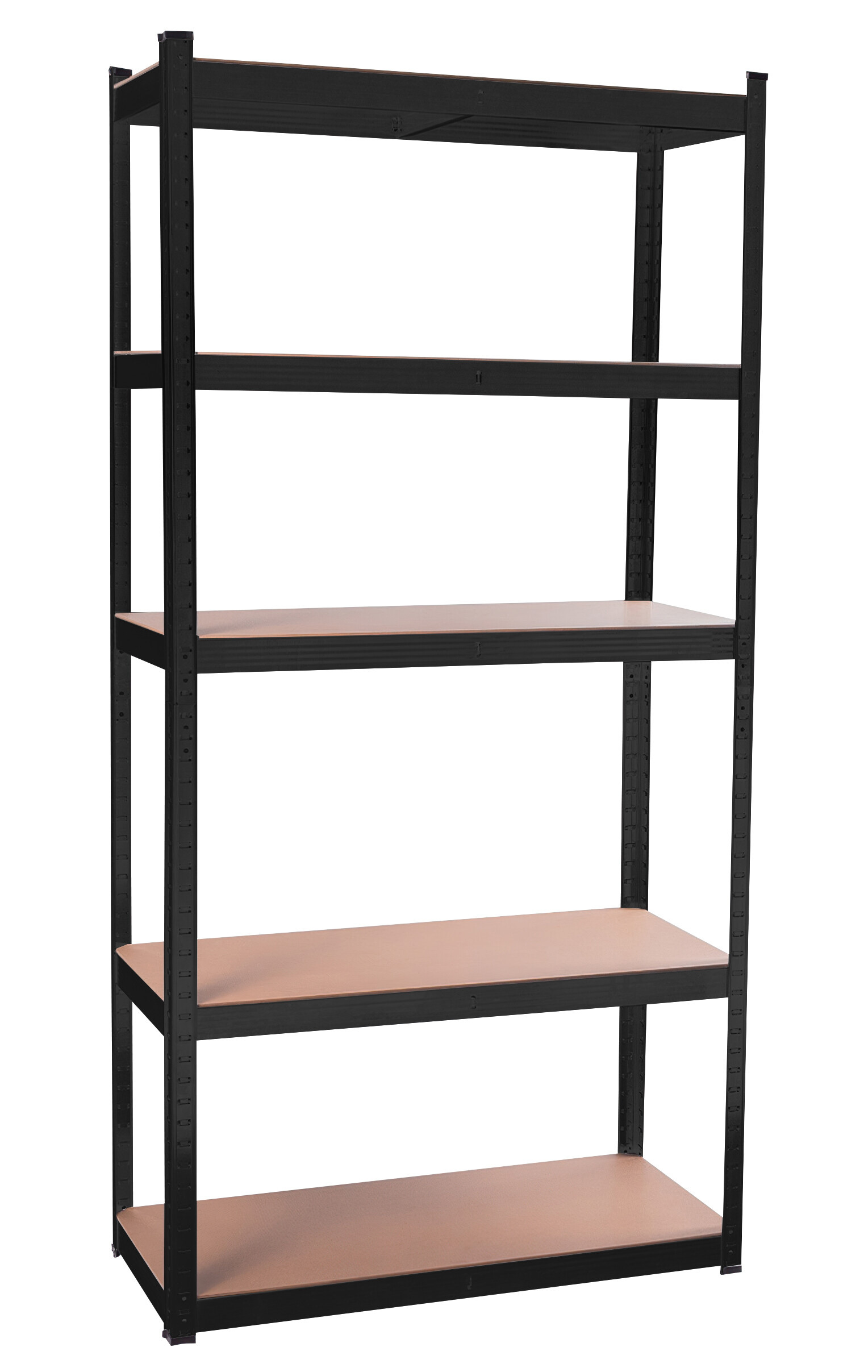 At a height of approximately 180 cm, you have 5 MDF shelves available, which can be adjusted in height as needed. The frame made of galvanized steel in black color ensures stability and a high load capacity of approximately 875 kg (each shelf can hold approximately 175 kg).