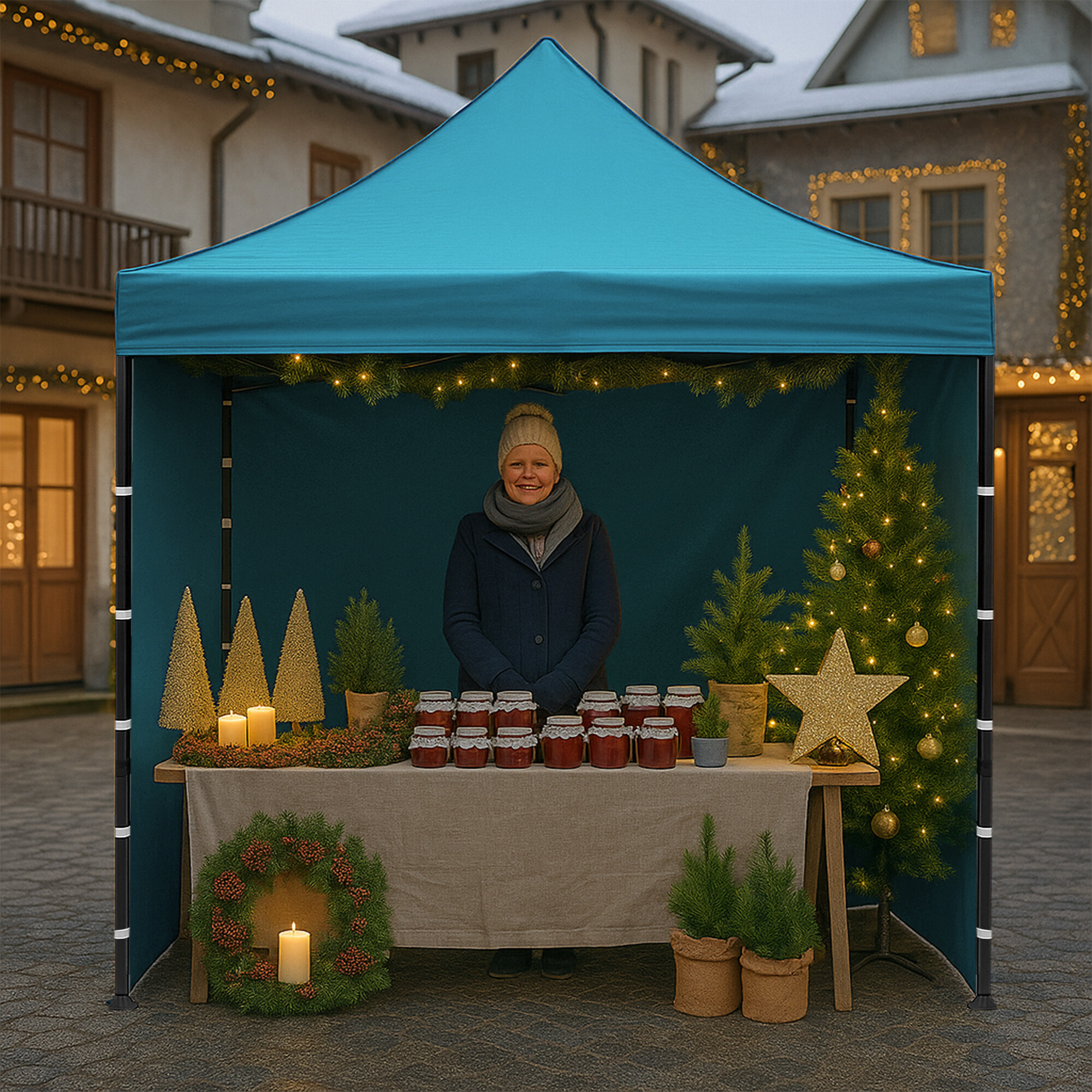 The 2×2 m sales booth with a sturdy scissor construction is designed for farmers' markets, promotional events, exhibitions, and seasonal sales.