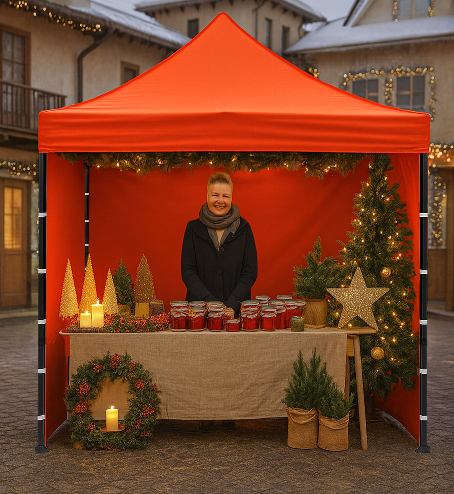 The roof made of 420D PU Oxford and the sidewalls made of PVC Oxford 210D provide protection against wind and rain while creating a representative environment for both vendors and customers. Thanks to the practical Velcro, the side panels can be quickly removed or reattached.