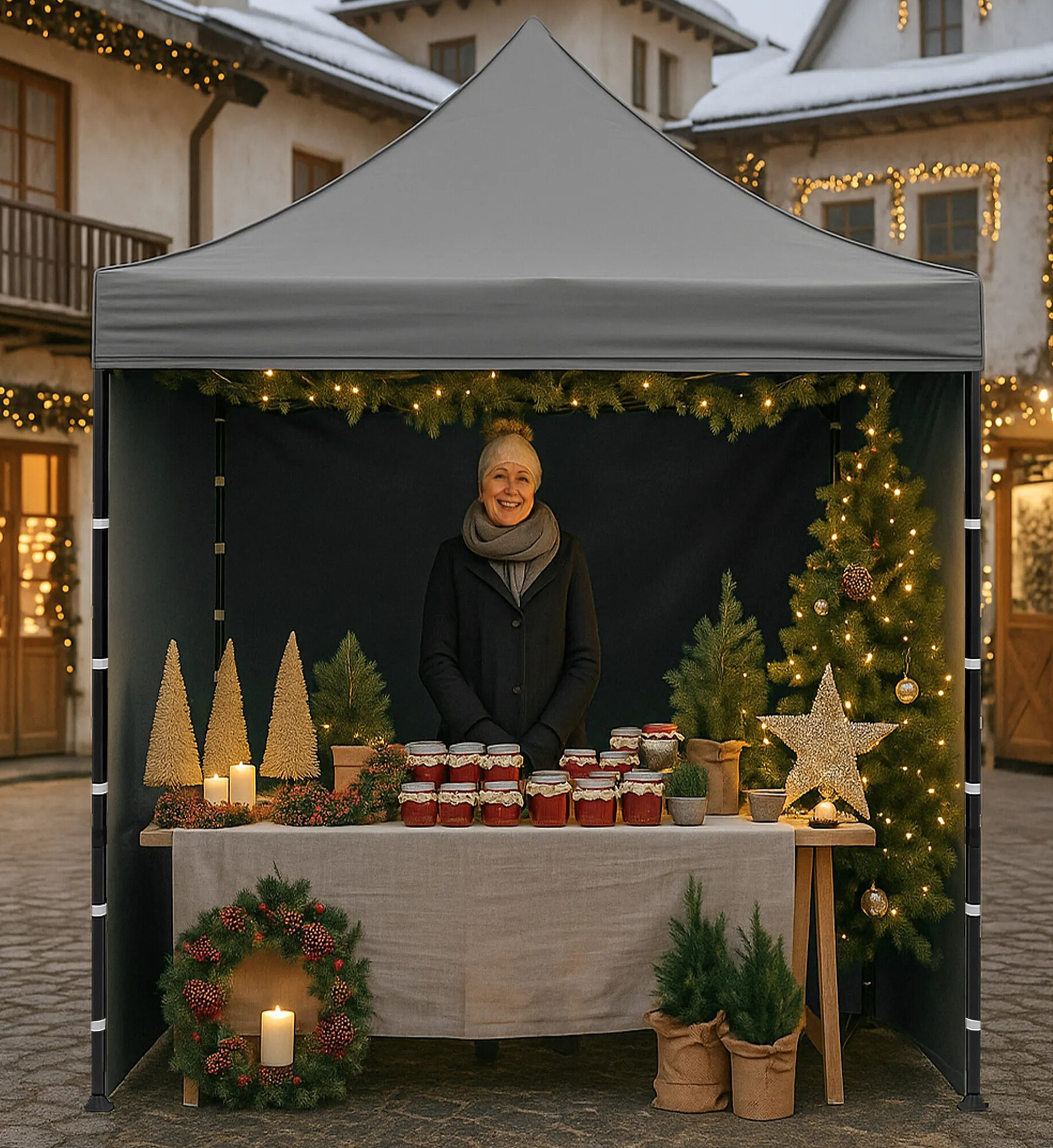 The roof made of 420D PU Oxford and the sidewalls made of PVC Oxford 210D provide protection against wind and rain while creating a representative environment for both vendors and customers. Thanks to the practical Velcro, the side panels can be quickly removed or reattached.
