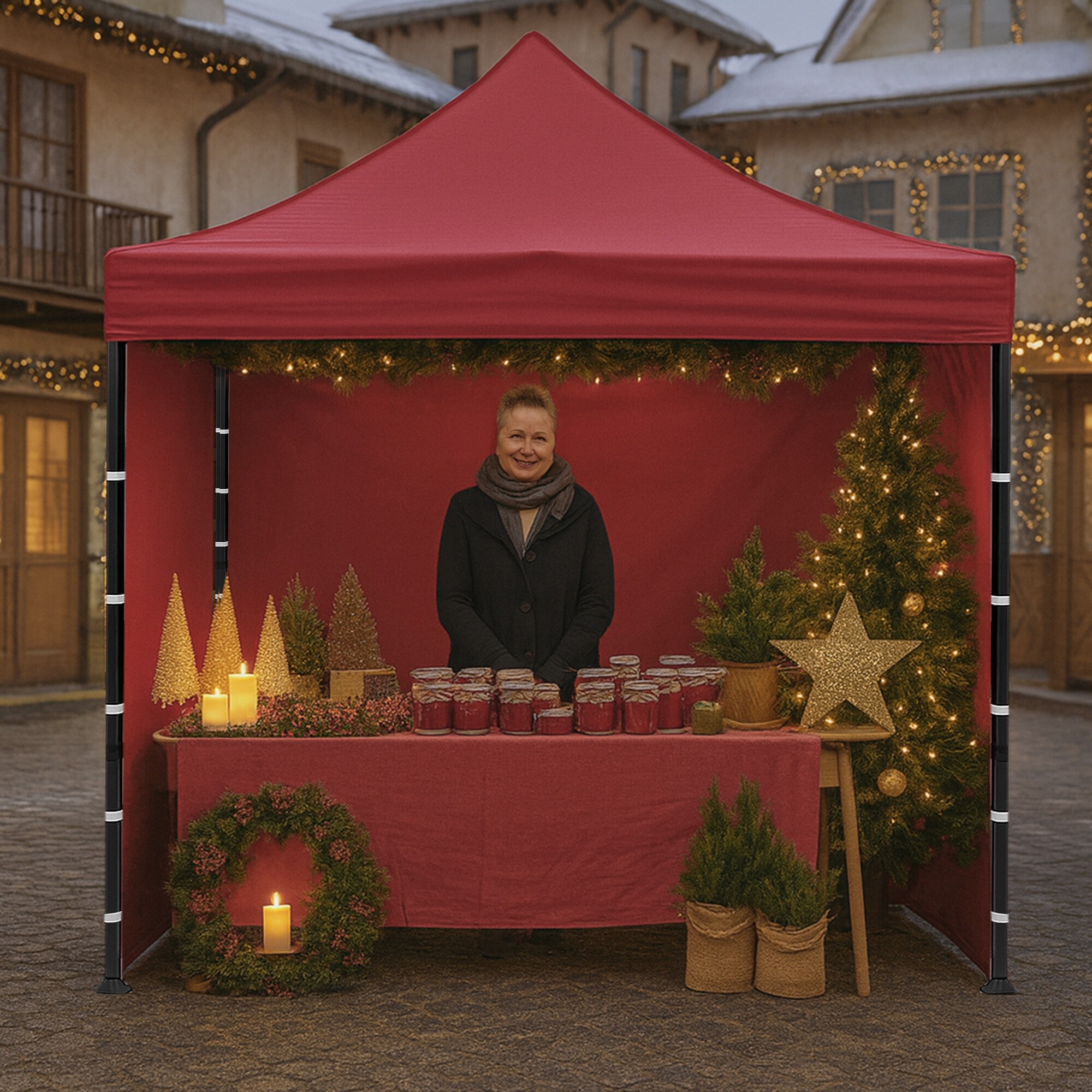 The roof made of 420D PU Oxford and the sidewalls made of PVC Oxford 210D provide protection against wind and rain while creating a representative environment for both vendors and customers. Thanks to the practical Velcro, the side panels can be quickly removed or reattached.