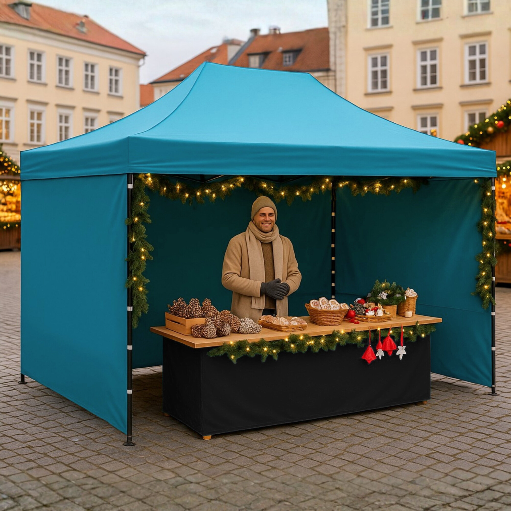 This dimension will be appreciated by exhibitors and sellers who need more space for goods and customer comfort. Thanks to its design and quick folding system, it is easy to set up, take down, and transport despite its size.