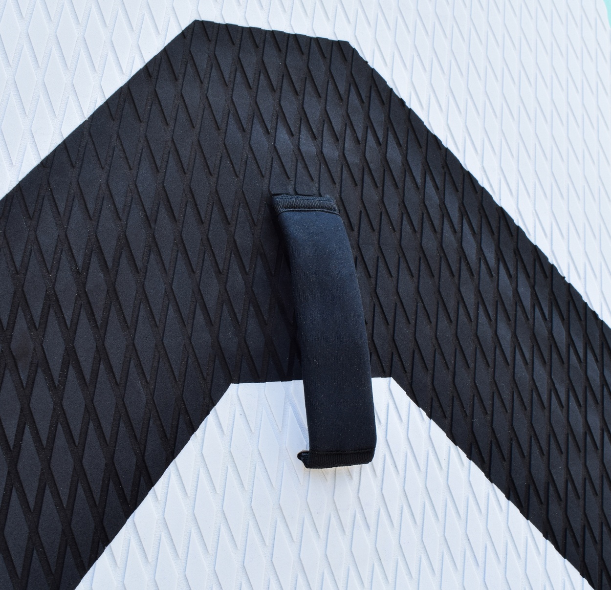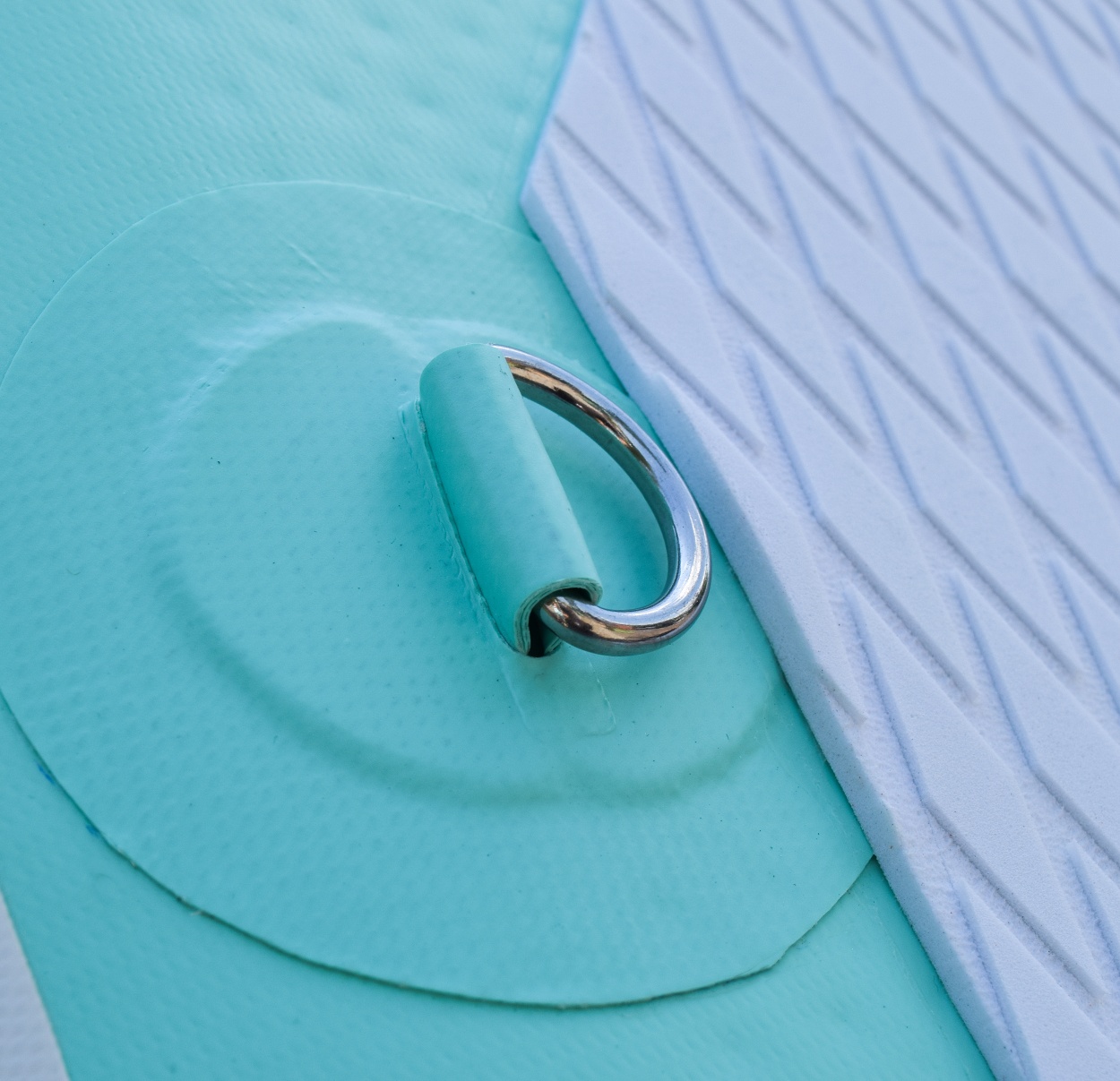 The board is equipped with D-ring handles at the bow and stern for attaching the safety line.