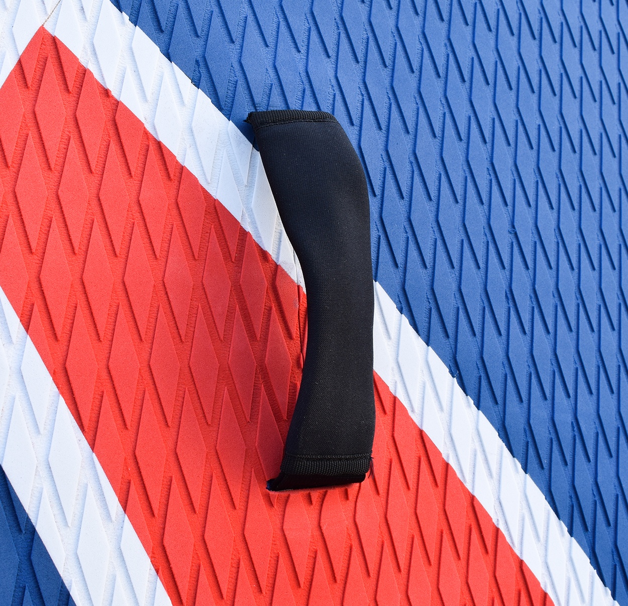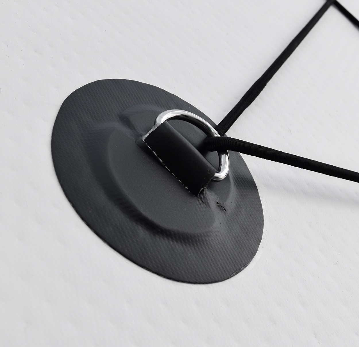 The board is equipped with D-ring handles at the bow and stern for attaching the safety line.