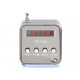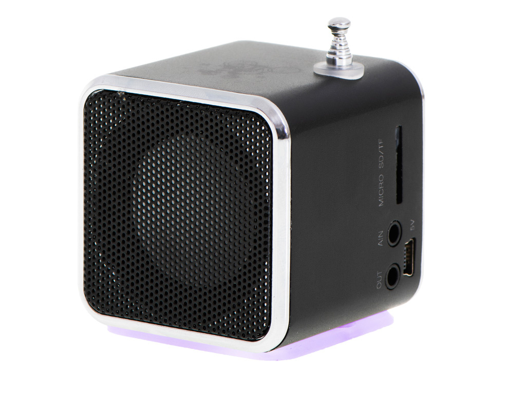 Specifications: fM radio: 88 MHz - 108 MHz operating time: 2h remembers the last set radio station built-in rechargeable battery: charge via USB 5V led light underneath extendable antenna fM radio channel memory automatic FM radio scanning mp3 player microSD/TF card reader uSB input aUX input headphone output lCD display power supply: built-in rechargeable battery speaker power: 3 W frequency response: 20 Hz - 20 kHz volume: 45 dB interface: micro SD, USB, 3,5 mm line input, DC input, 3,5 mm audio output compatible with all players with AUX input Line In input allows connection of many external devices with minijack output 3.5mm Possibility to connect headphones or other speaker