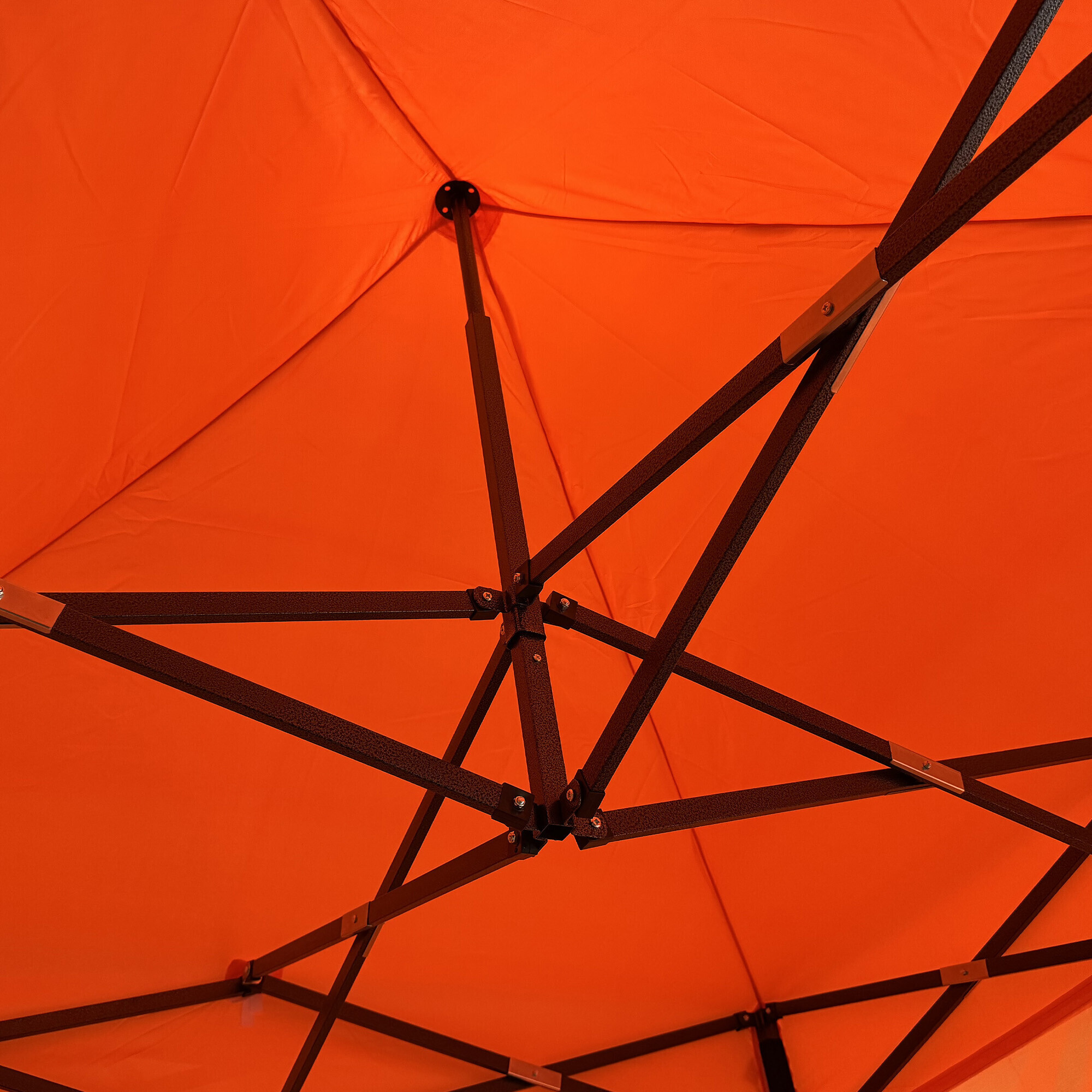 The roof is made of durable 420D PU Oxford material, which protects against the sun and light rain and can be easily maintained by hand washing. The steel scissor structure is strong and stable, with a powder-coated finish for corrosion resistance. Bolted connections ensure higher durability and longer lifespan. The height can be adjusted to three positions (213–290 cm).