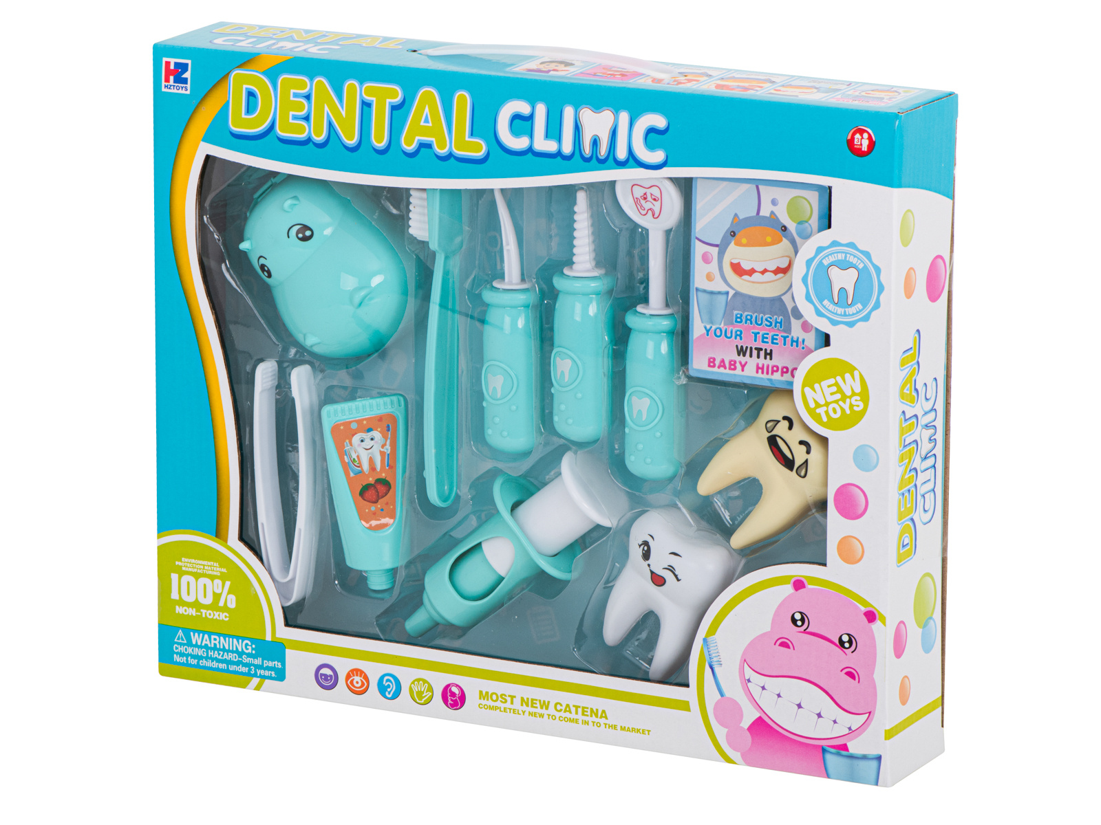 The set includes all the necessary components that a little dentist needs to treat the teeth of a hippo and plush friends: