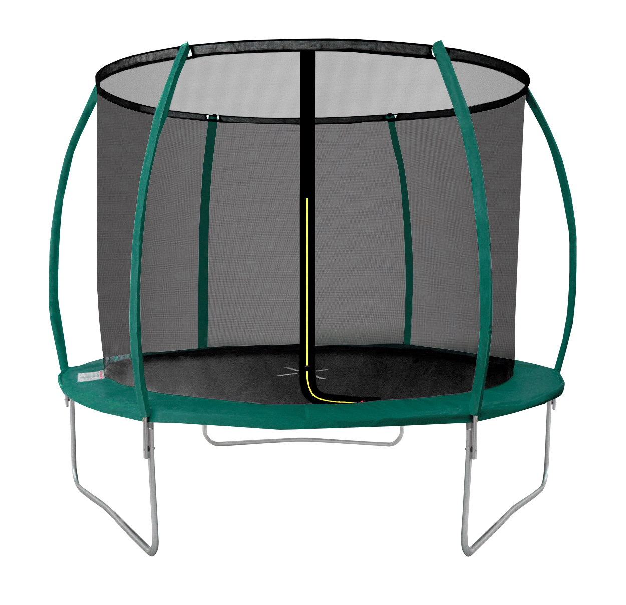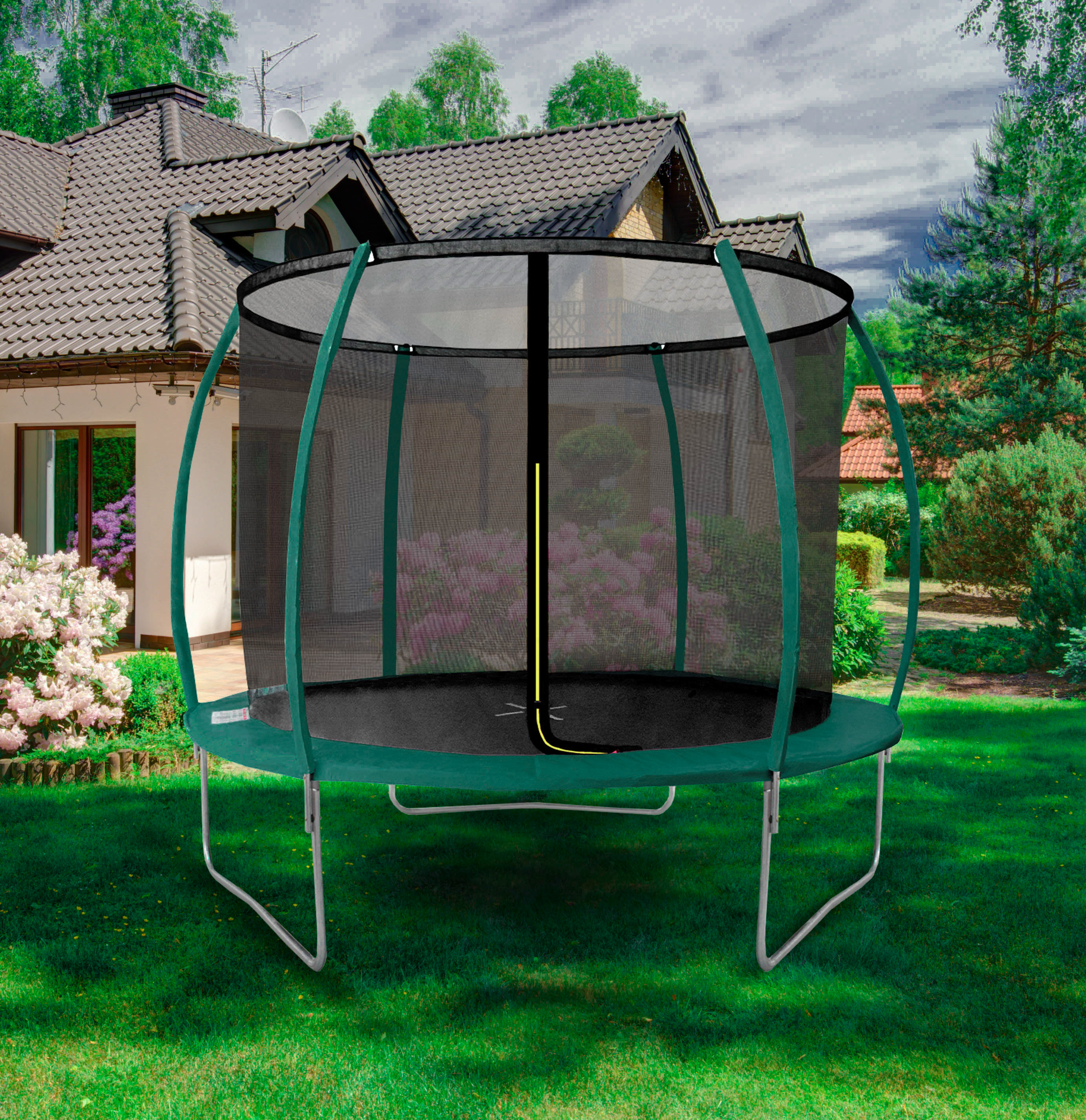 The entrance opening is equipped with an L-shaped zipper, ensuring the complete closure of the trampoline.