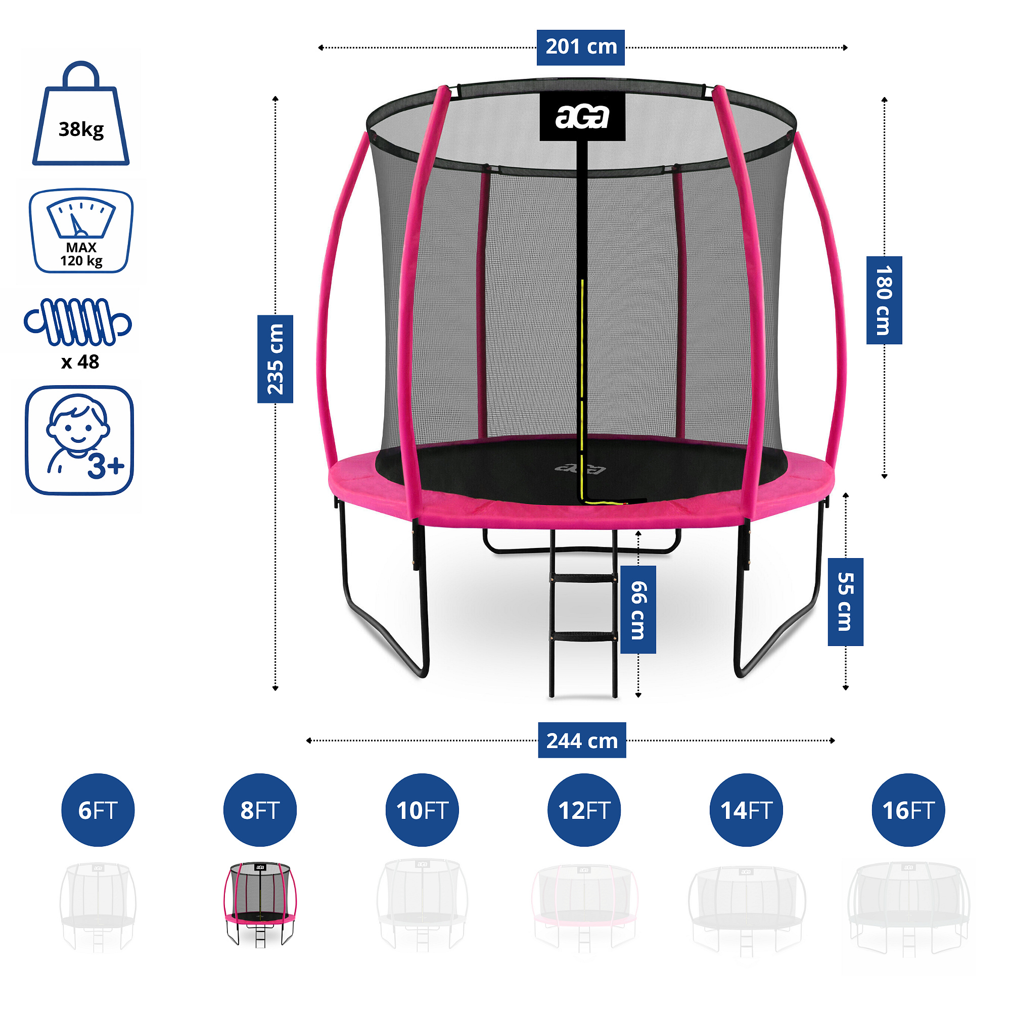 - Trampoline diameter: 250 cm (8 ft)