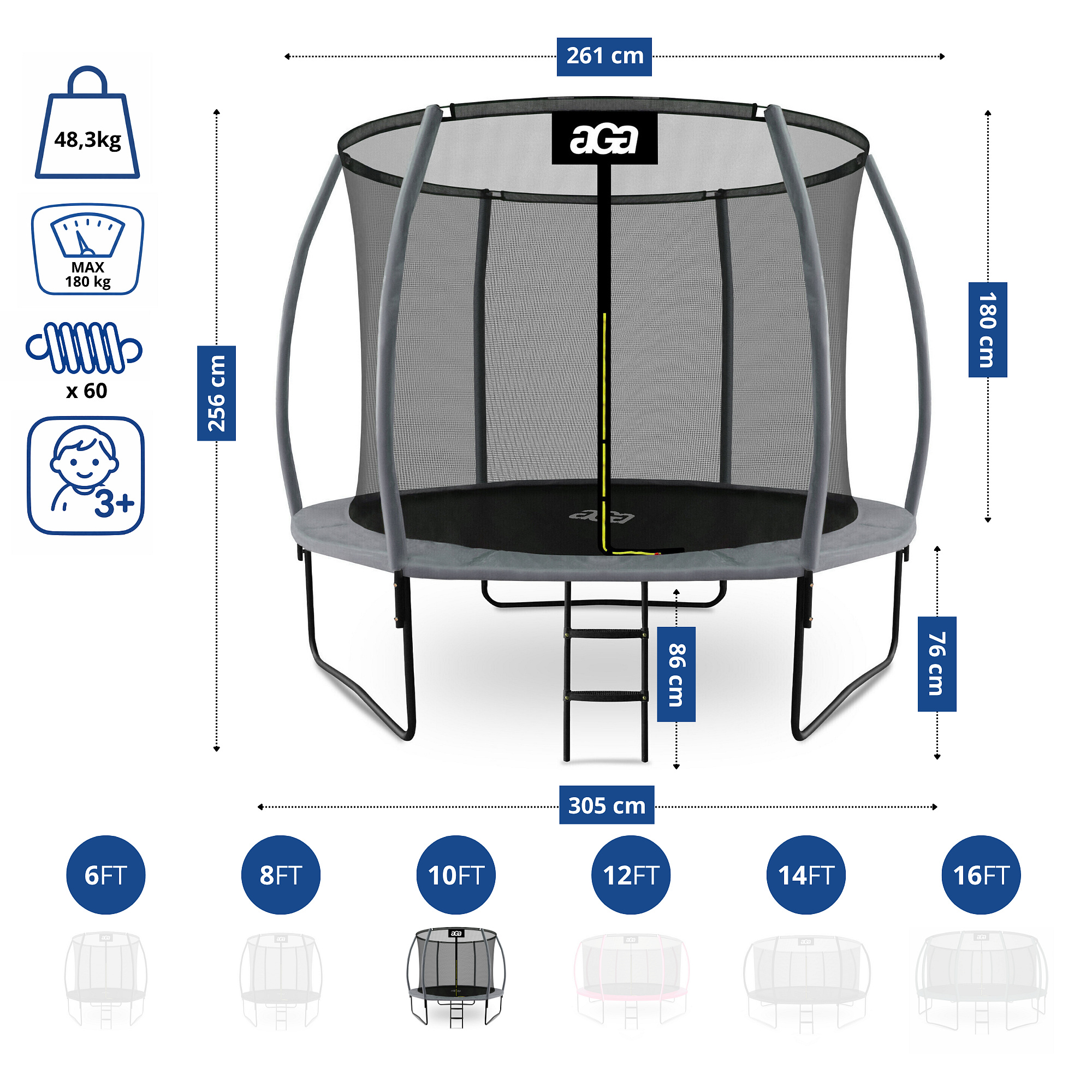 - Trampoline diameter: 305 cm (10 ft)
