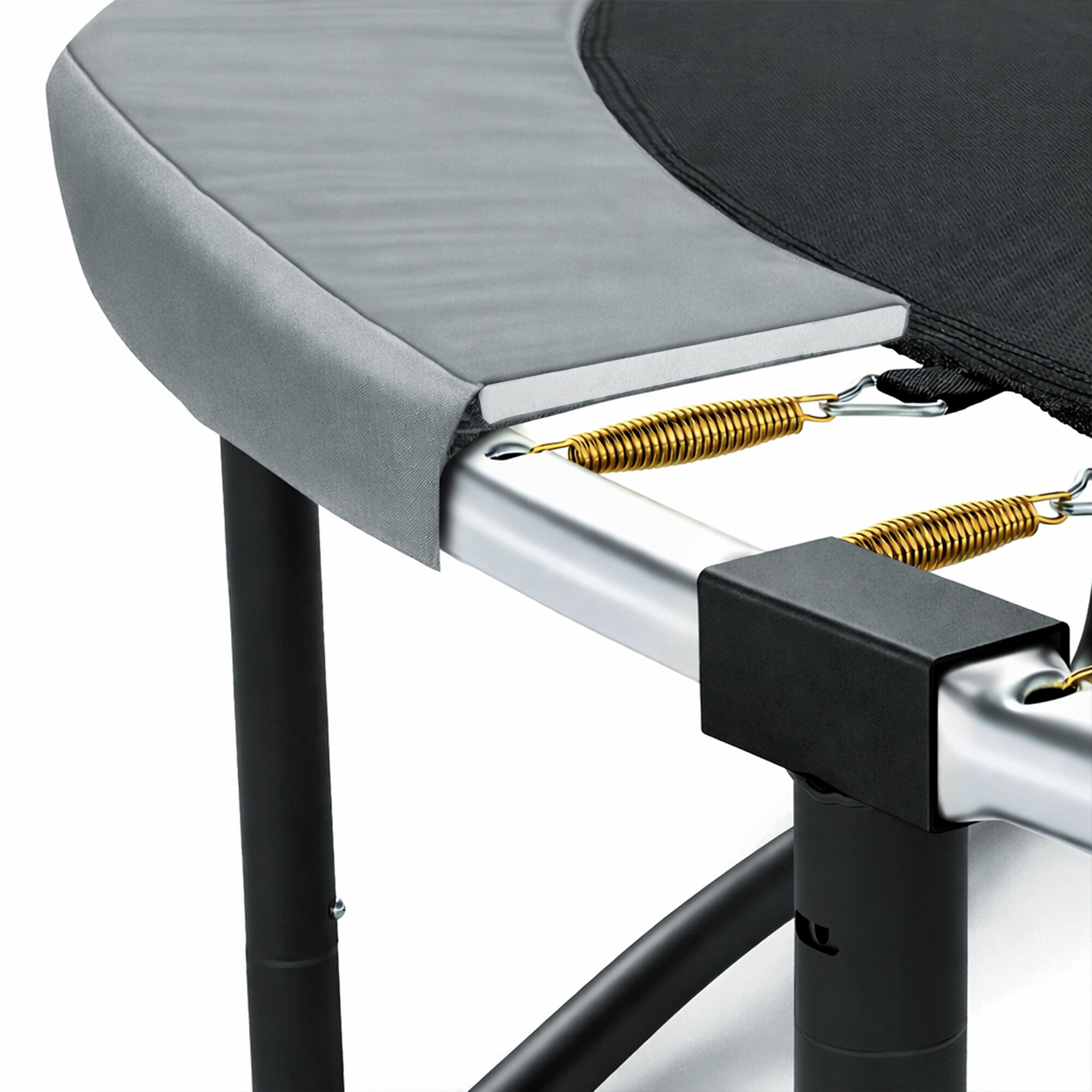 The circular Hi-Ten reinforced trampoline construction is made of high-quality galvanized steel with excellent corrosion resistance, and the U-legs have a powder-coated finish.