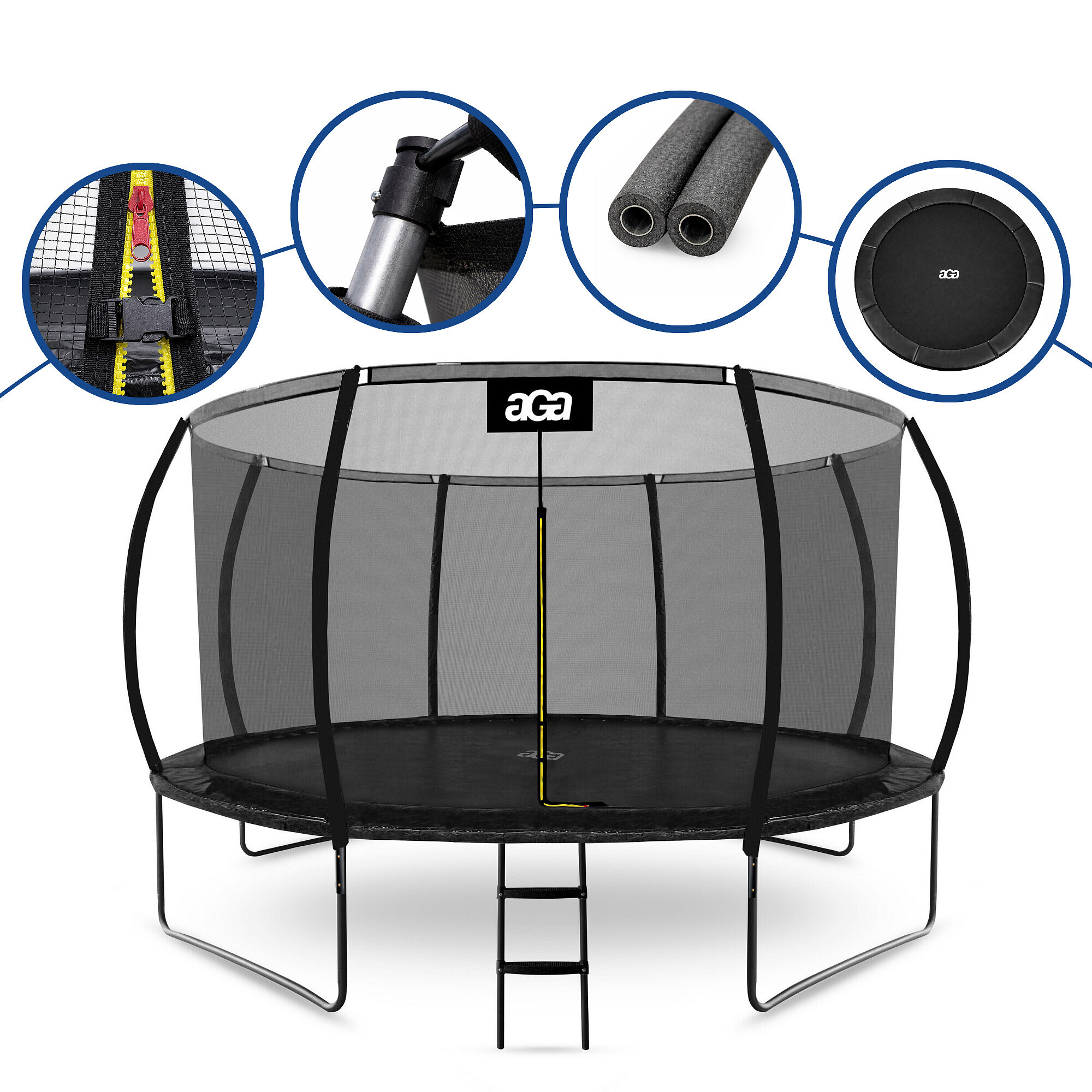 The entrance opening is equipped with an L-shaped zipper, ensuring the complete closure of the trampoline.