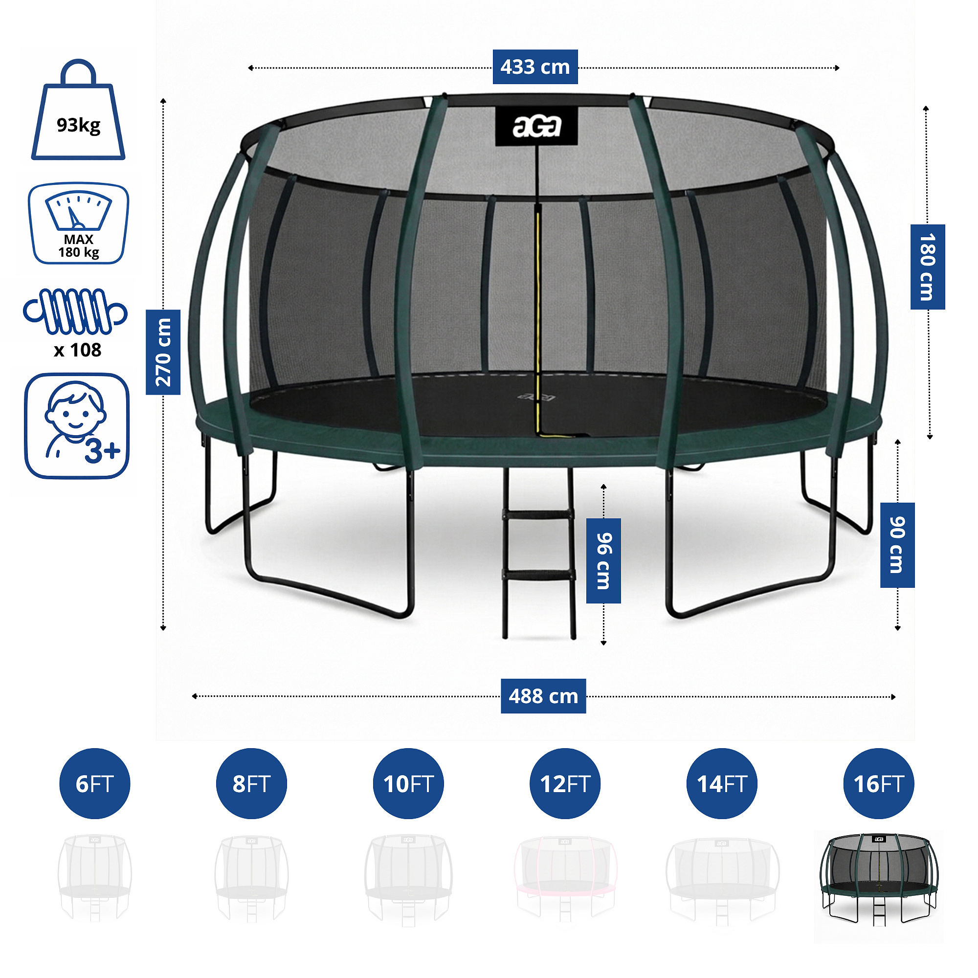 - Trampoline 500 cm (16 ft) - (frame + poles + foam pole protectors + screws)