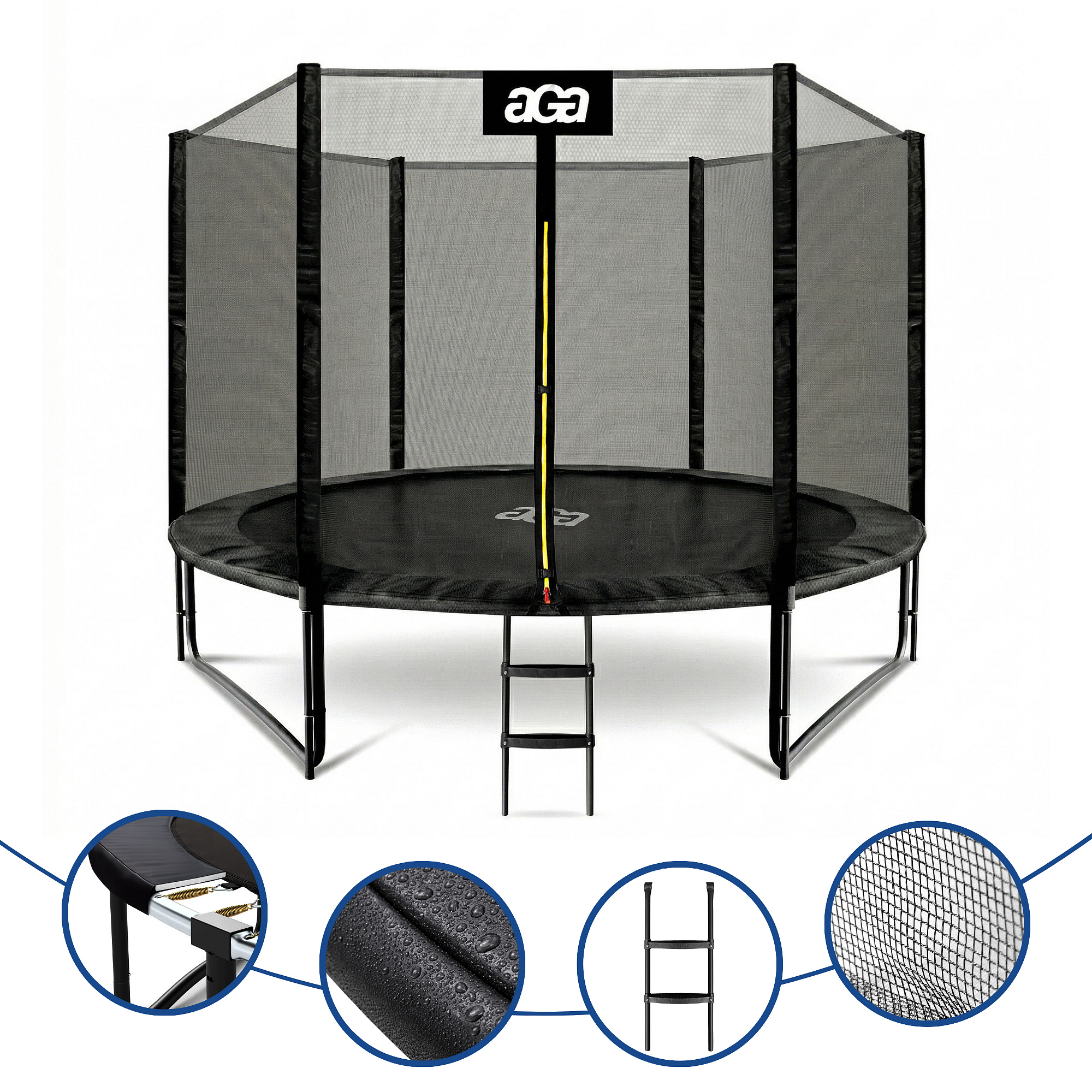 Specifications of the Aga SPORT PRO 305 cm Black Trampoline with Safety Net and Ladder.