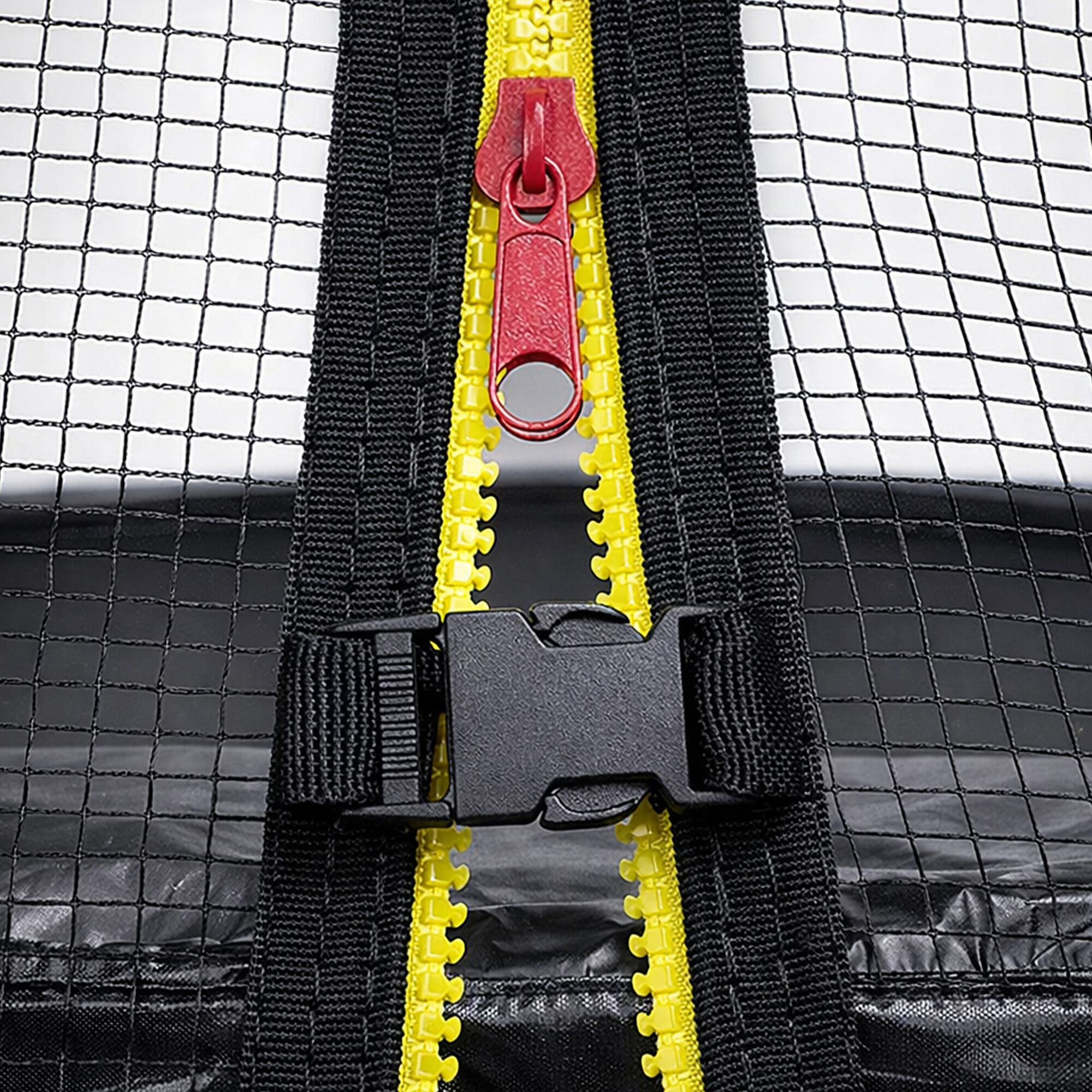 The jumping surface is made of special polypropylene fabric with a water-repellent surface and high bounce. The upper protective net has an entrance equipped with a zipper and secured with a safety lock to prevent accidental opening.