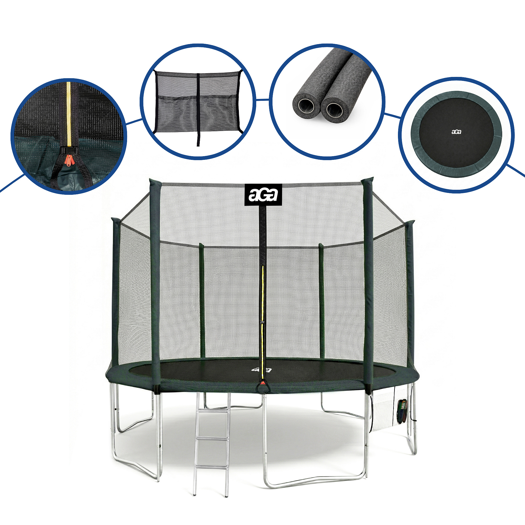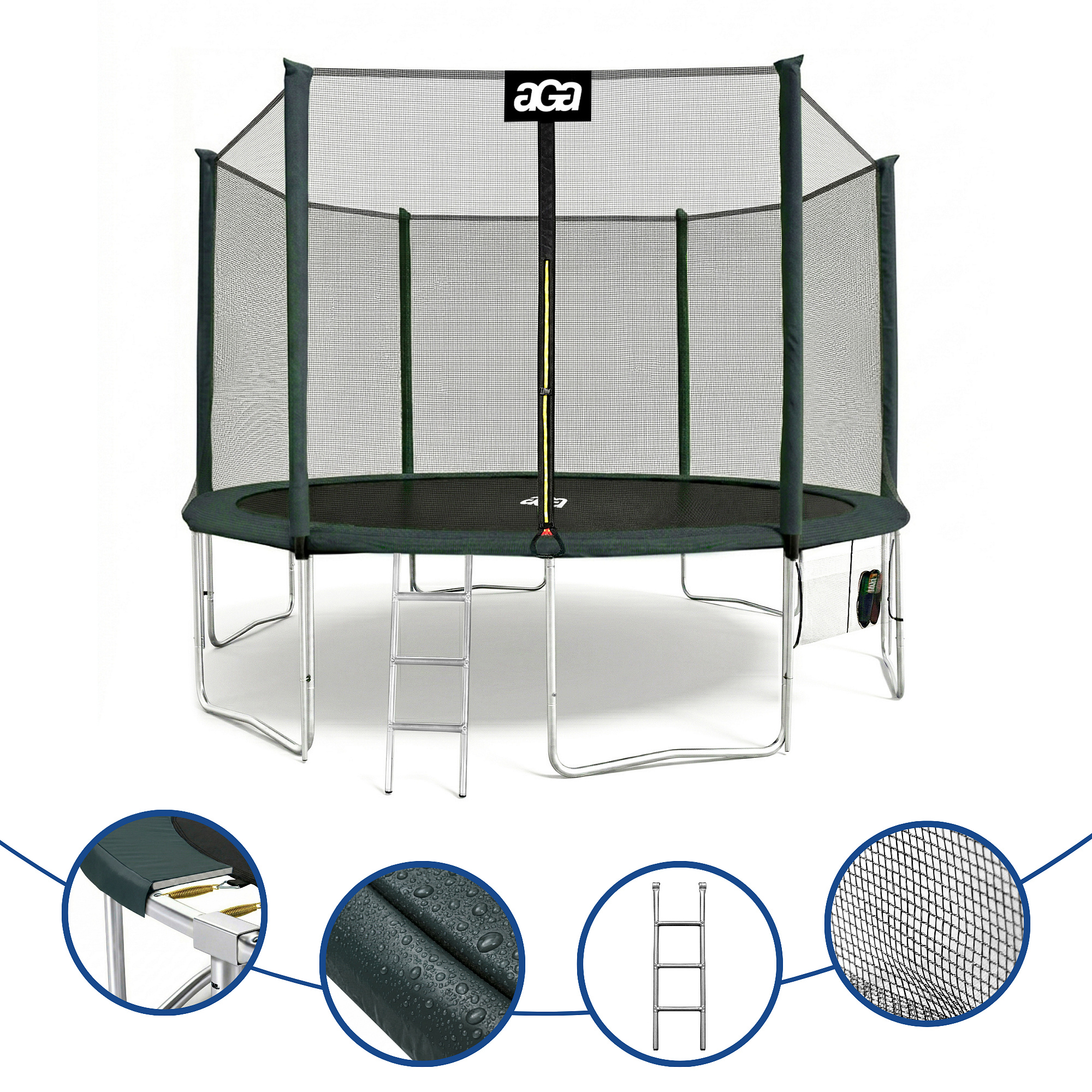 Specifications of the Aga SPORT PRO 400 cm Dark Green Trampoline with Safety Net.
