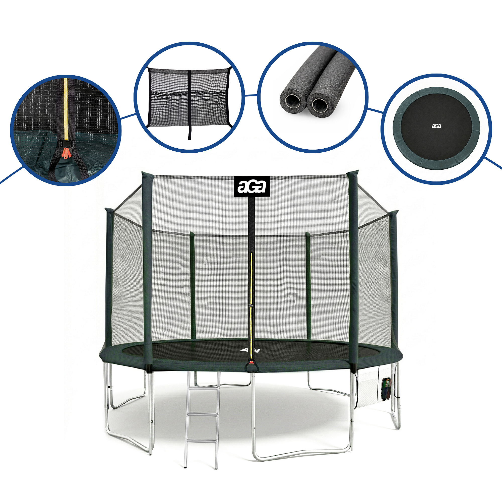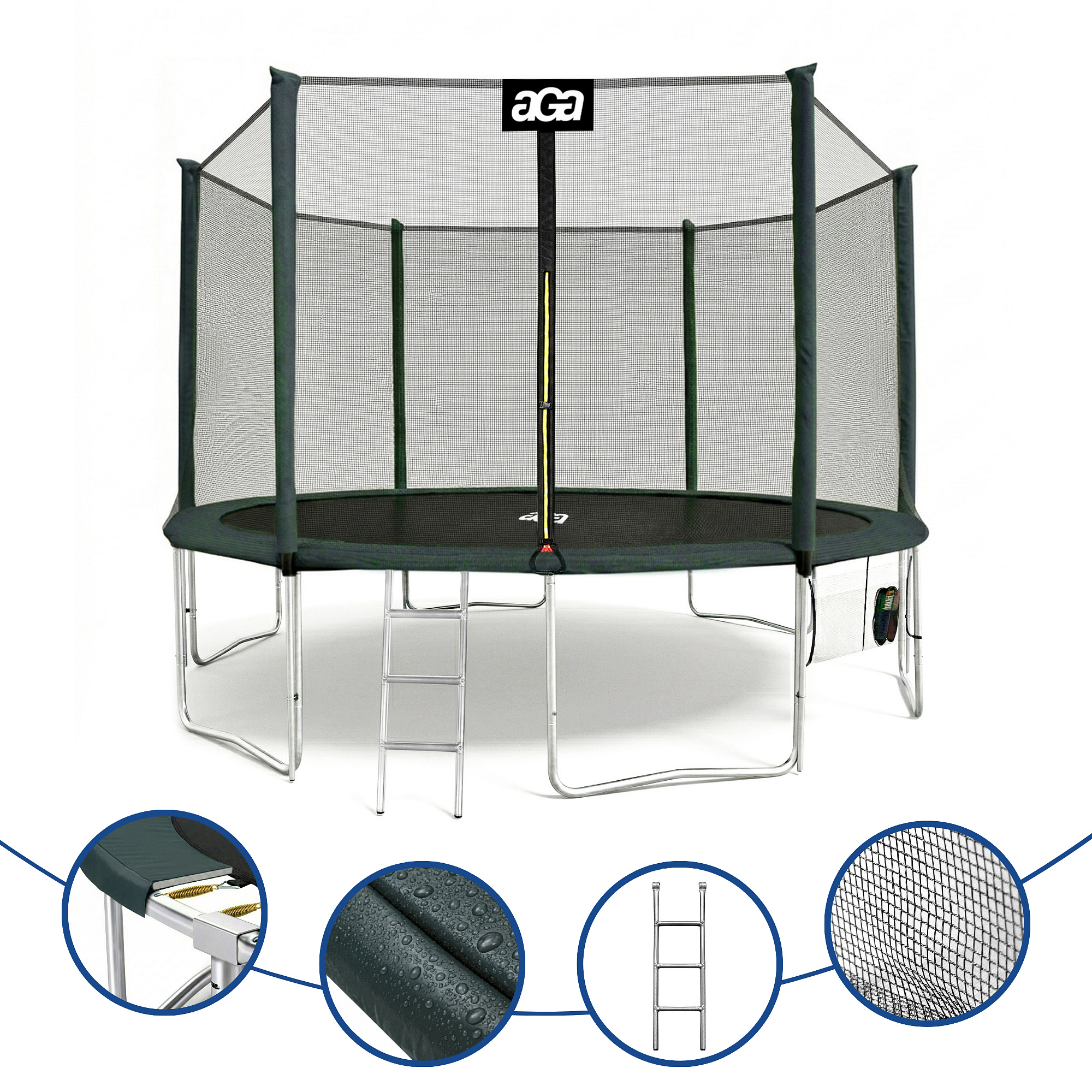 Specifications of the Aga SPORT PRO 430 cm Dark Green Trampoline with Safety Net.