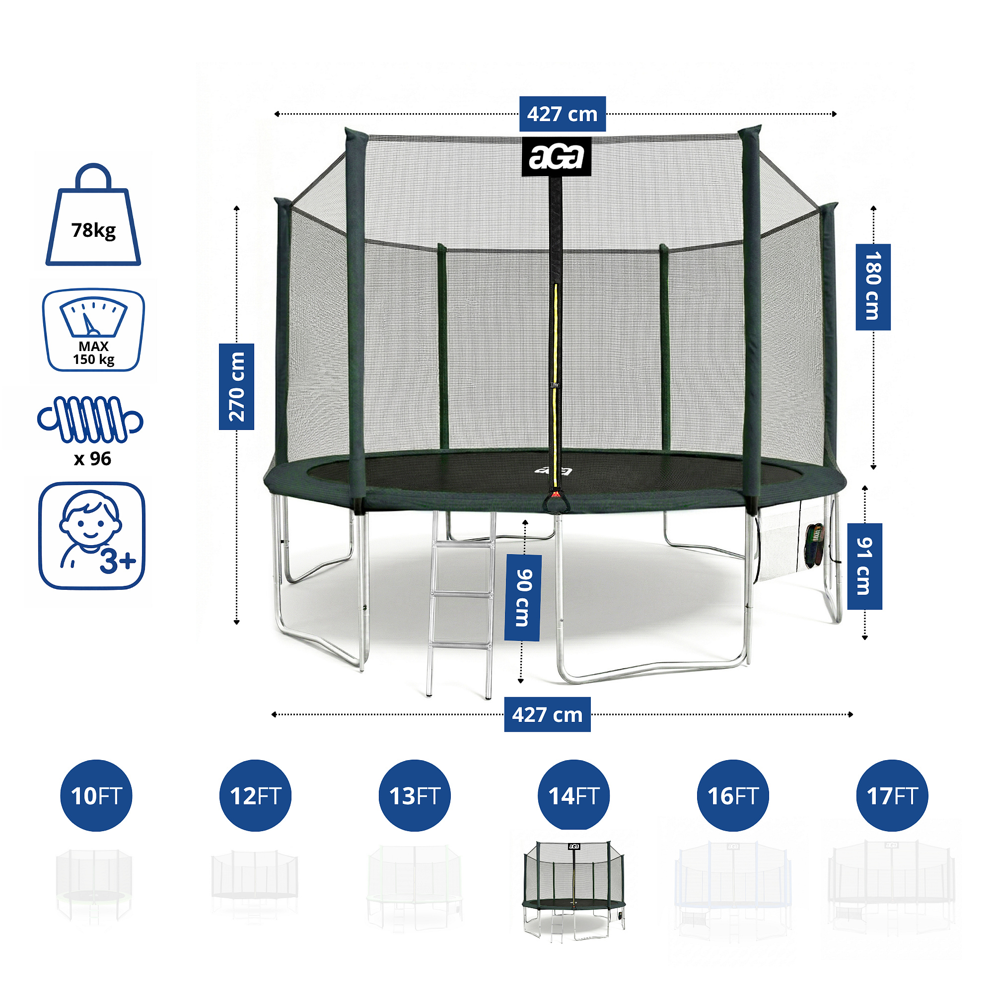 - Trampoline Diameter: 430 cm (14 ft)