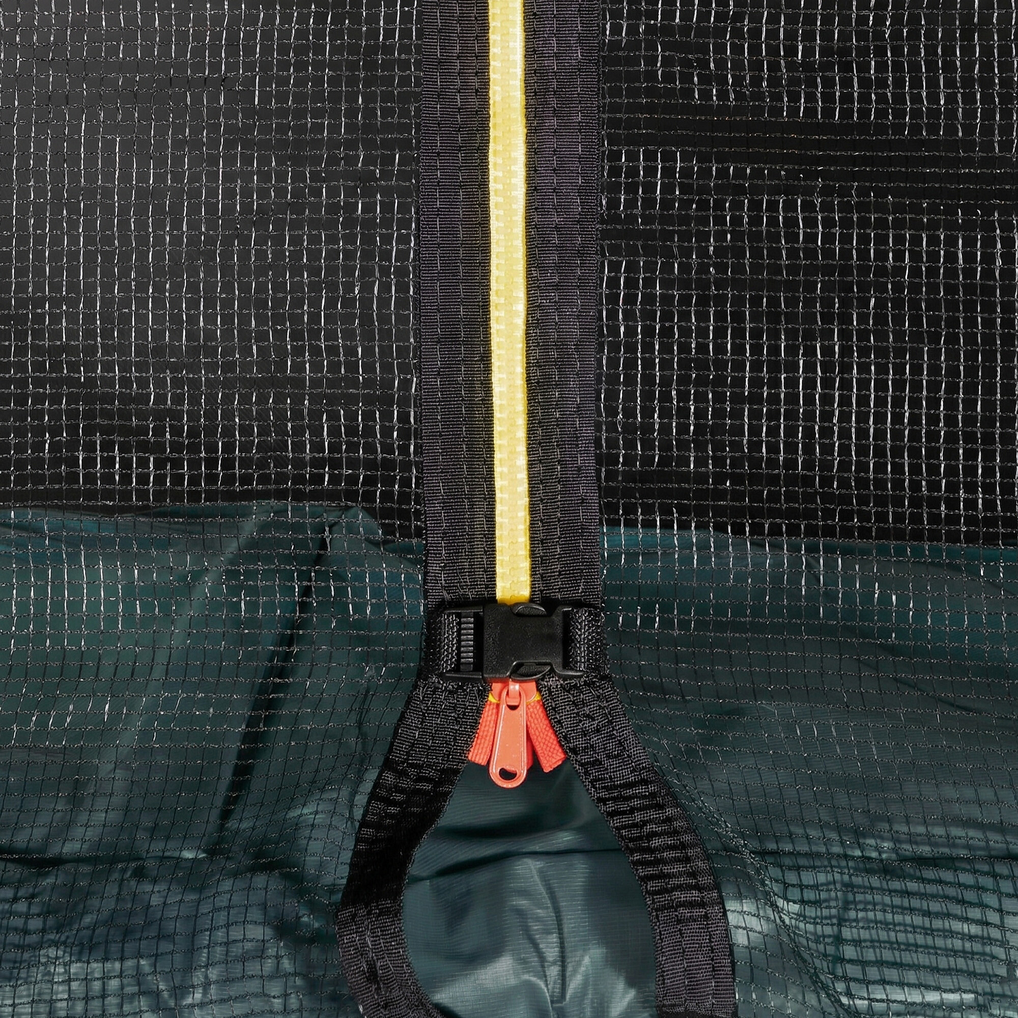 The jumping surface is made of special polypropylene fabric with a water-repellent surface and high bounce. The upper protective net has an entrance equipped with a zipper and secured with a safety lock to prevent accidental opening.