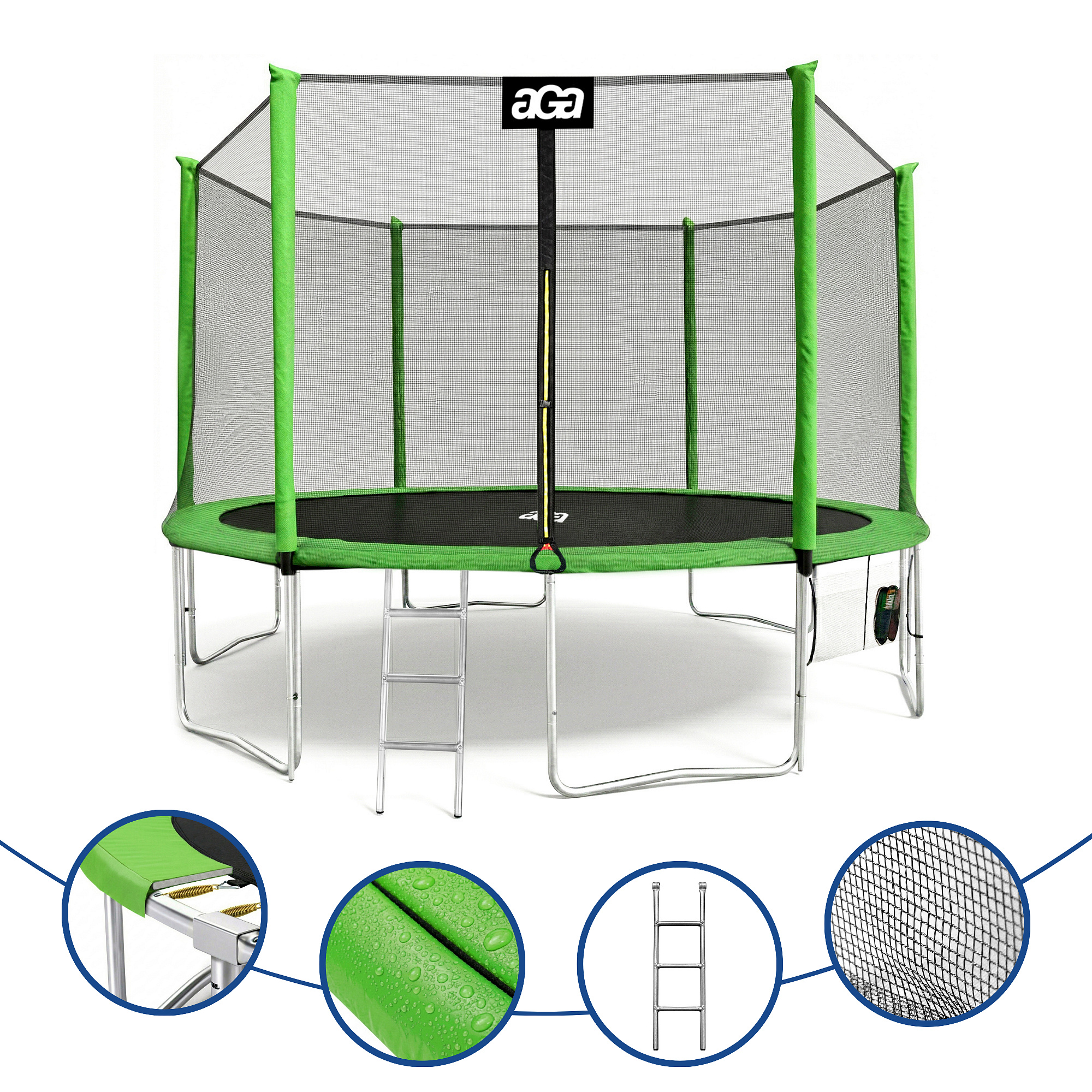 Specifications of the Aga SPORT PRO 430 cm Light Green Trampoline with Safety Net.
