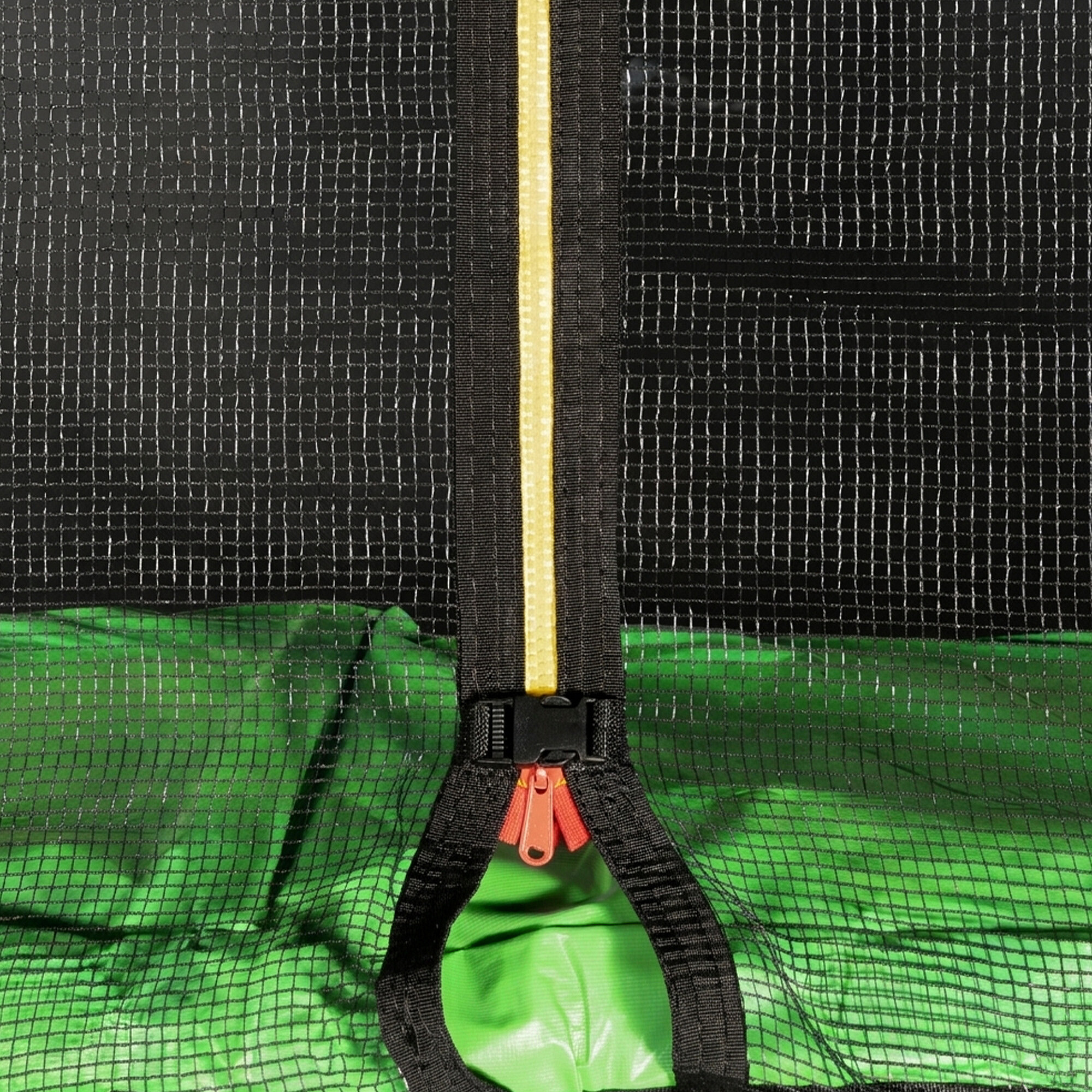 The jumping surface is made of special polypropylene fabric with a water-repellent surface and high bounce. The upper protective net has an entrance equipped with a zipper and secured with a safety lock to prevent accidental opening.