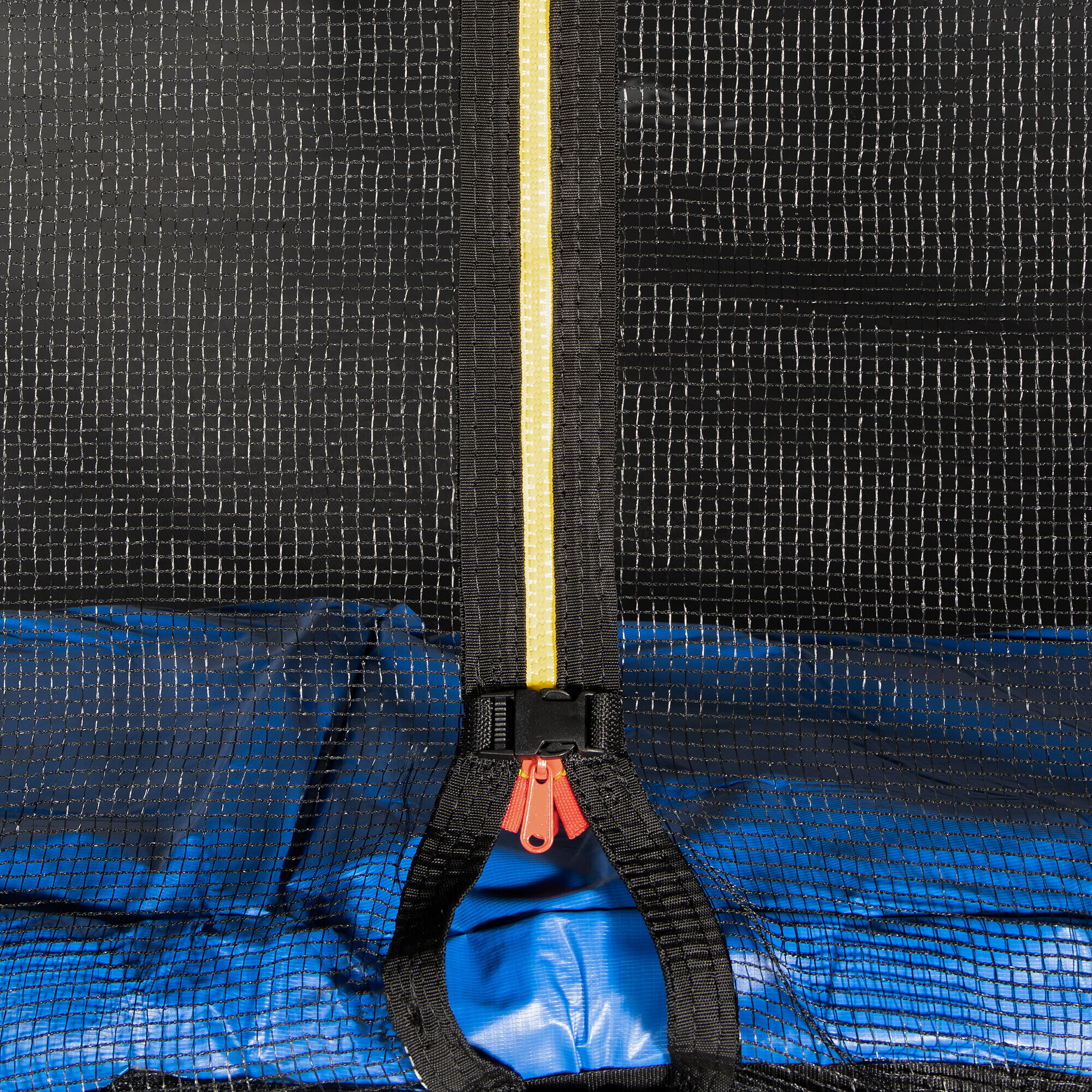 The bouncing surface is made of special polypropylene fabric with a water-repellent finish and high bounce. The upper protective net has an entrance equipped with a zipper and secured with a safety lock to prevent accidental opening.