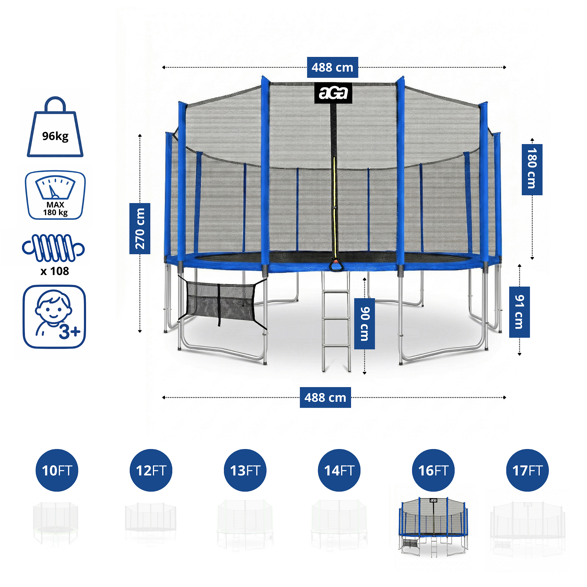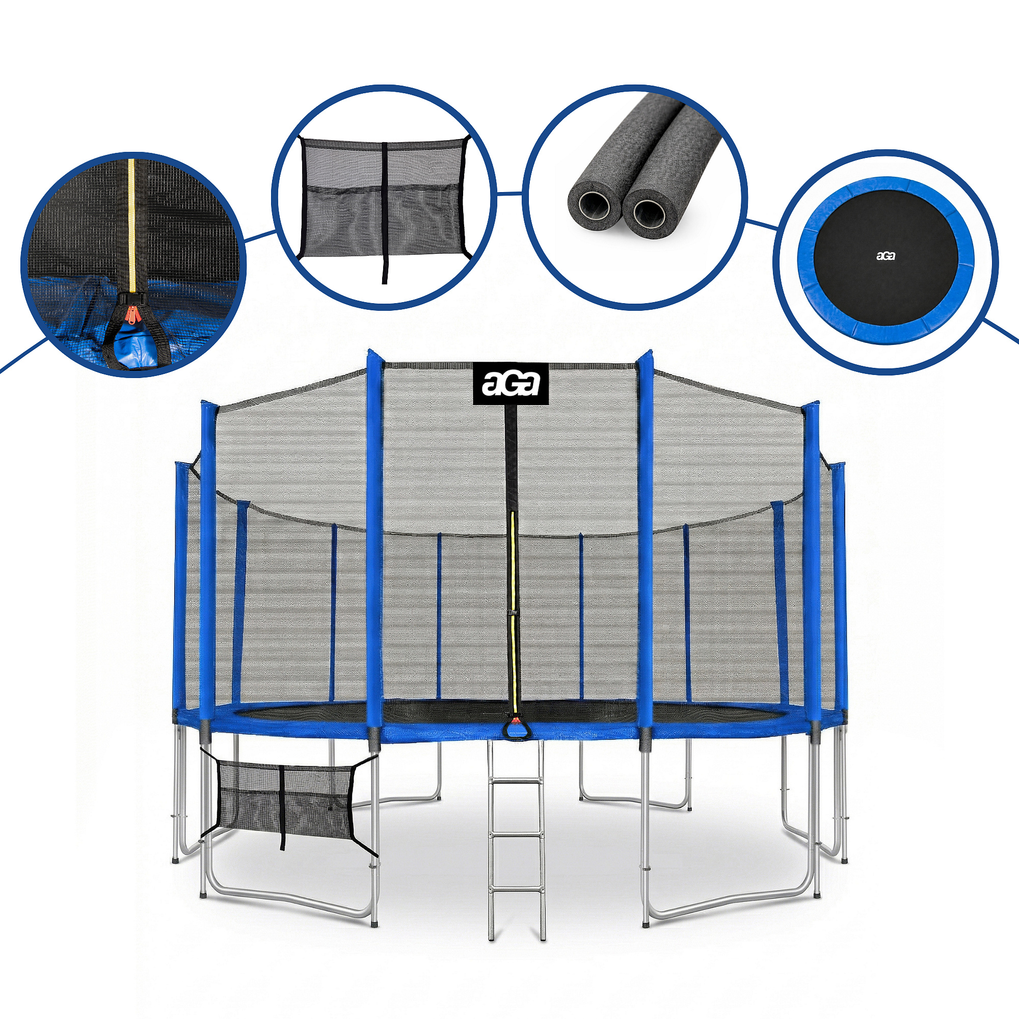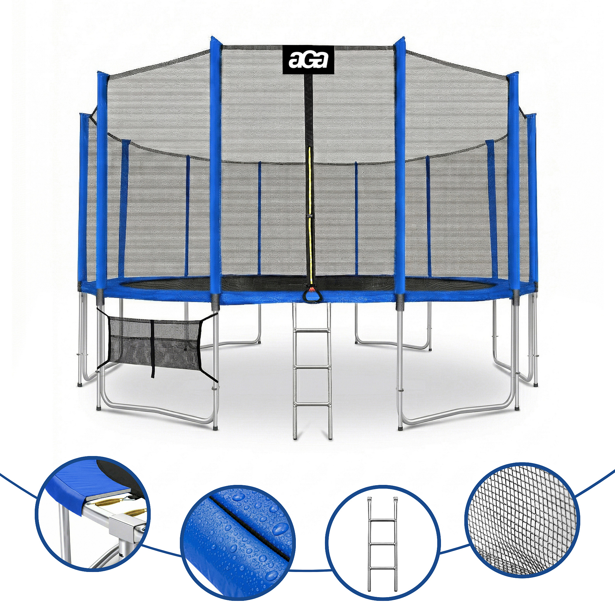 Specifications of the Aga SPORT PRO 488-500 cm Blue Trampoline with Safety Net.